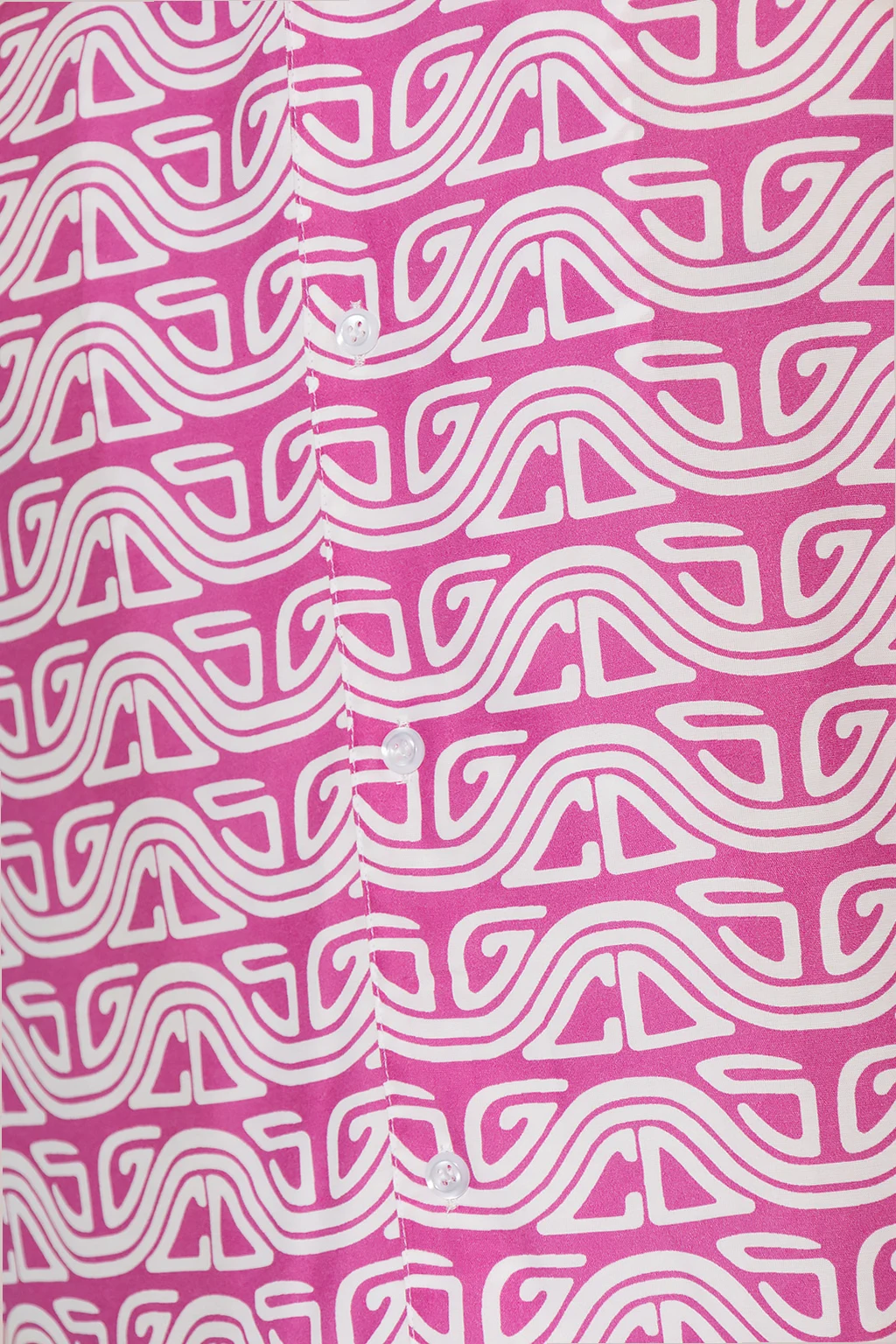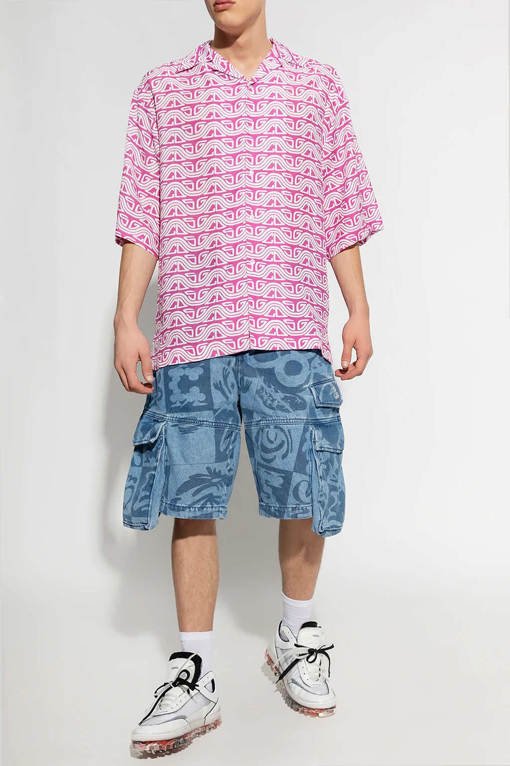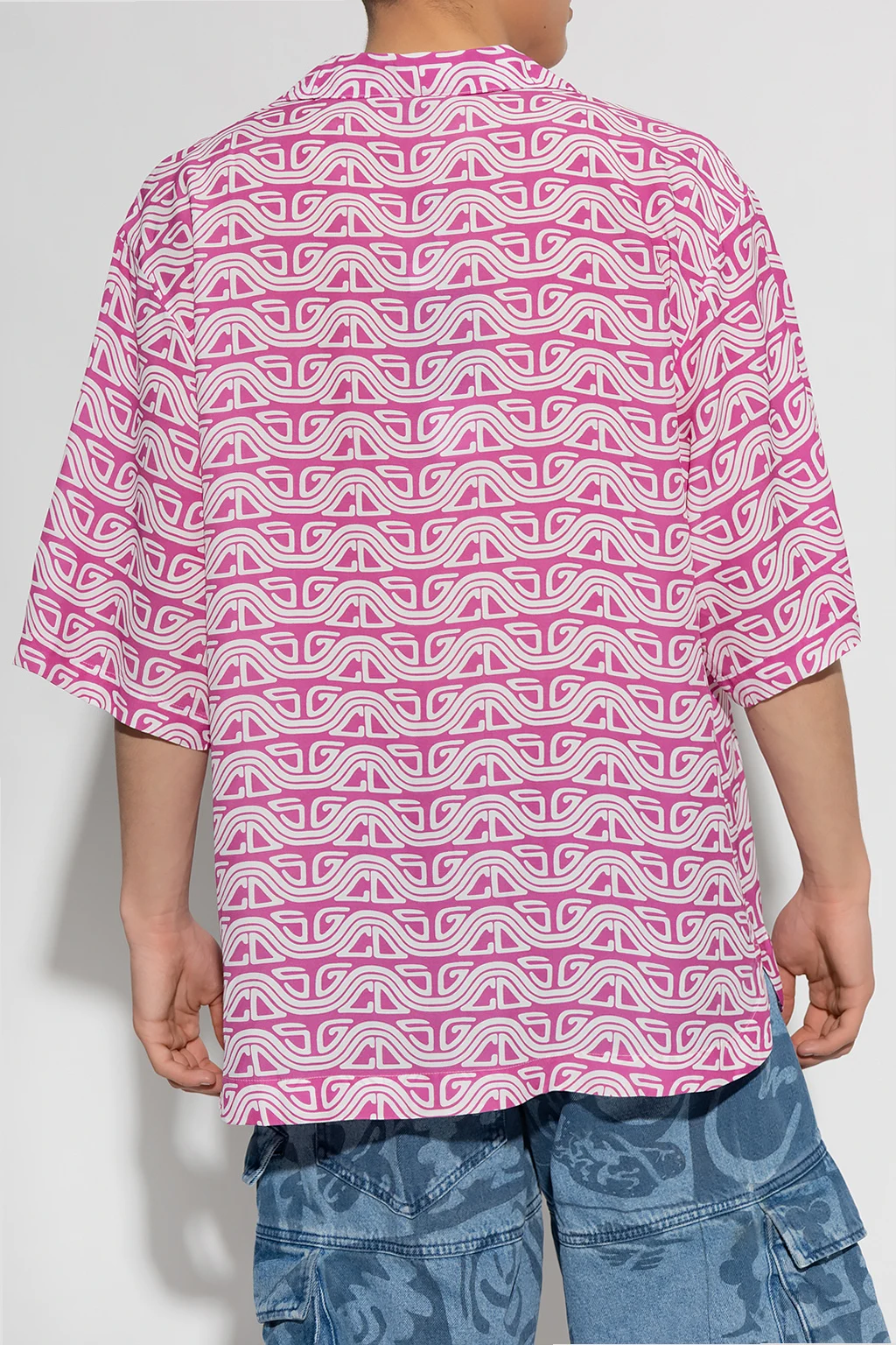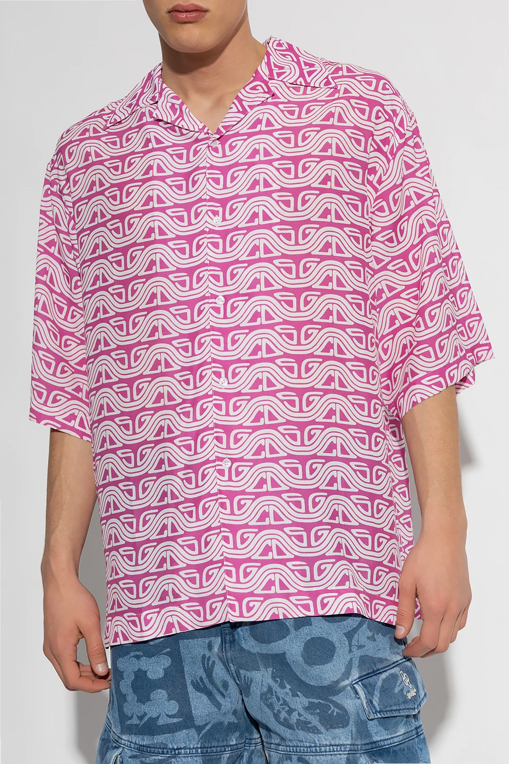 Różowo-biała koszula typu ‘oversize’ GCDS. Zapinana na guziki. Ozdobiona wzorem z motywem logo. Krótkie, luźne rękawy.