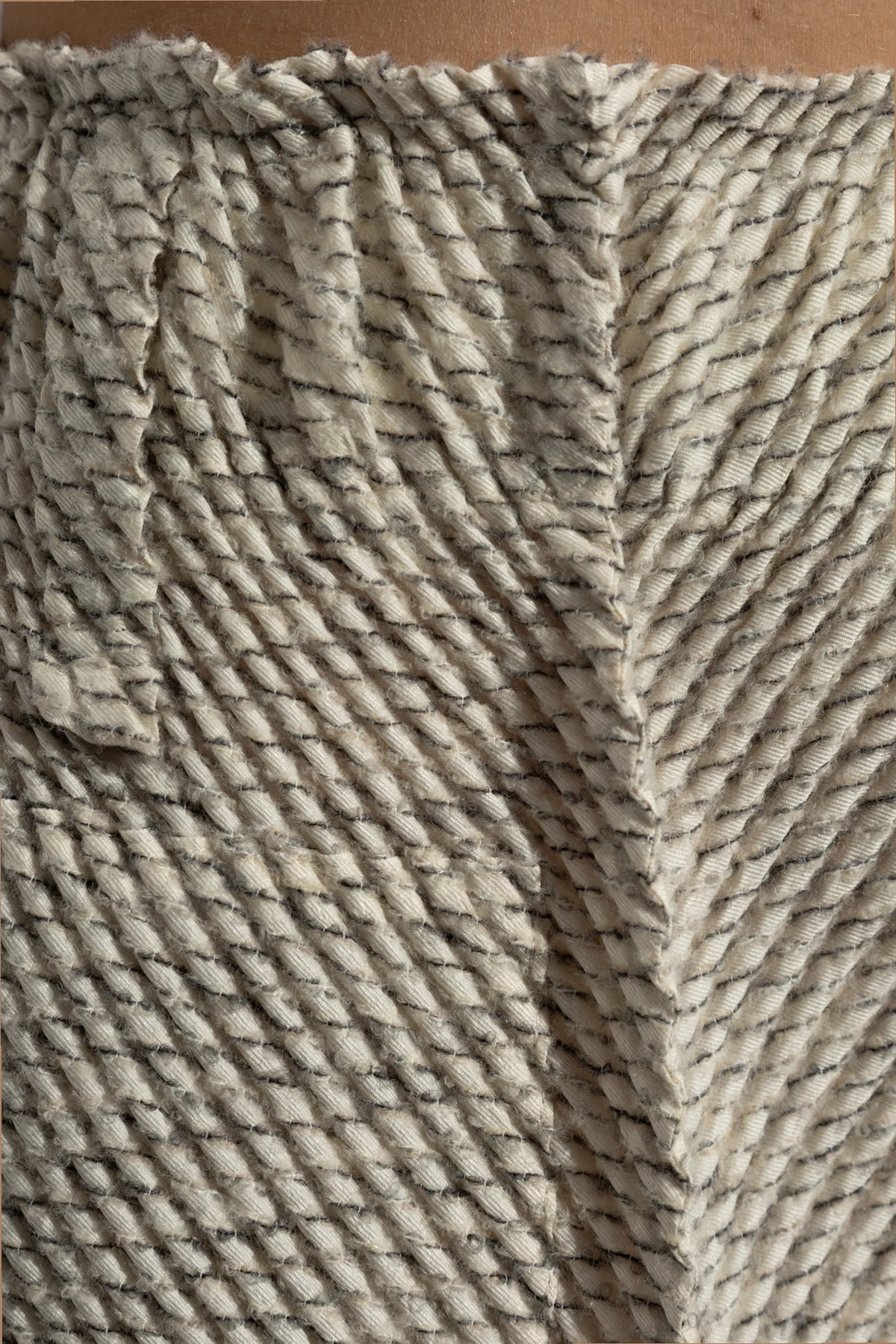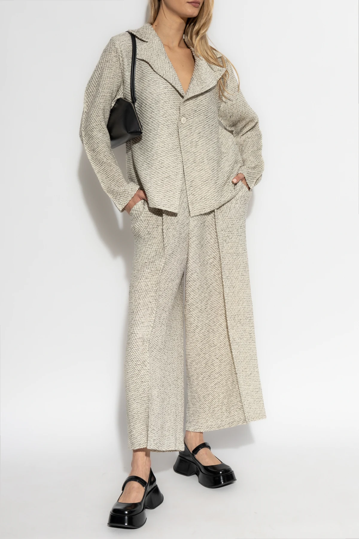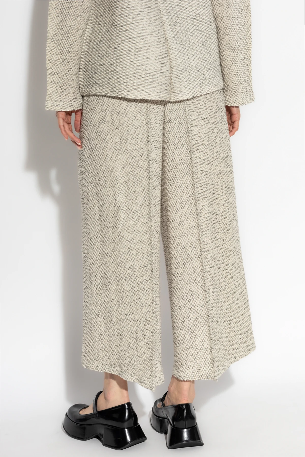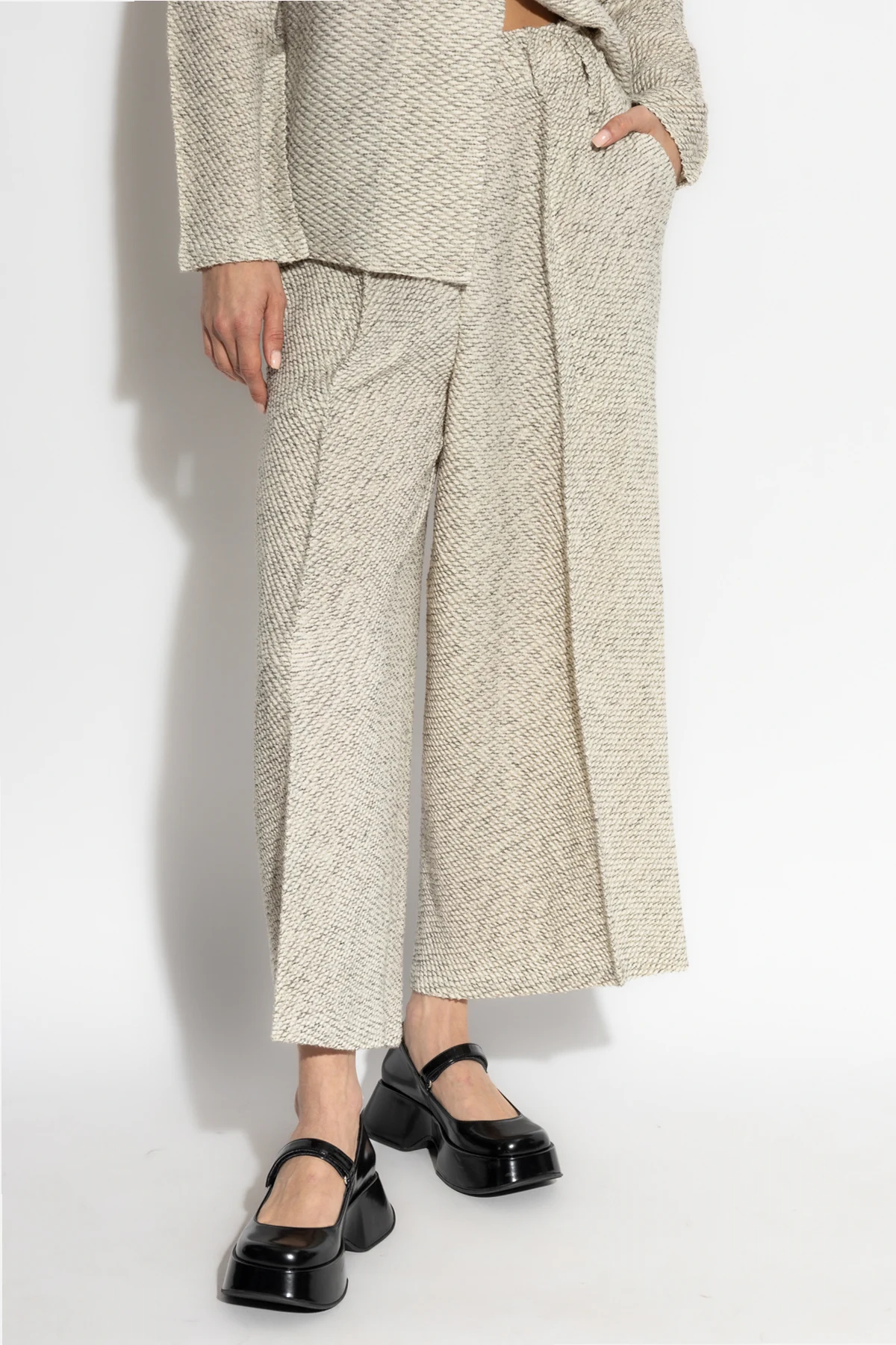Wykonane z innowacyjnych materiałów, spodnie łączą poliester, wełnę i nylon, co zapewnia lekkość i wytrzymałość. Delikatny, teksturowany splot w kremowo-szarych odcieniach oraz drobny, diagonalny wzór podkreślają ich klasyczny urok. Elastyczna talia dodaje komfortu noszenia, a brak widocznych kieszeni i zapięć z przodu zachowuje minimalistyczny design.