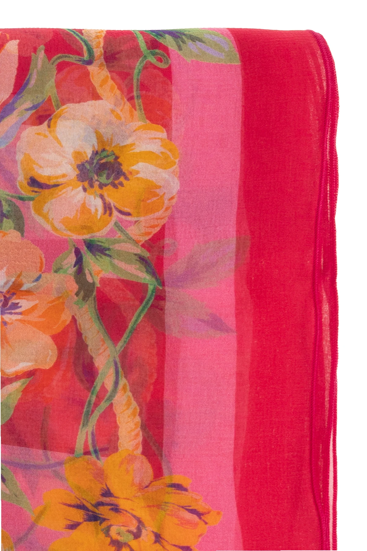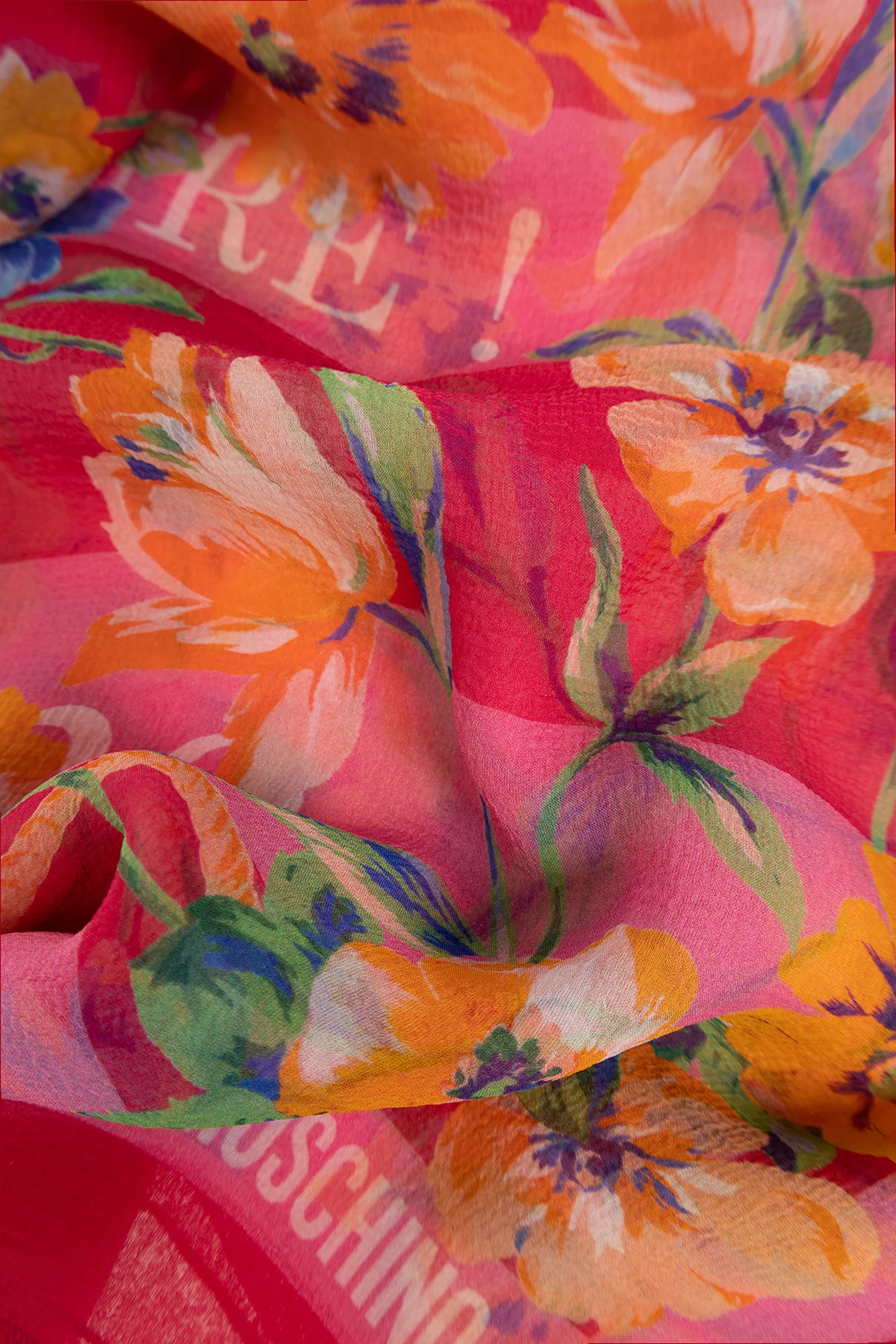 Różowy, jedwabny szal Moschino. Ozdobiony kolorowym nadrukiem z motywem kwiatowym i logo.