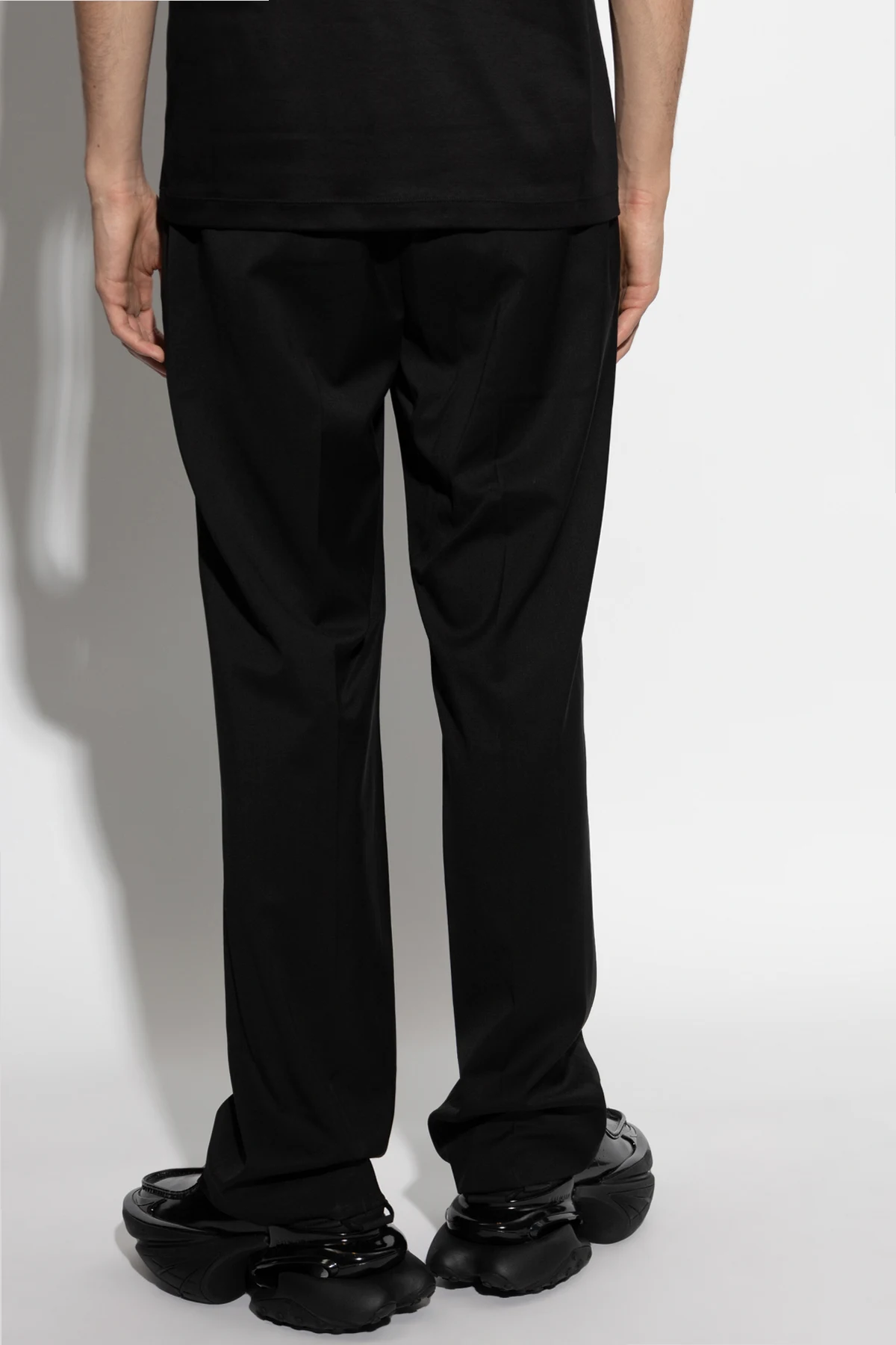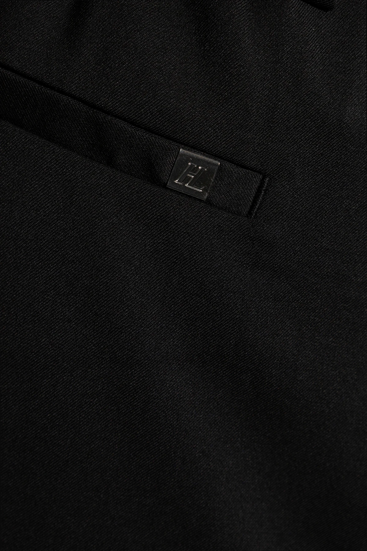 Charakteryzują się klasycznym krojem z wyraźnym kantem, co nadaje im formalny i elegancki wygląd. Prosty fason z lekko luźnym dopasowaniem oraz subtelne metalowe logo z tyłu dodają wyrafinowania i świadczą o ekskluzywności marki. Dominujący czarny kolor czyni je uniwersalnym elementem garderoby, który doskonale sprawdzi się na każdą okazję.