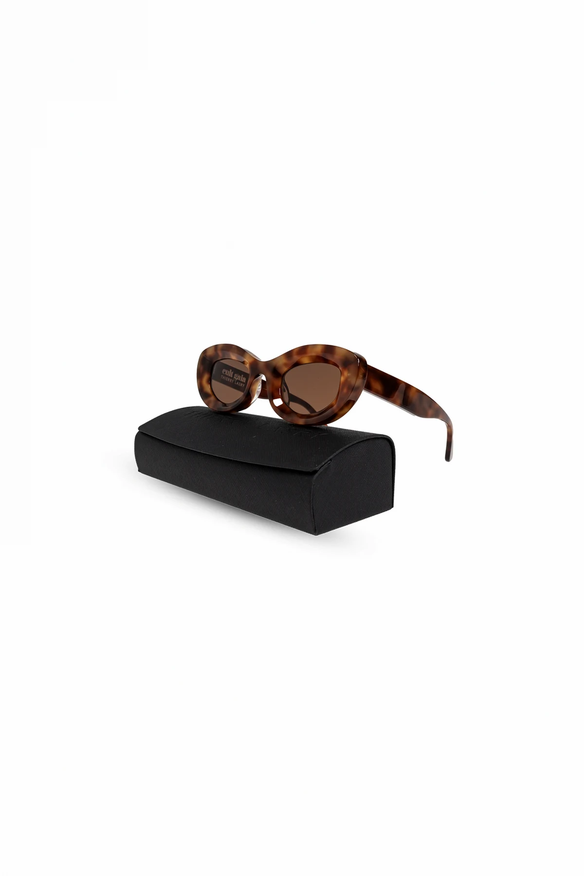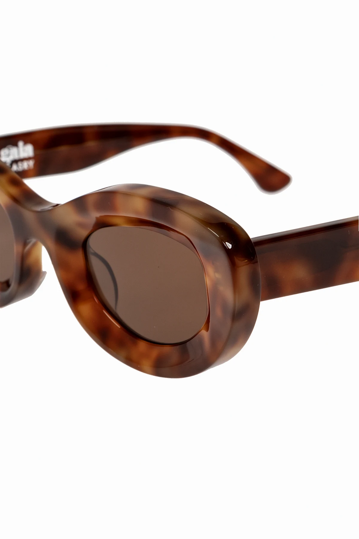 Na wewnętrznej stronie zauszników widoczny jest napis „Thierry Lasry x Cult Gaia”, co podkreśla prestiżowy charakter produktu. Ciemnobrązowe soczewki harmonizują z oprawkami, oferując pełną ochronę przed promieniowaniem UV.