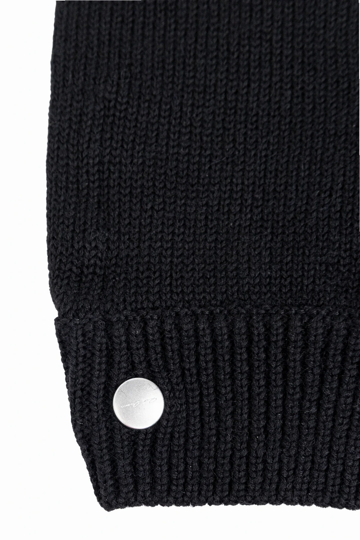 Unikatowy charakter rękawiczek podkreśla drobny, lecz wyrazisty detal – dekoracyjny element w postaci małego, okrągłego guzika (lub nap podobnego do guzika) umieszczony w okolicy nadgarstka. Kontrastujący z głęboką czerń wełny jasny, prawdopodobnie srebrny lub biały guzik, dodaje im subtelnego, lecz zauważalnego uroku. Niebanalny akcent ten, oprócz walorów estetycznych, może także pełnić funkcję praktyczną, umożliwiając regulację szerokości mankietu.