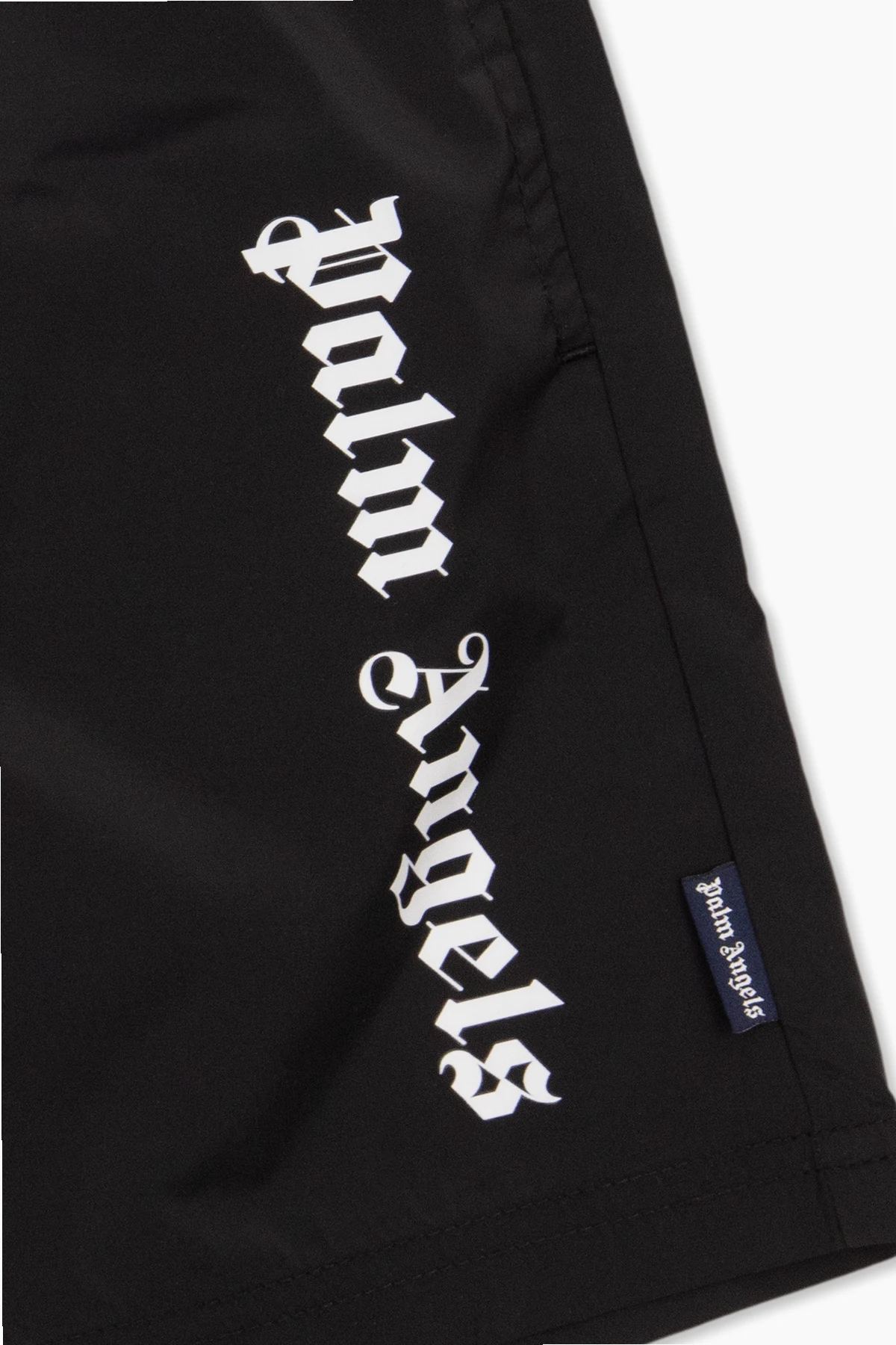 Czarne szorty kąpielowe Palm Angels Kids. W pasie wszyta guma. Z przodu ozdobione nadrukowanym białym logo. Trzy kieszenie: dwie z przodu i jedna z tyłu z patką.