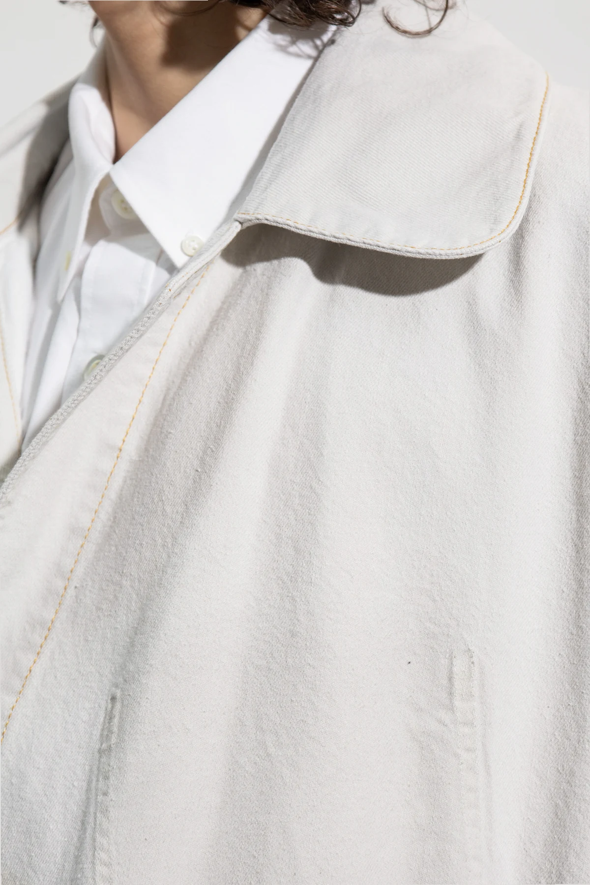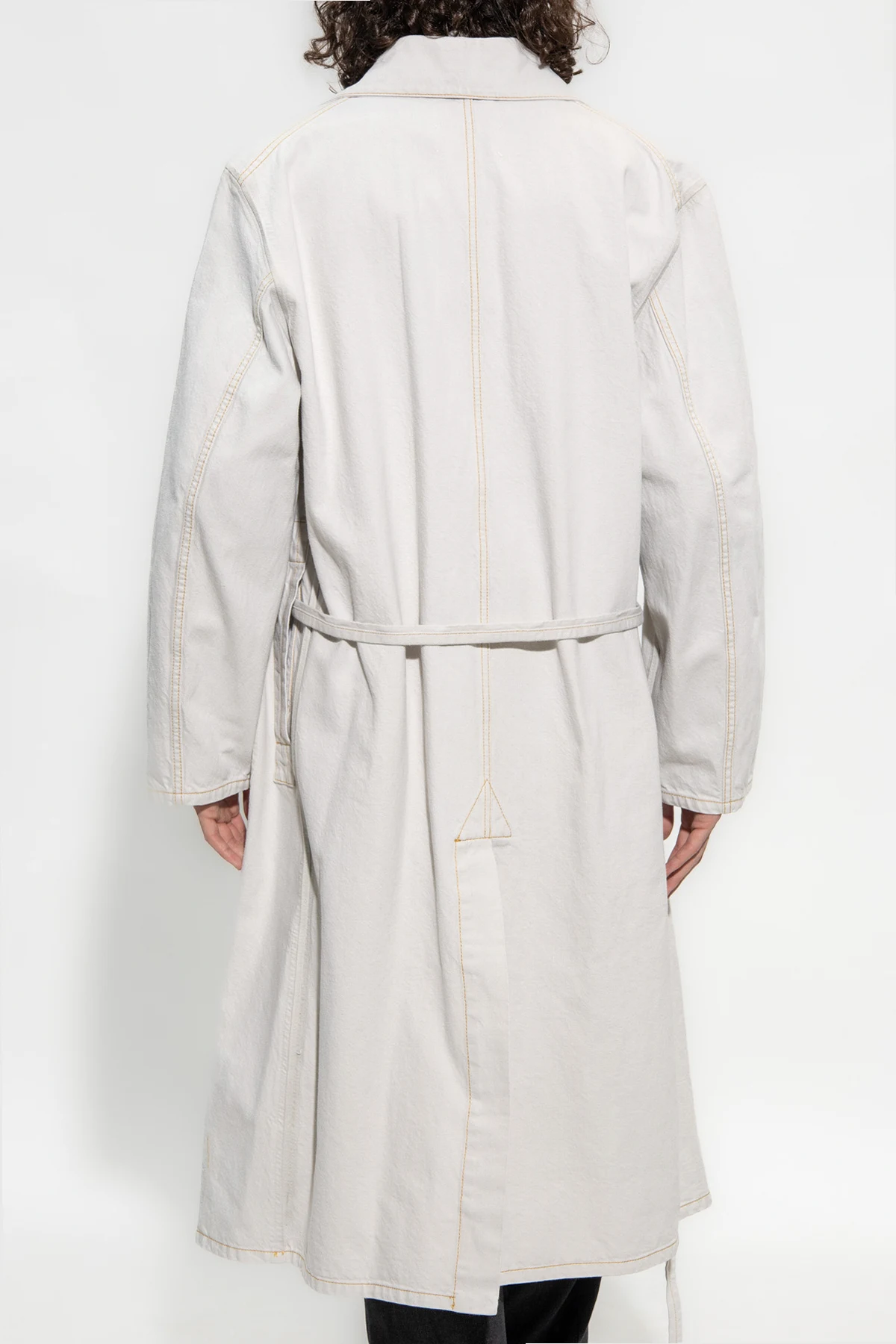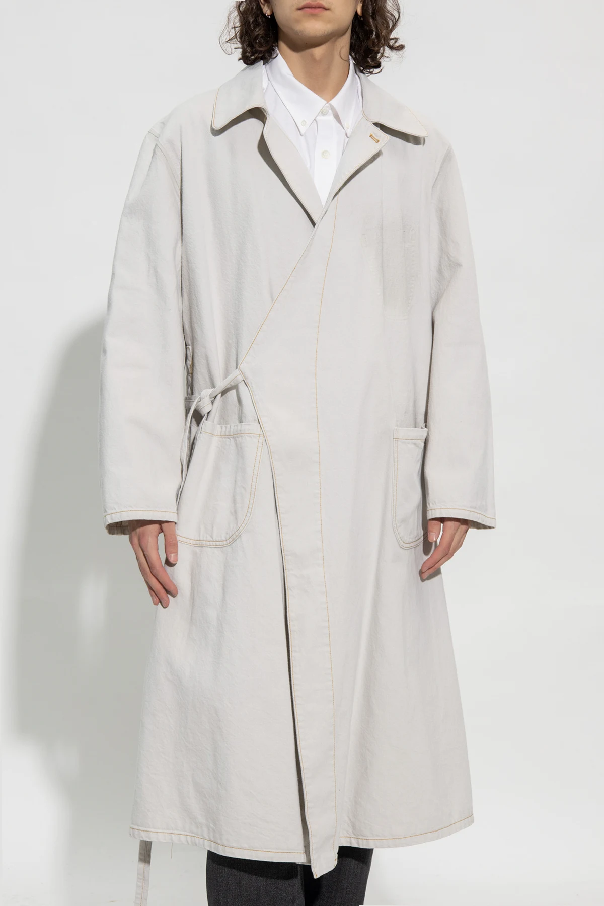 Jasnoszary, jeansowy płaszcz Maison Margiela. Dekolt z zapięciem na guzik. Kopertowe wiązanie trokami. Z tyłu wyszyte logo i pojedyncze rozcięcie. Dwie wsuwane kieszenie. Długie rękawy.