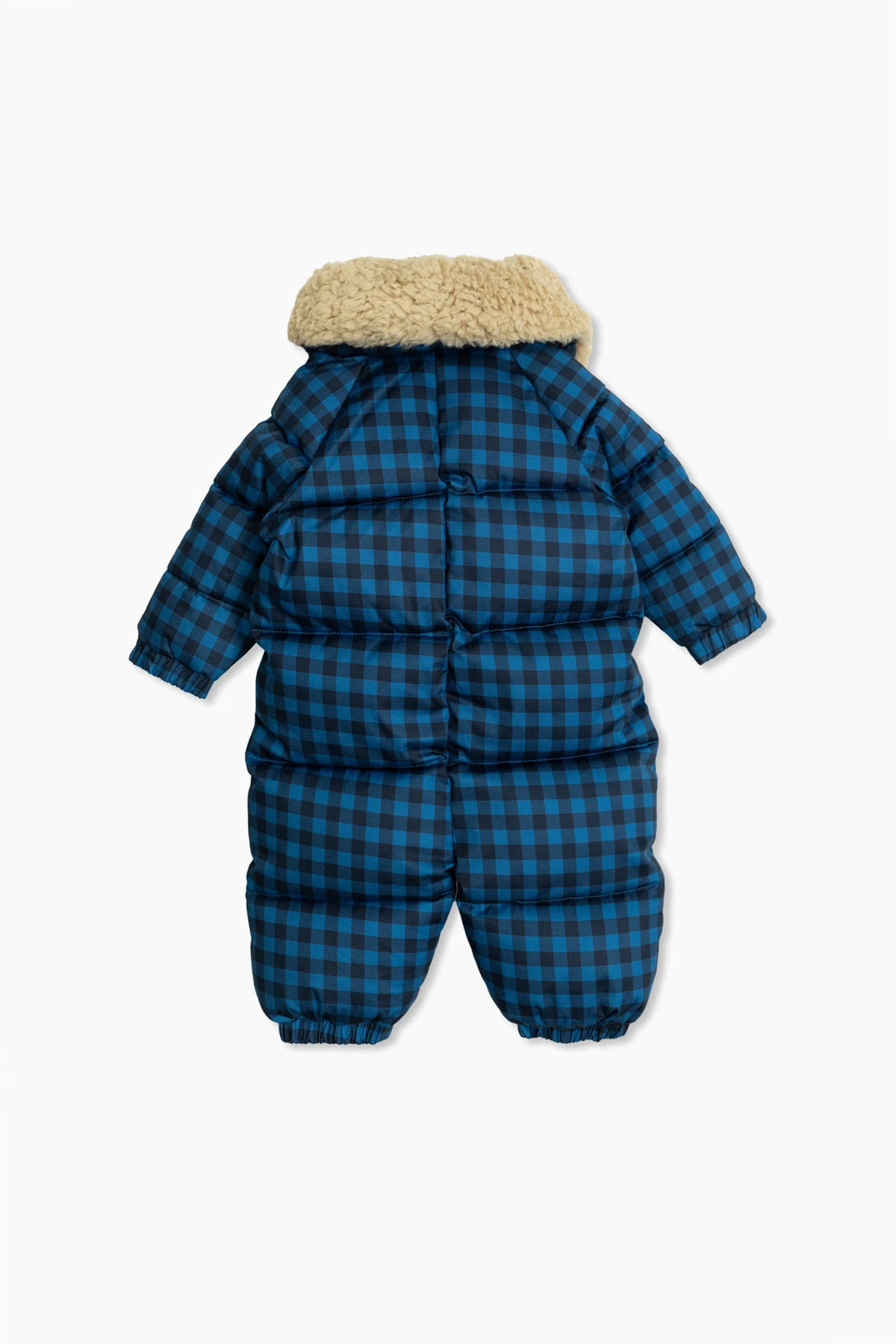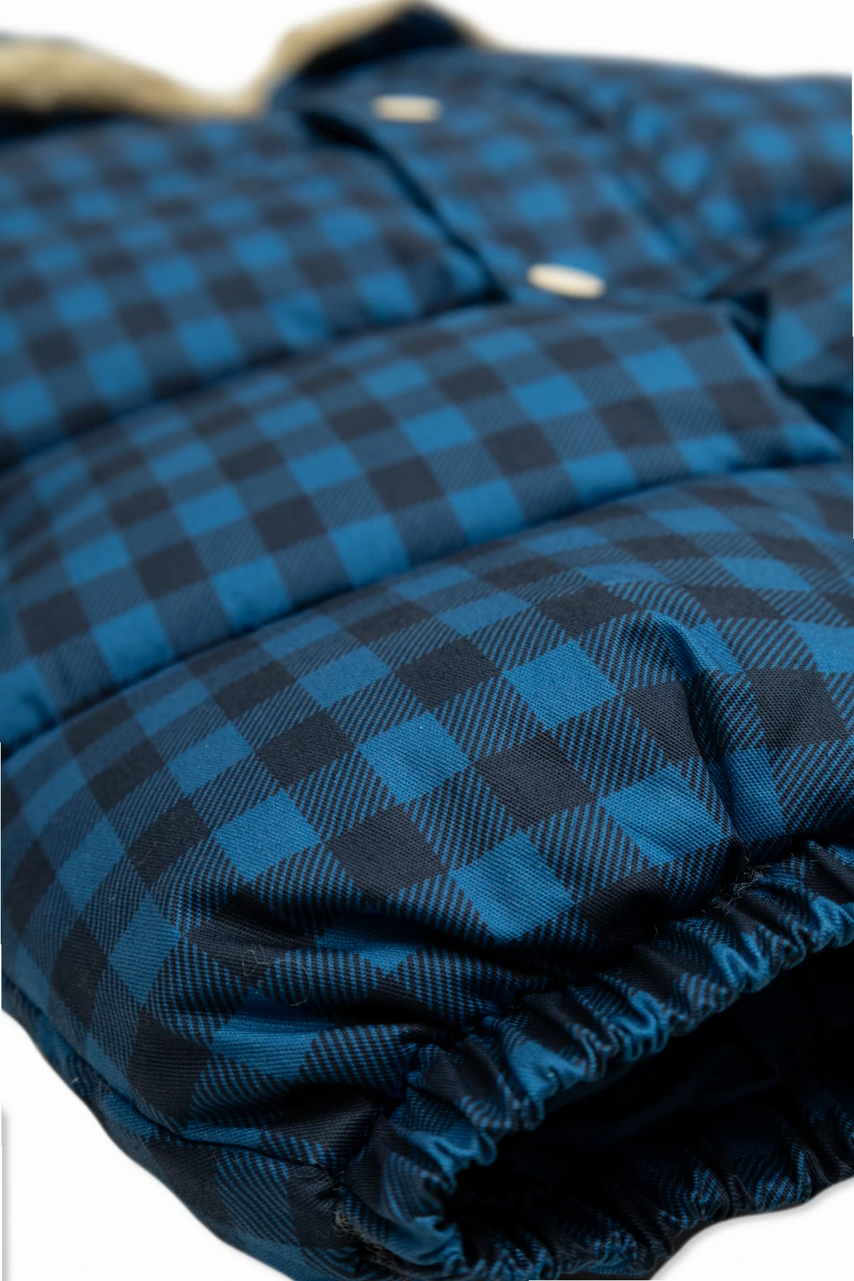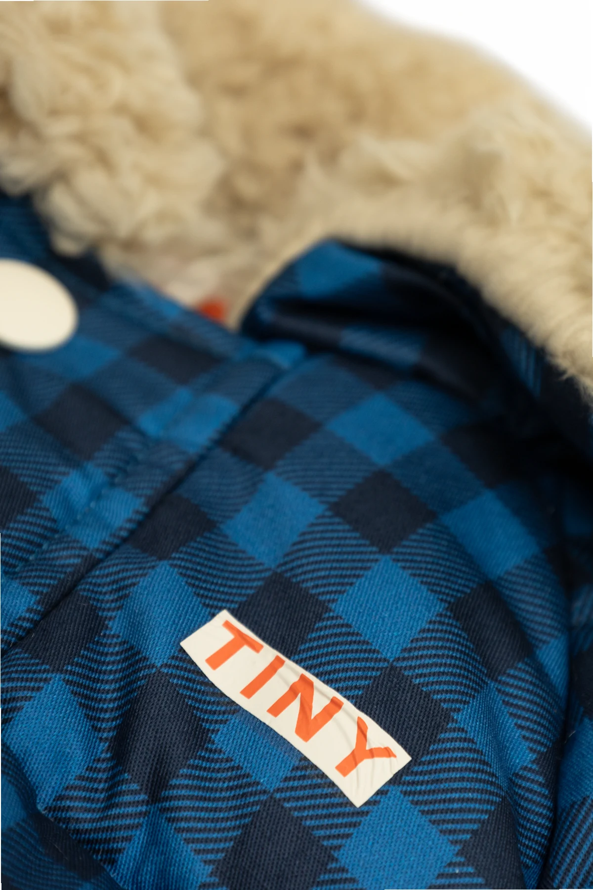 Granatowy wzór w kratę, przeplatany odcieniami czerni, nadaje kombinezonowi wyjątkowego charakteru. Długie rękawy i nogawki zakończone elastycznymi mankietami, a także praktyczne zapięcie na białe, okrągłe guziki zatrzaskowe, zapewniają wygodę użytkowania. Dodatkowo, na przodzie umieszczono urokliwą naszywkę z napisem "TINY".