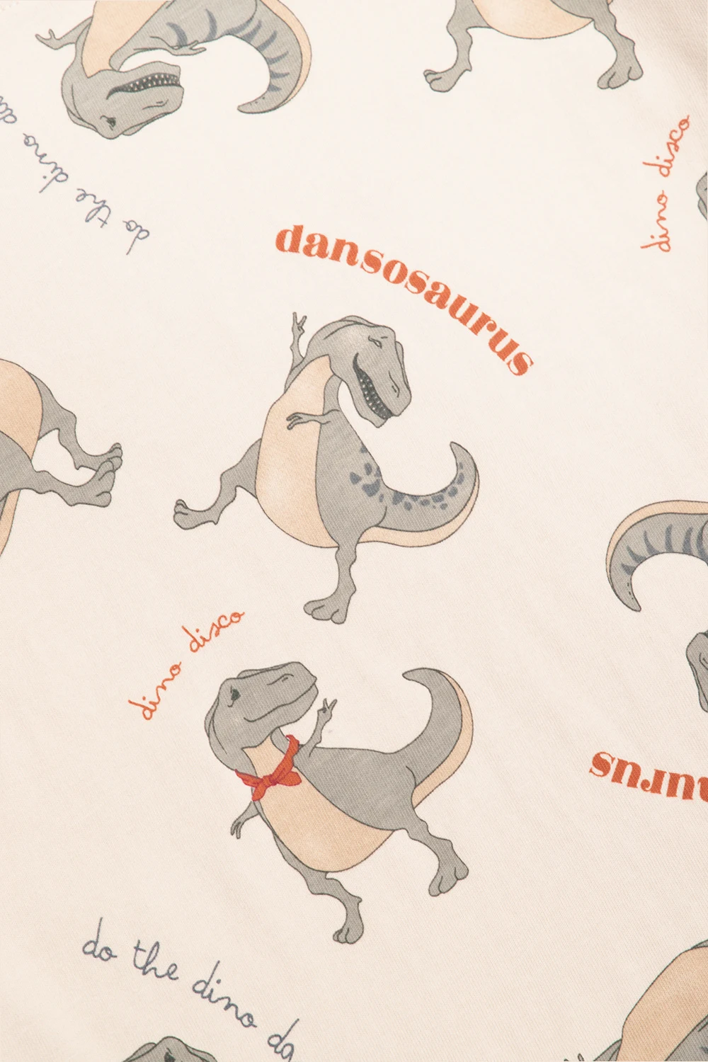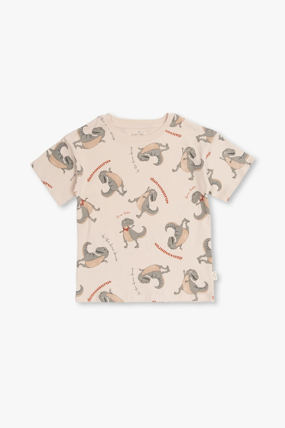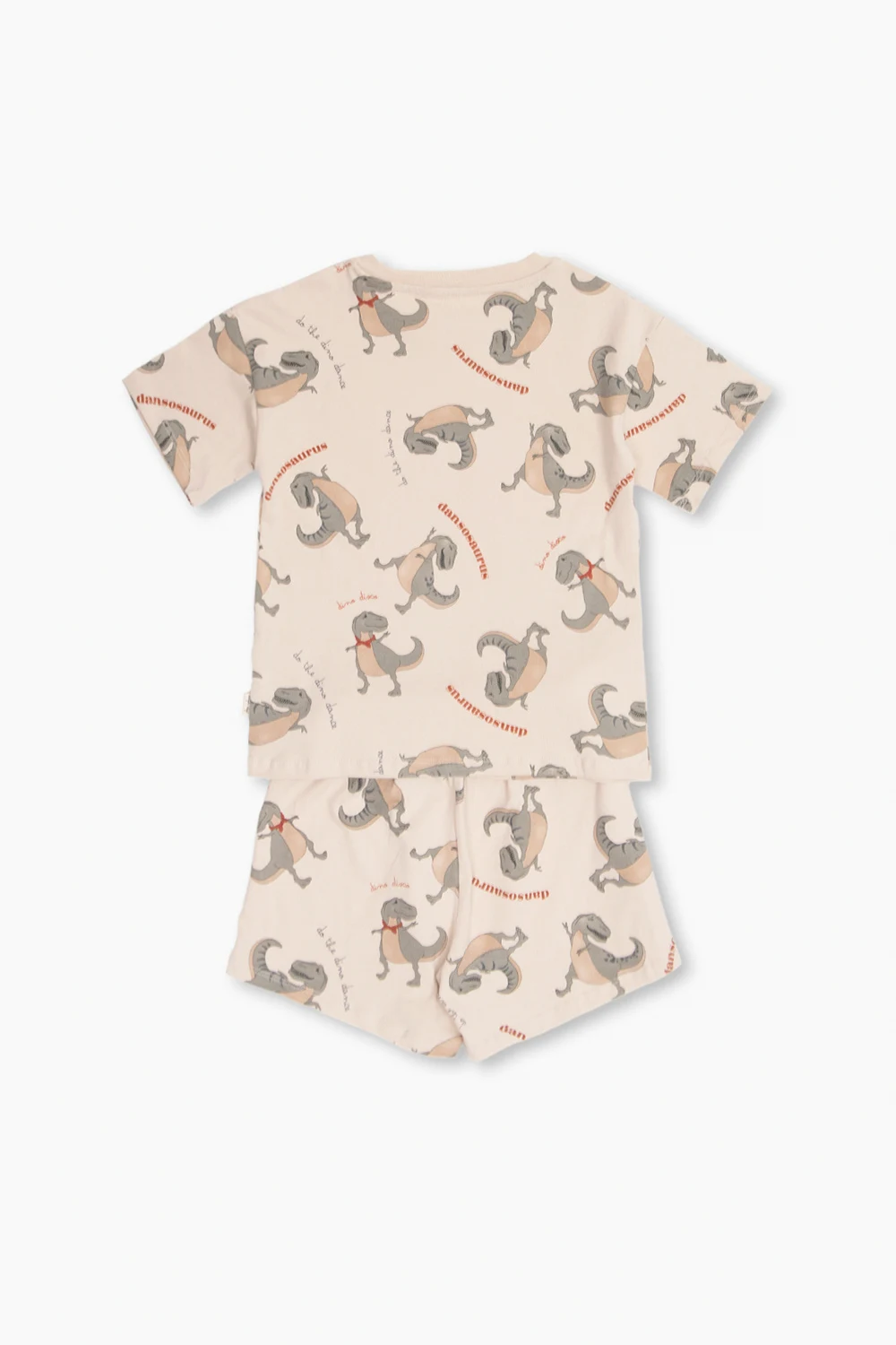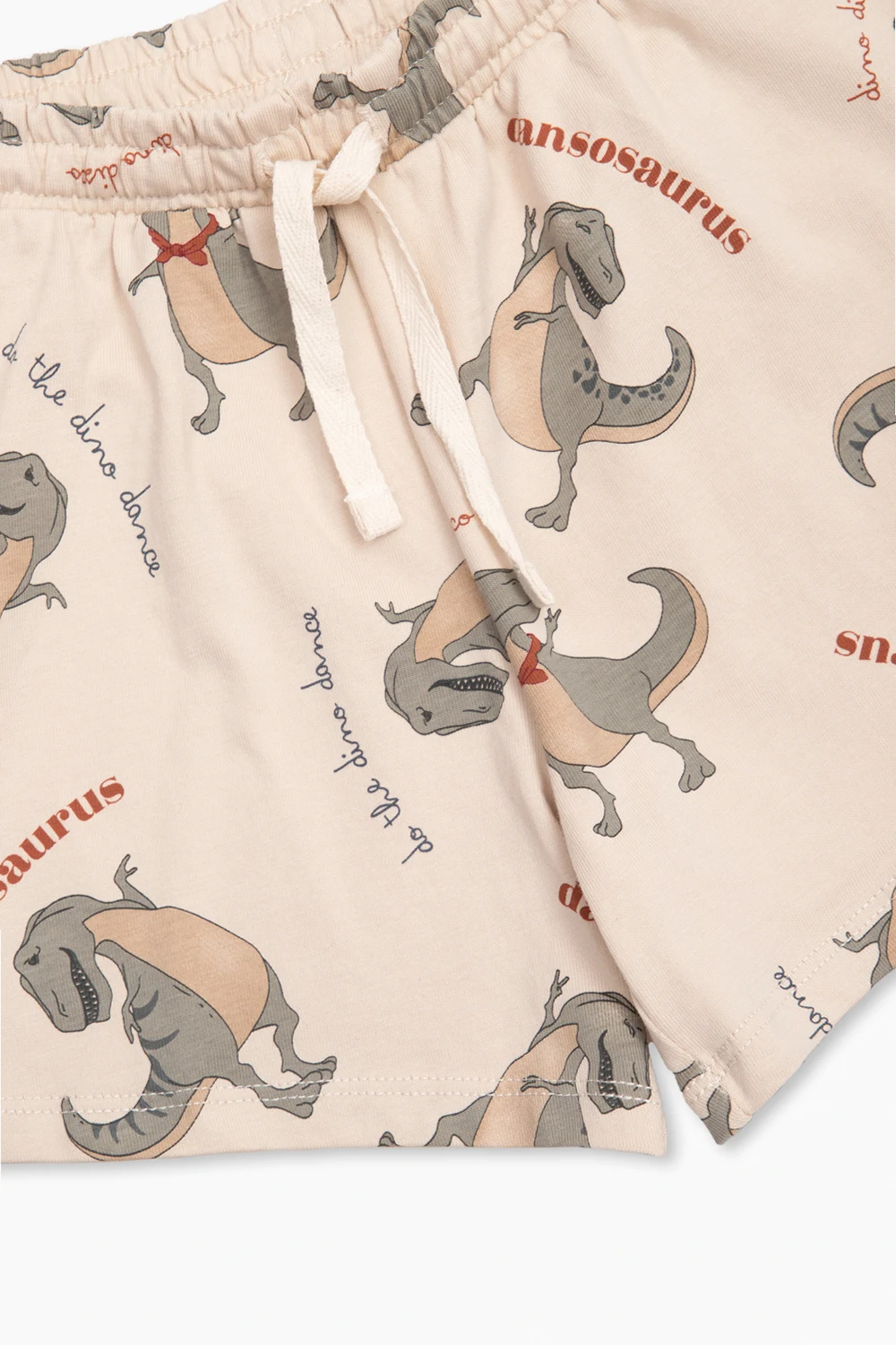 Jasnobeżowy zestaw: t-shirt i szorty Konges Slojd. Wykonany z bawełny organicznej. Ozdobiony kolorowym nadrukiem z motywem dinozaura. T-shirt z okrągłym dekoltem i krótkimi rękawami. Szorty z gumą w pasie.