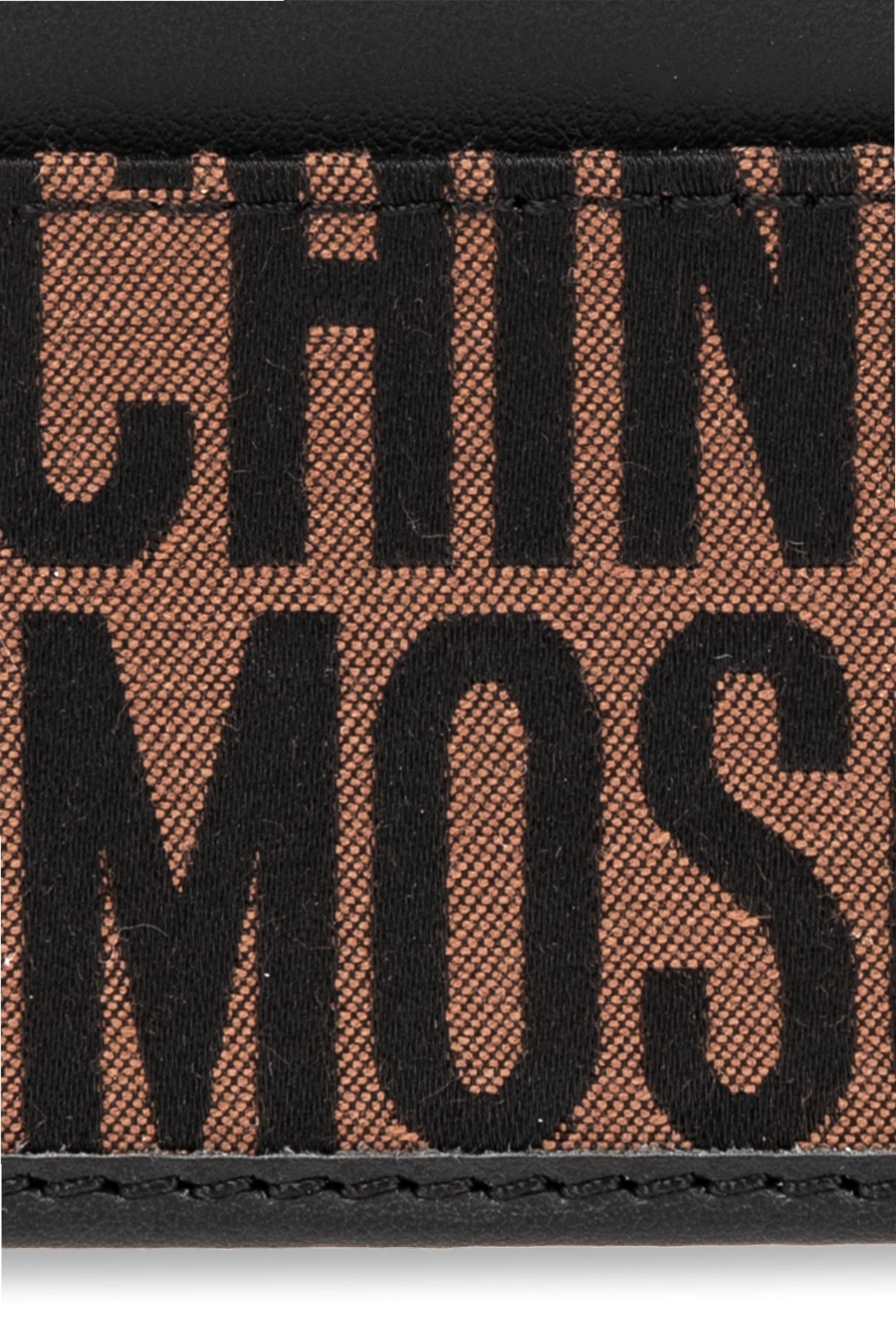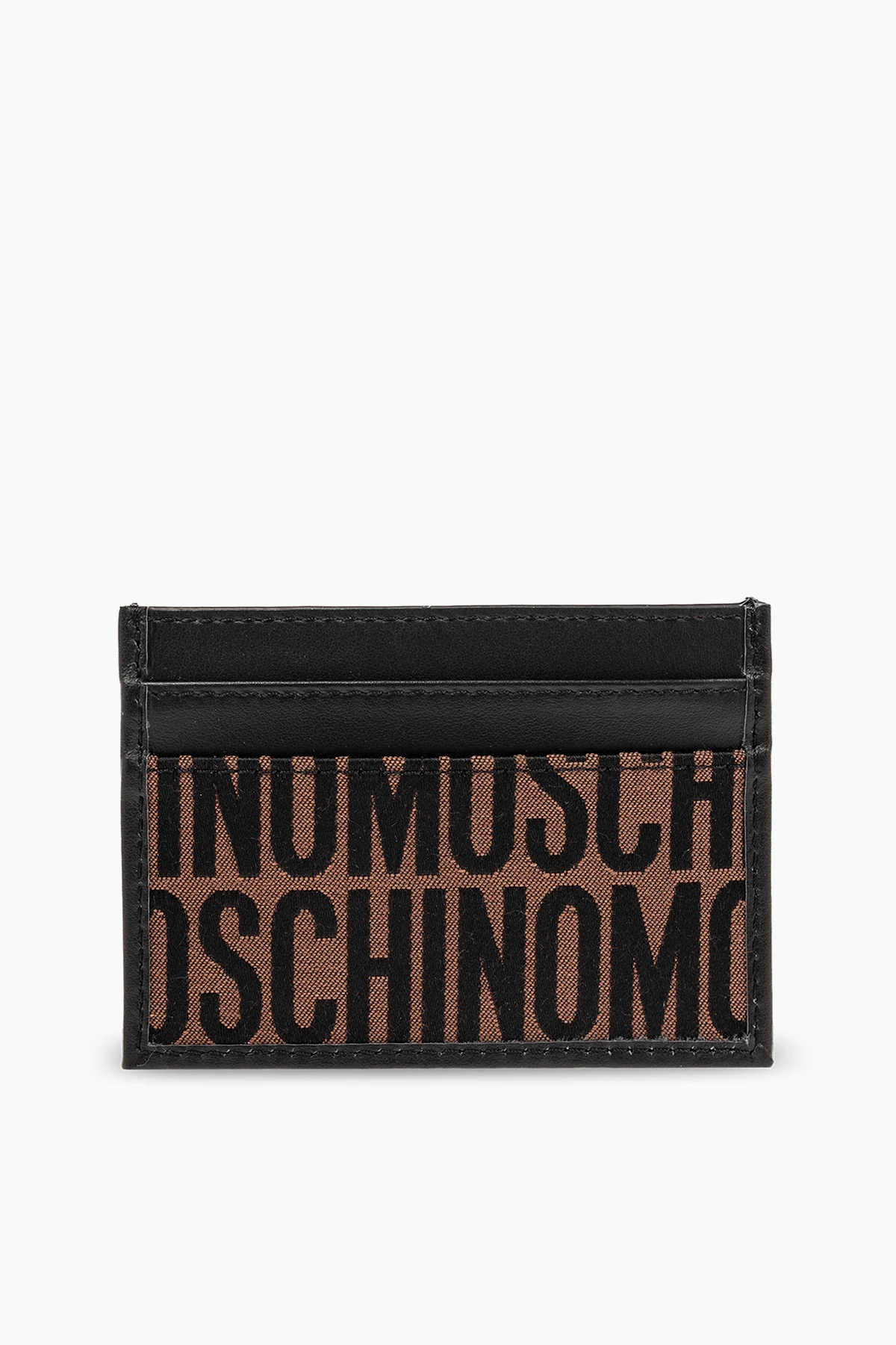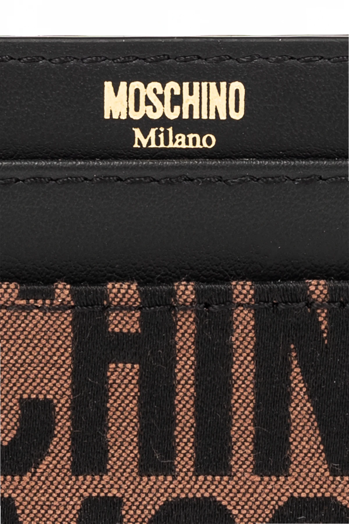 Brązowo-czarne etui na karty Moschino. Ozdobione wzorem z logo. Cztery miejsca na karty i wsuwana kieszeń.