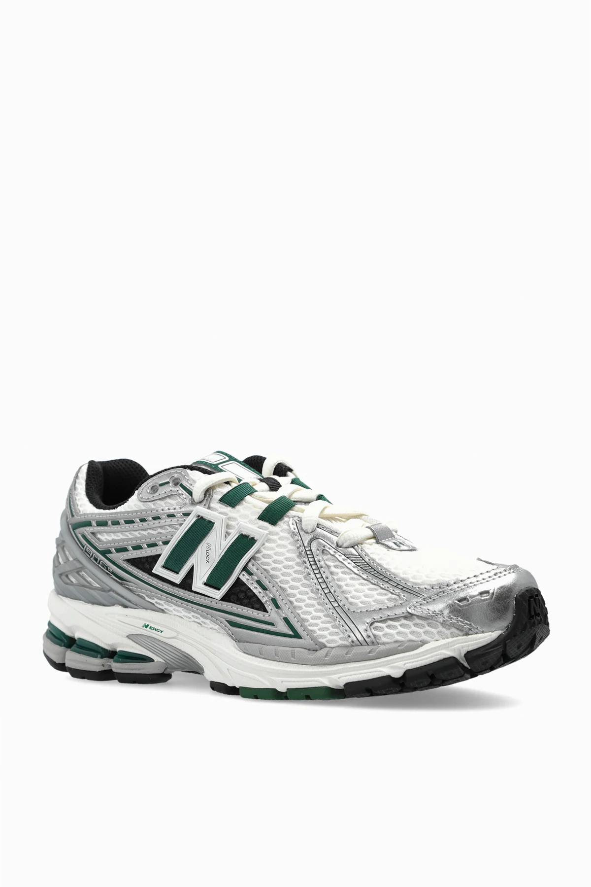 Na boku znajduje się charakterystyczne logo "N", podczas gdy wielowarstwowa podeszwa z zielonymi i czarnymi wstawkami gwarantuje doskonałą amortyzację. Na języku buta dumnie prezentuje się nazwa modelu oraz logo marki, podkreślając prestiż i staranność wykonania.