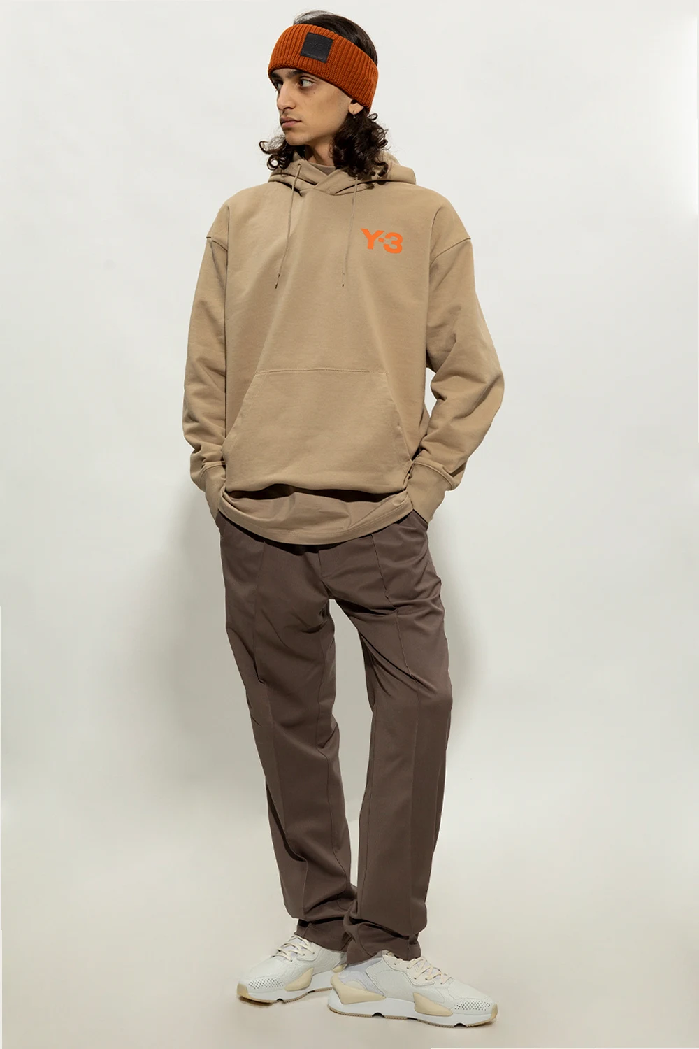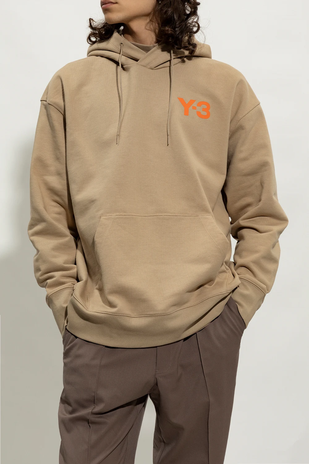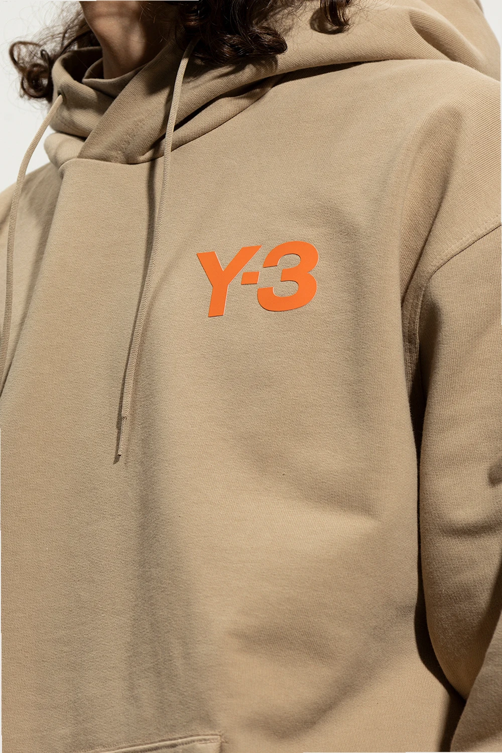 Beżowa bluza o luźnym kroju Y-3 Yohji Yamamoto. Wykonana z bawełny. Kaptur ściągany trokami. Z przodu ozdobiona nadrukowanym logo w kolorze pomarańczowym. Wsuwana kieszeń. Długie rękawy i dół zakończone ściągaczem.