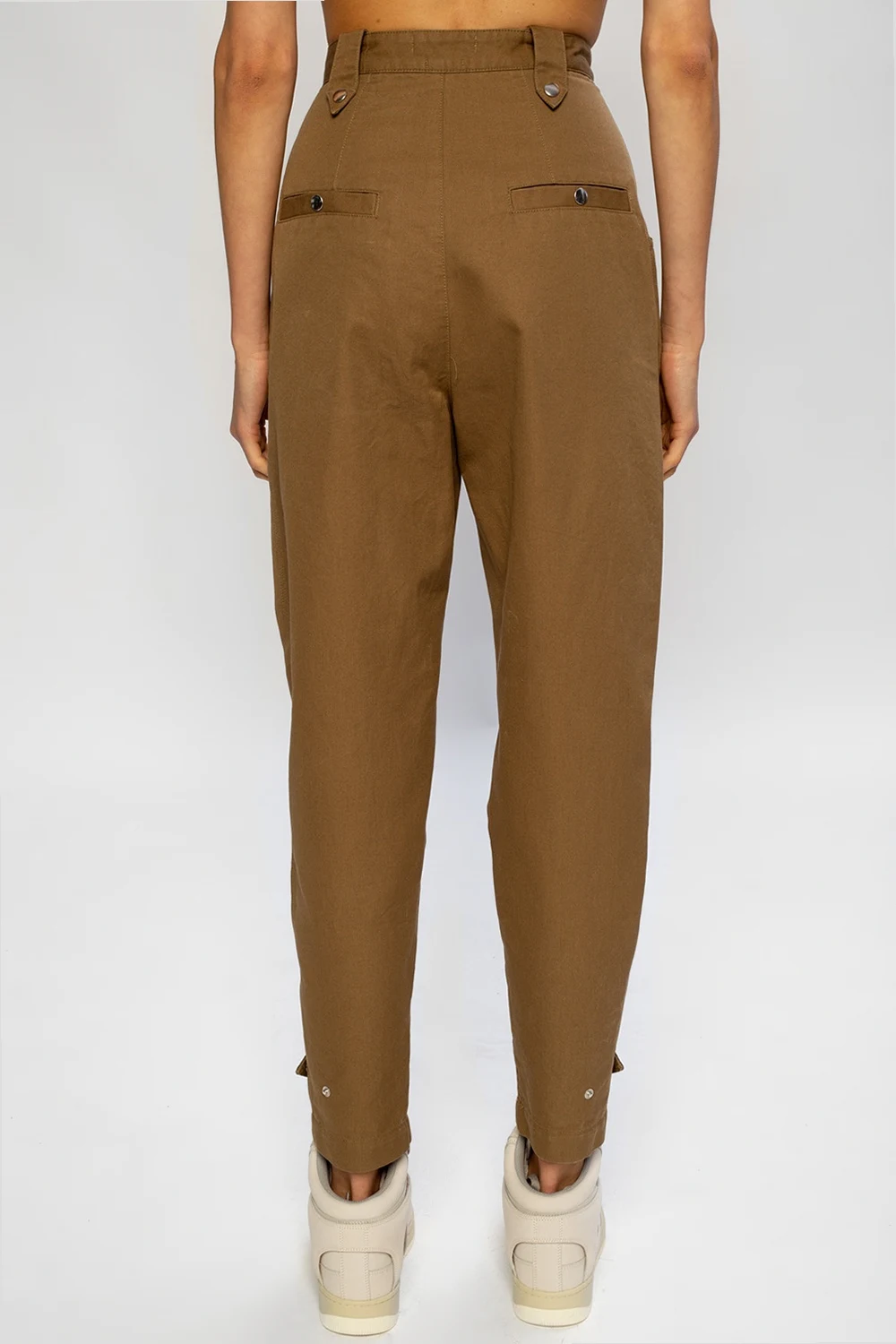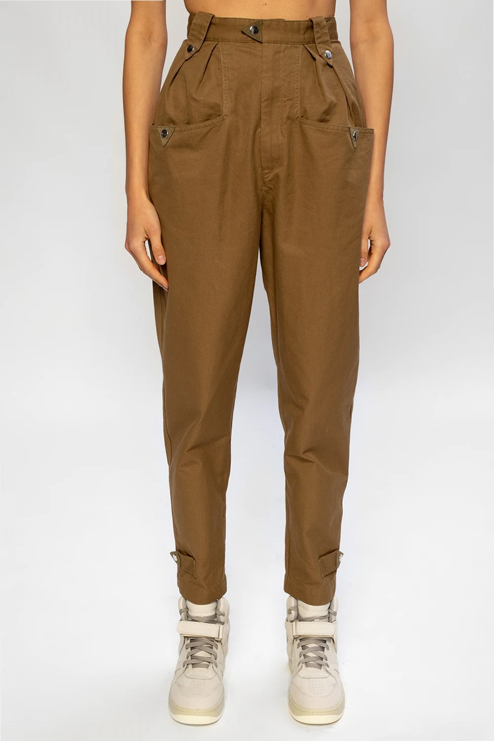 Zielone, bawełniane spodnie Isabel Marant Étoile. Zapinane na zamek oraz na zaczepy. Cztery kieszenie zapinane na zaczepy: dwie z przodu oraz dwie z tyłu. Zwężane nogawki.
