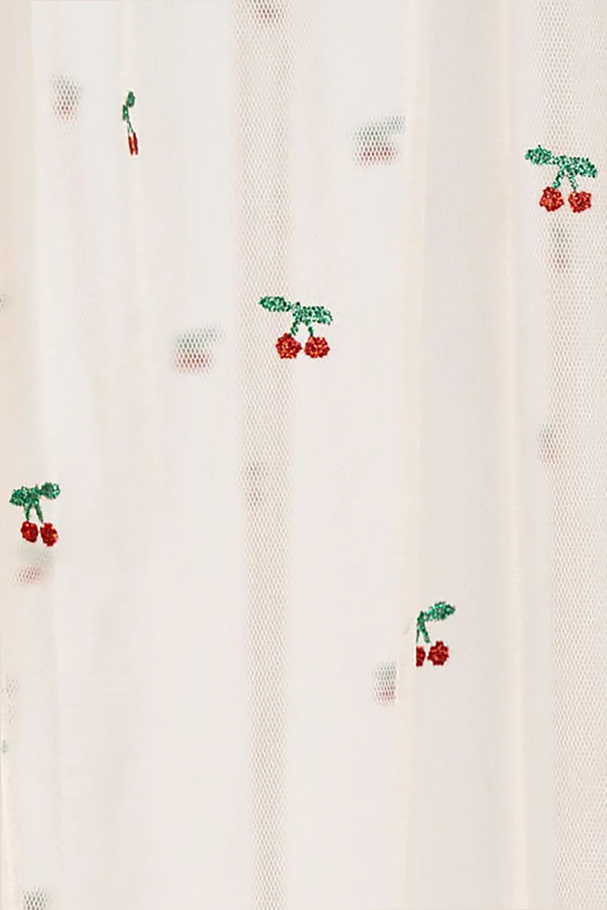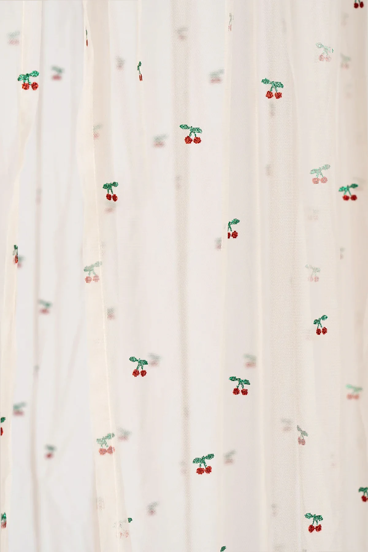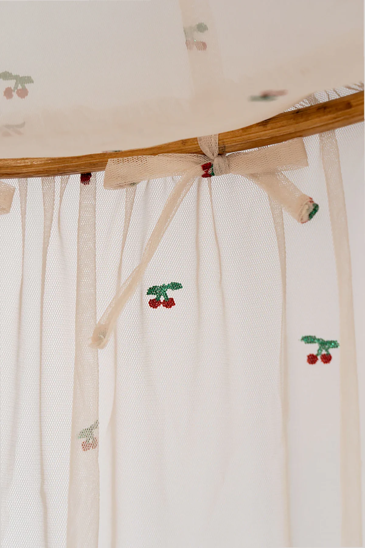 Baldachim ozdobiony jest subtelnym wzorem przedstawiającym czerwone wisienki z zielonymi listkami, co dodaje mu niepowtarzalnego uroku. Stożkowy kształt u góry przechodzi w długi, zwiewny materiał, który delikatnie opada, tworząc przytulną przestrzeń do snu.