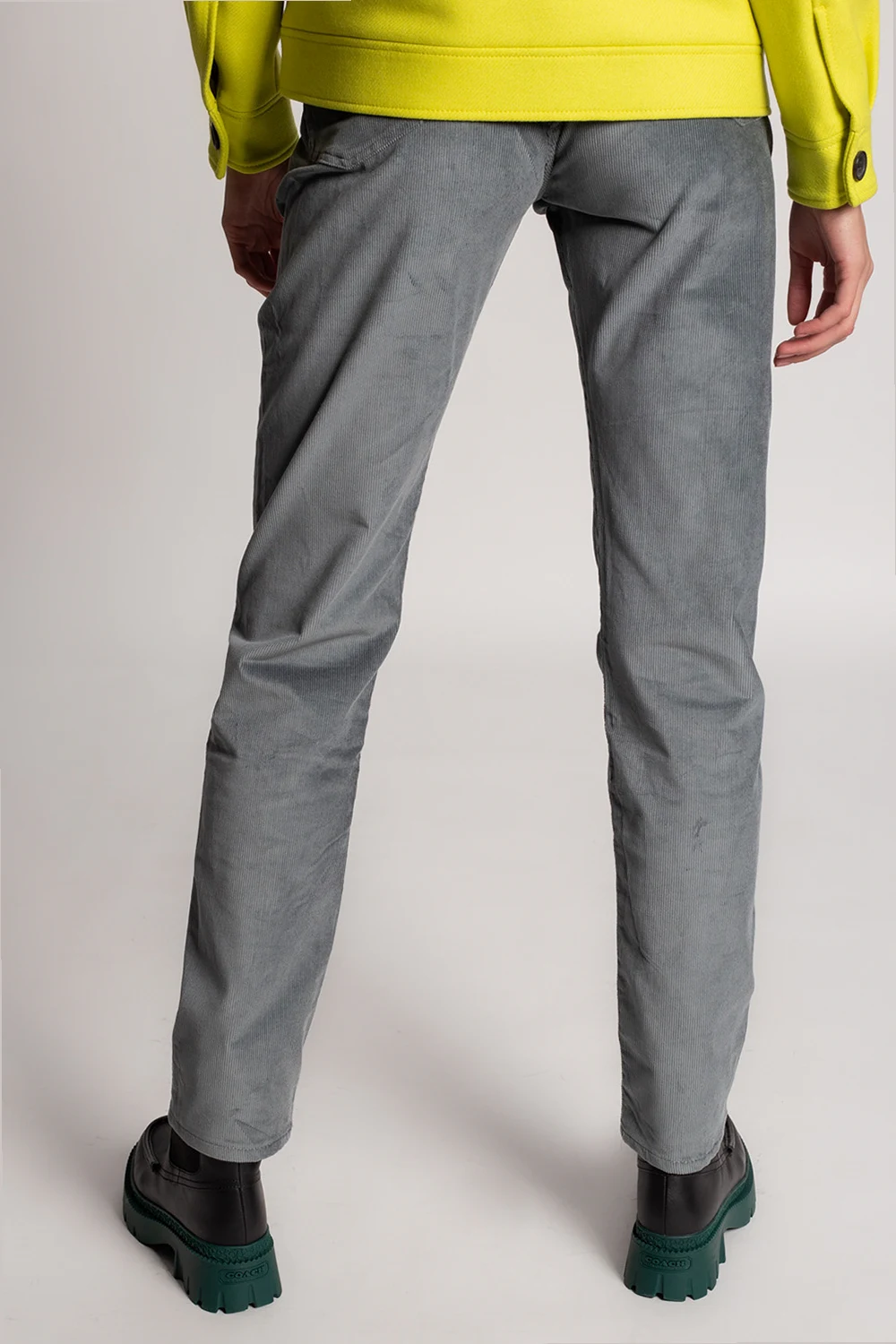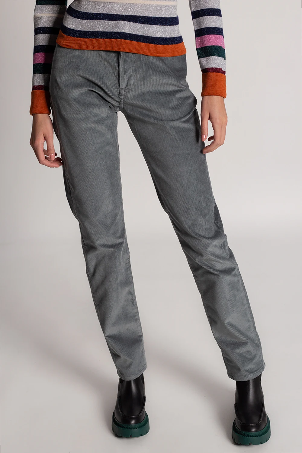Szaro-zielone spodnie sztruksowe PS Paul Smith. Zapinane na zamek oraz guzik. Z tyłu czarna naszywka z logo. Pięć wsuwanych kieszeni: trzy z przodu oraz dwie z tyłu. Zwężane nogawki.