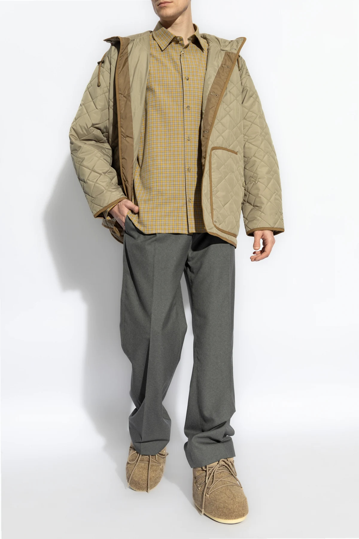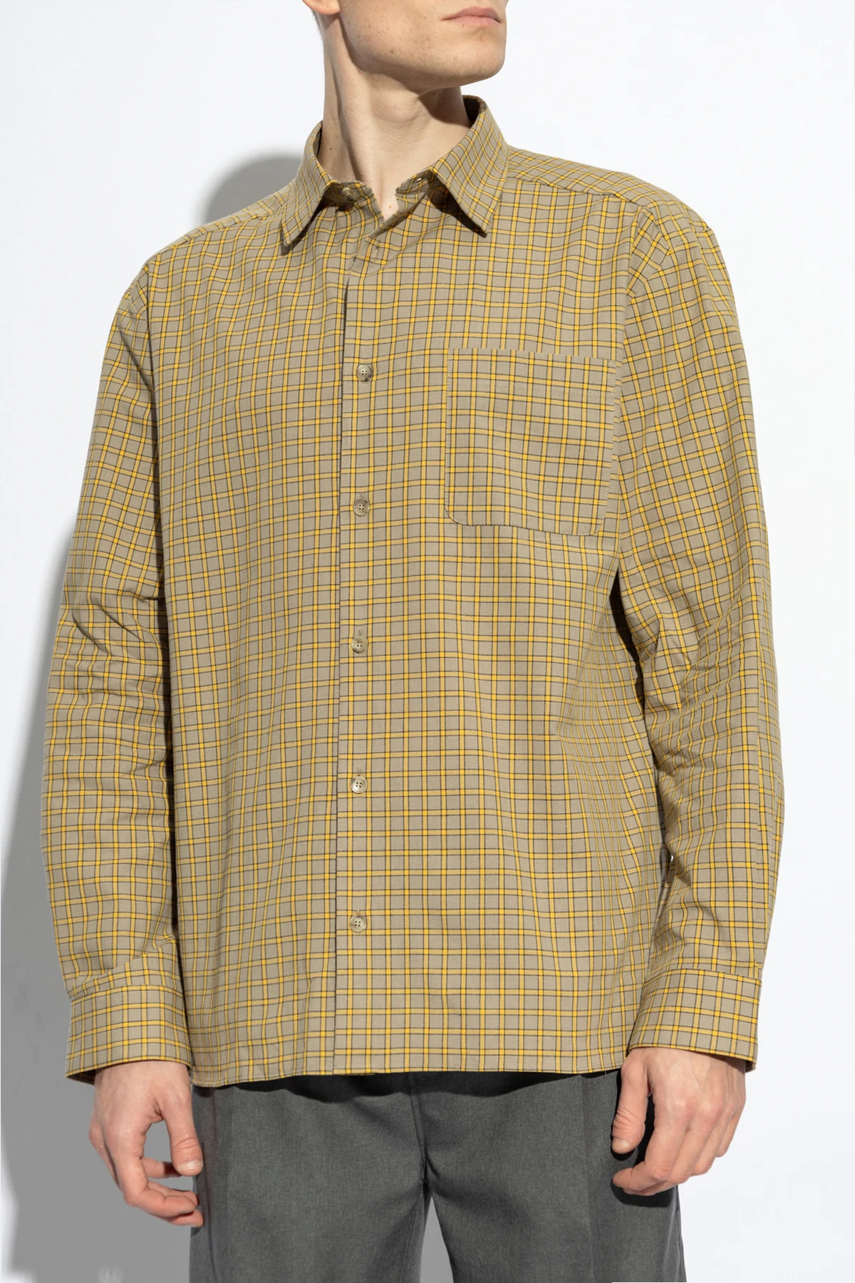 Witamy w świecie luksusu z Koszulą z wzorem w kratę od prestiżowej marki A.P.C. , która od 1987 roku zachwyca miłośników mody w Paryżu i na całym świecie. Ta szlachetna koszula w dominującym beżowym kolorze z subtelnymi żółtymi i czarnymi akcentami, jest wykonana z najwyższej jakości bawełny organicznej , oferując niezrównany komfort noszenia.