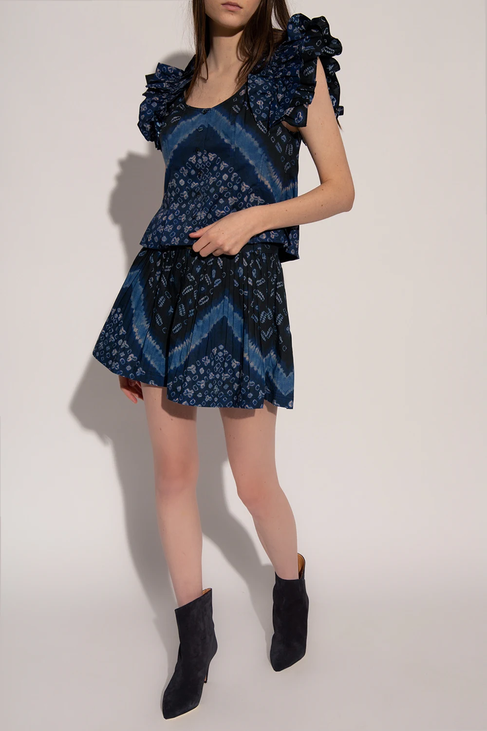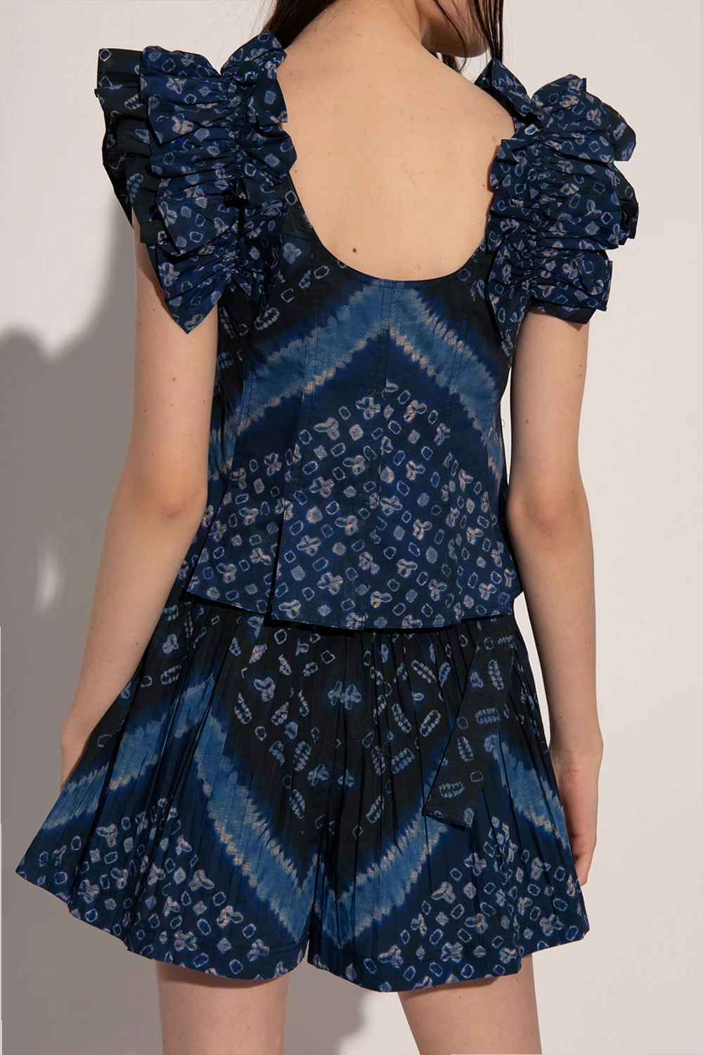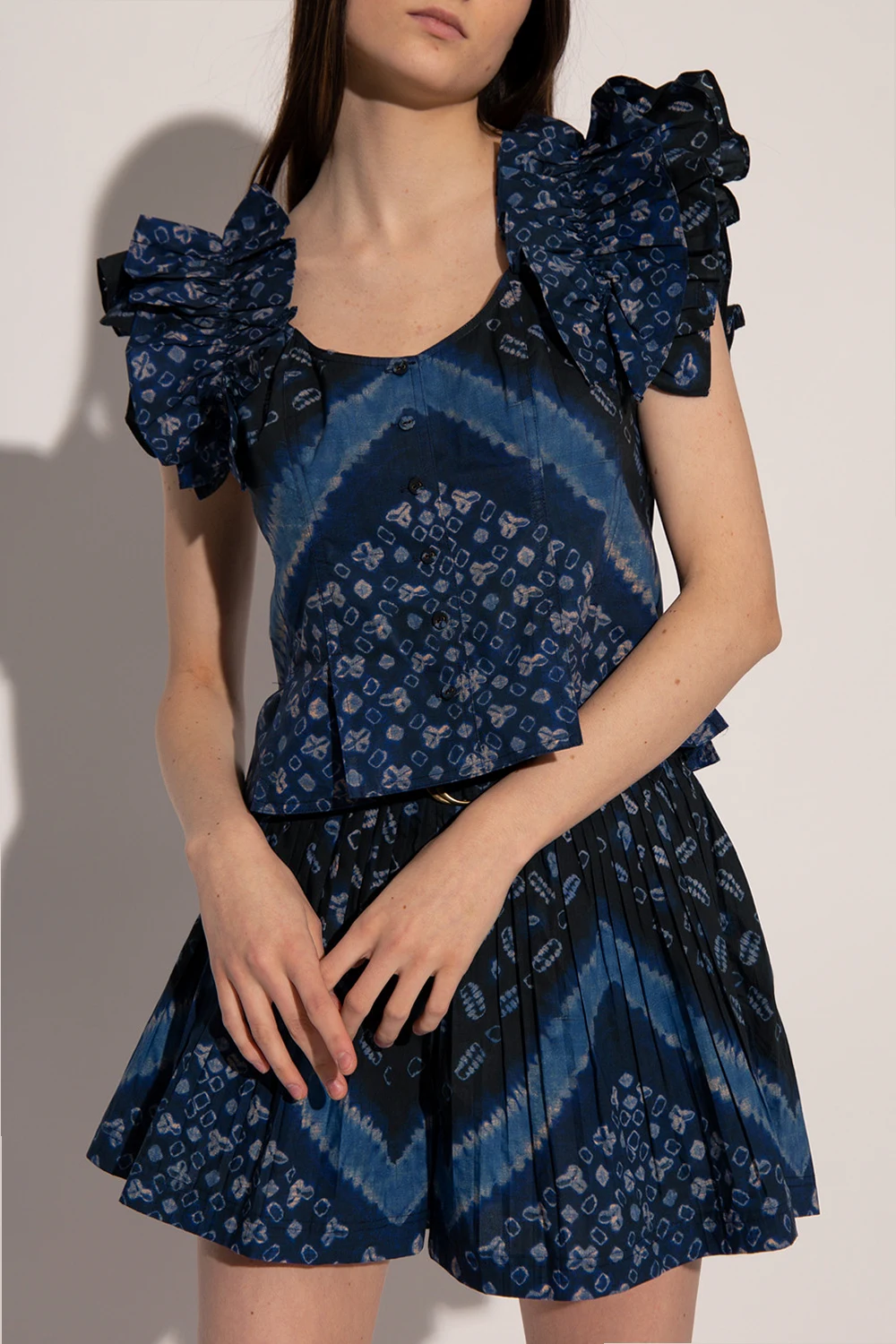 Niebiesko-czarno-kremowy top, model ‘Milla’ Ulla Johnson. Z przodu zapinany na guziki. Ozdobiony wzorem. Dekoracyjne ramiączka wykończone falbaną.