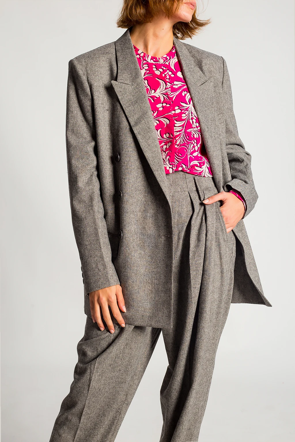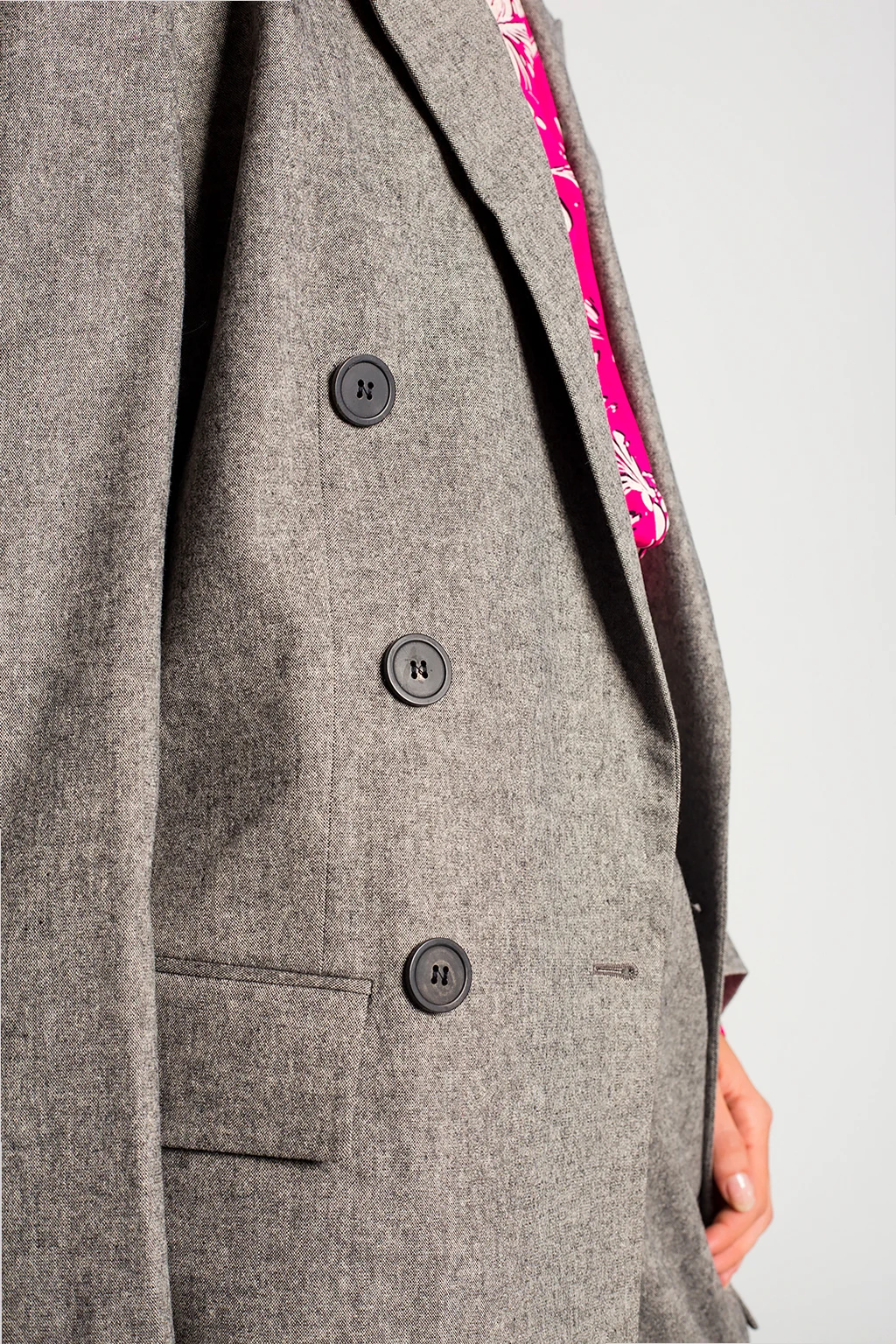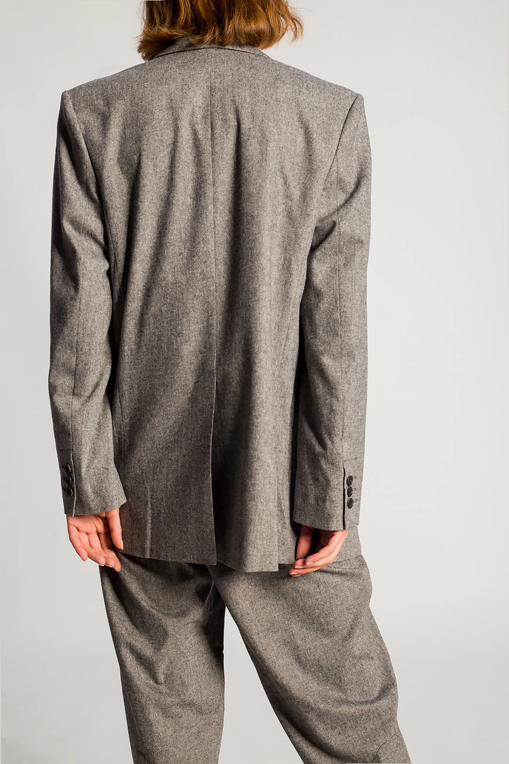 Szara, dwurzędowa marynarka Isabel Marant Étoile. Zapinana na guziki. Trzy kieszenie: jedna wsuwana oraz dwie z patką. Długie rękawy zakończone zapięciem na guziki. Z tyłu rozcięcie.