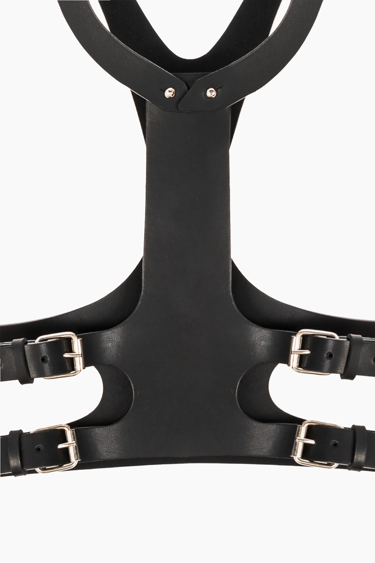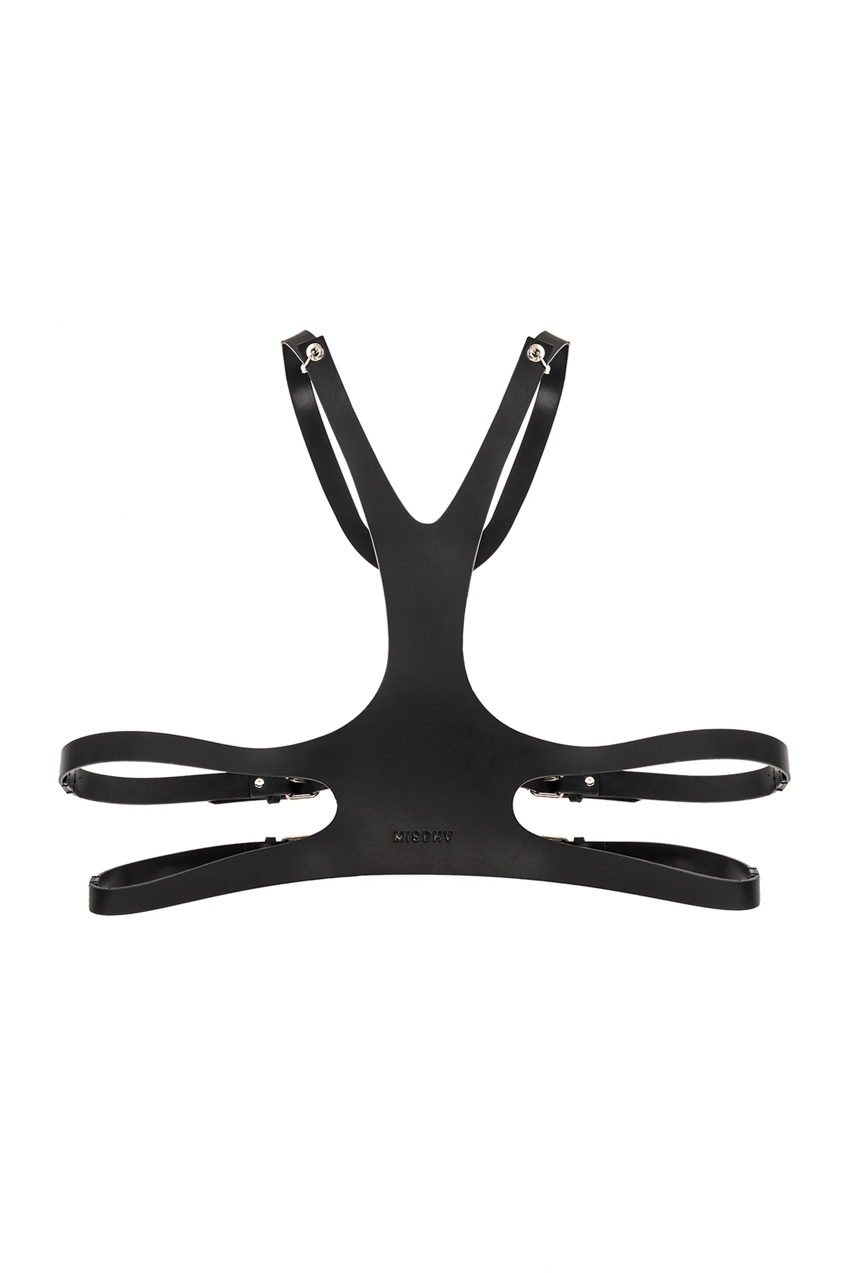 Czarna uprząż MISBHV. Wykonana ze skóry. Zapinana na paski z klamrą. Ozdobiona wytłoczonym logo. Metalowe wykończenie w kolorze srebrnym.