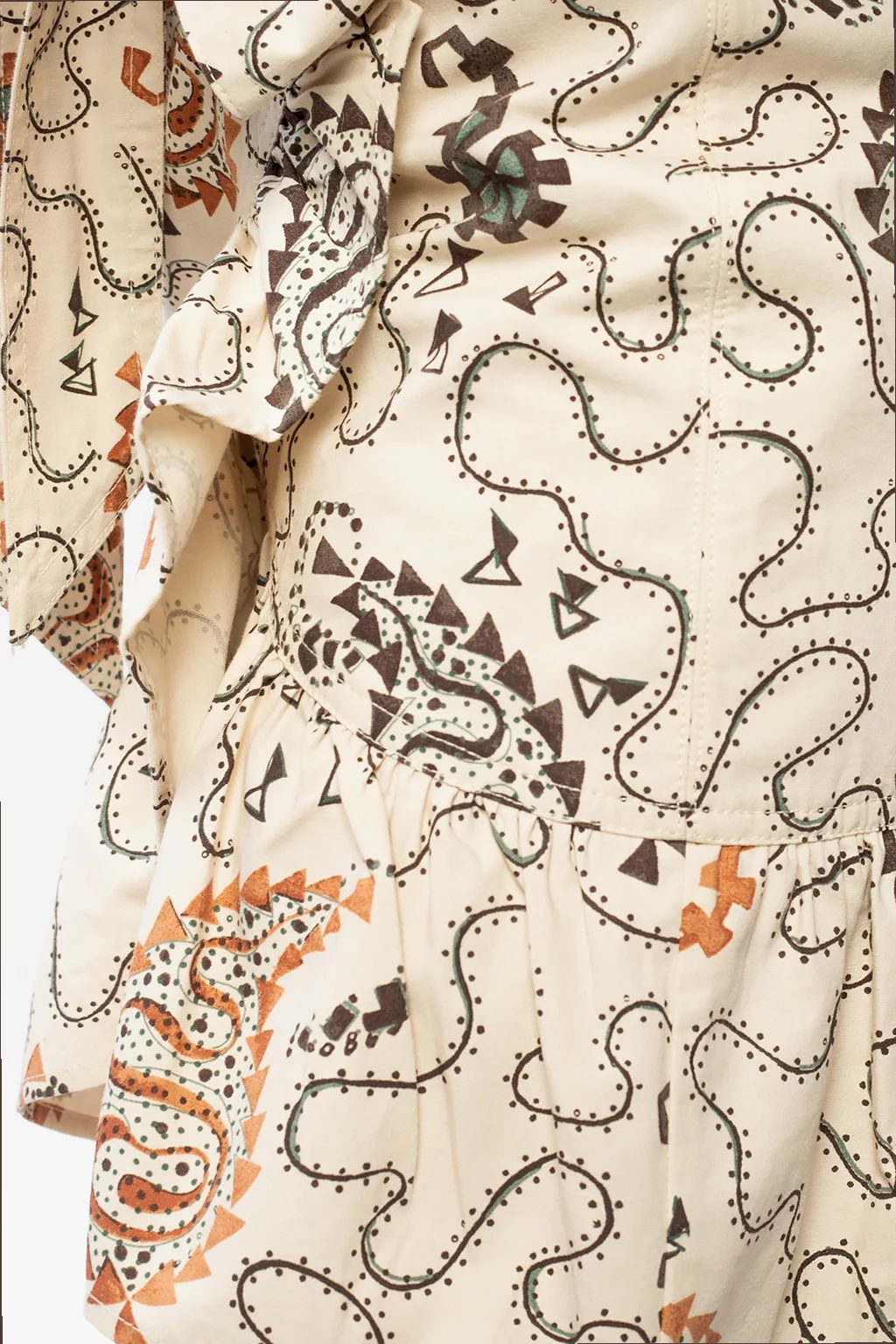 Kremowa, bawełniana spódnica Isabel Marant Étoile. Z przodu wiązana paskiem. Z tyłu zapinana na zamek oraz na haftkę. Ozdobiona kolorowym wzorem, marszczeniami oraz falbaną.
