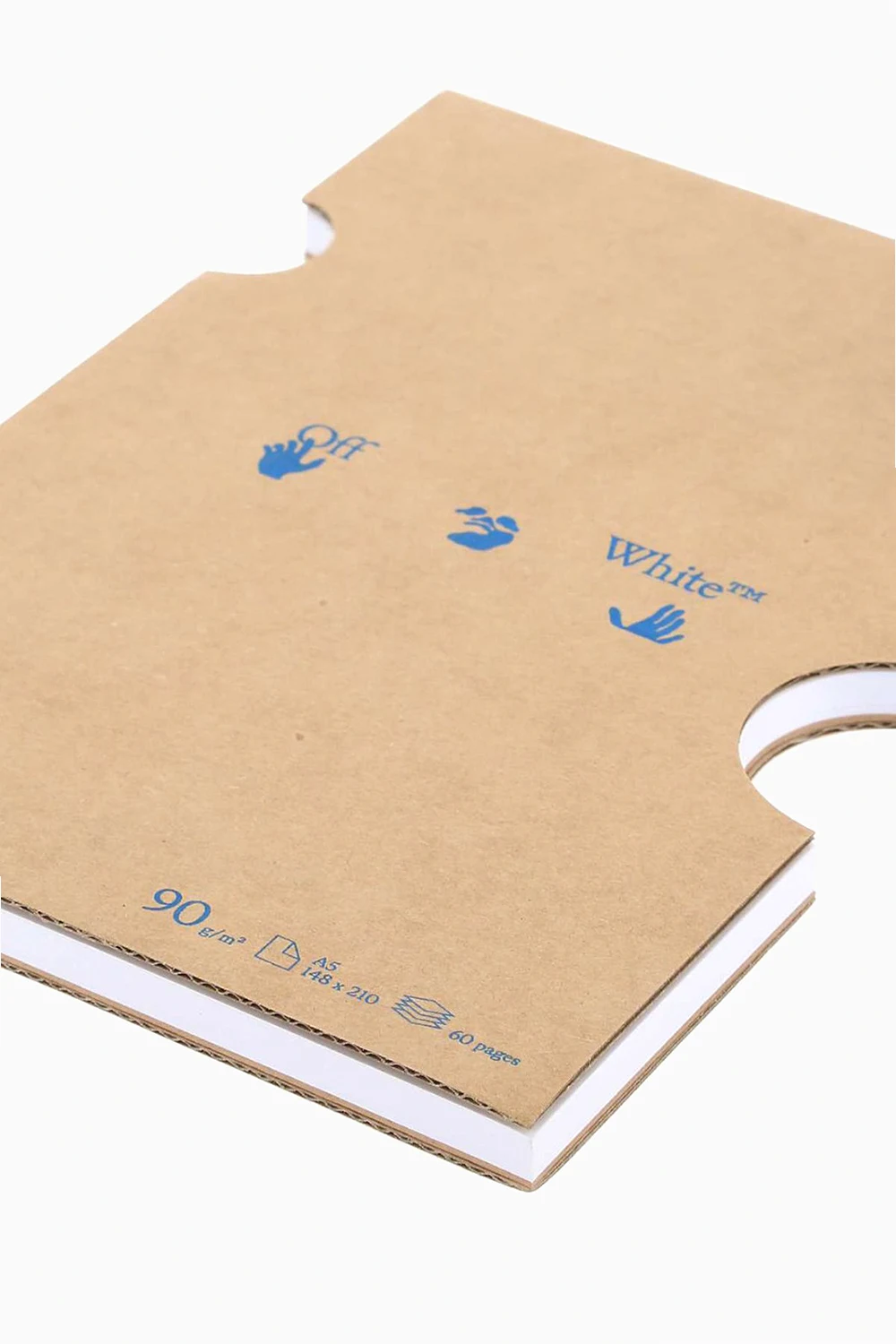 Brązowy notatnik Off-White. Format A5. Gramatura papieru 90g/m2. 60 stron. Ozdobiony nadrukowanym logo w kolorze niebieskim. Dekoracyjne wycięcia.