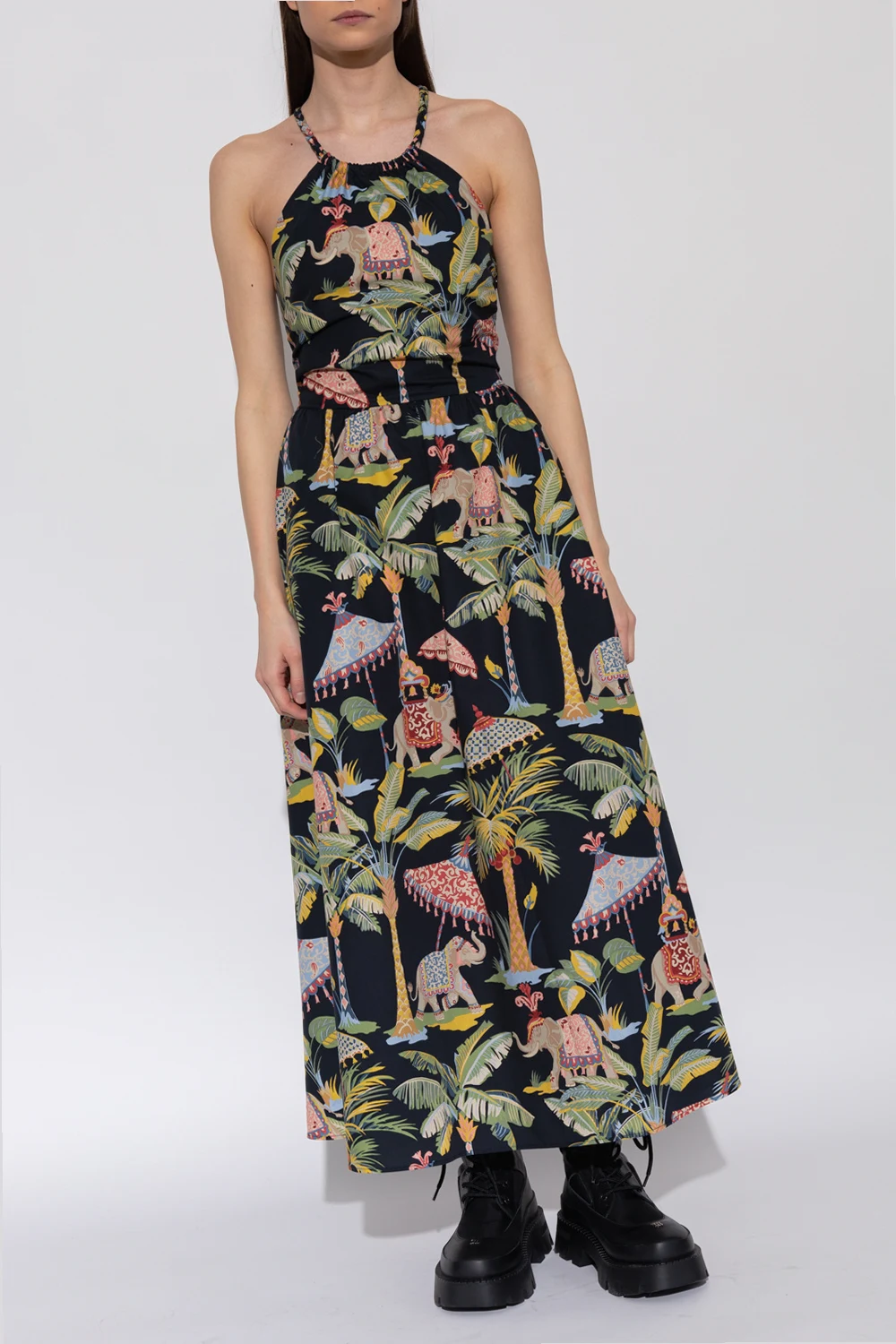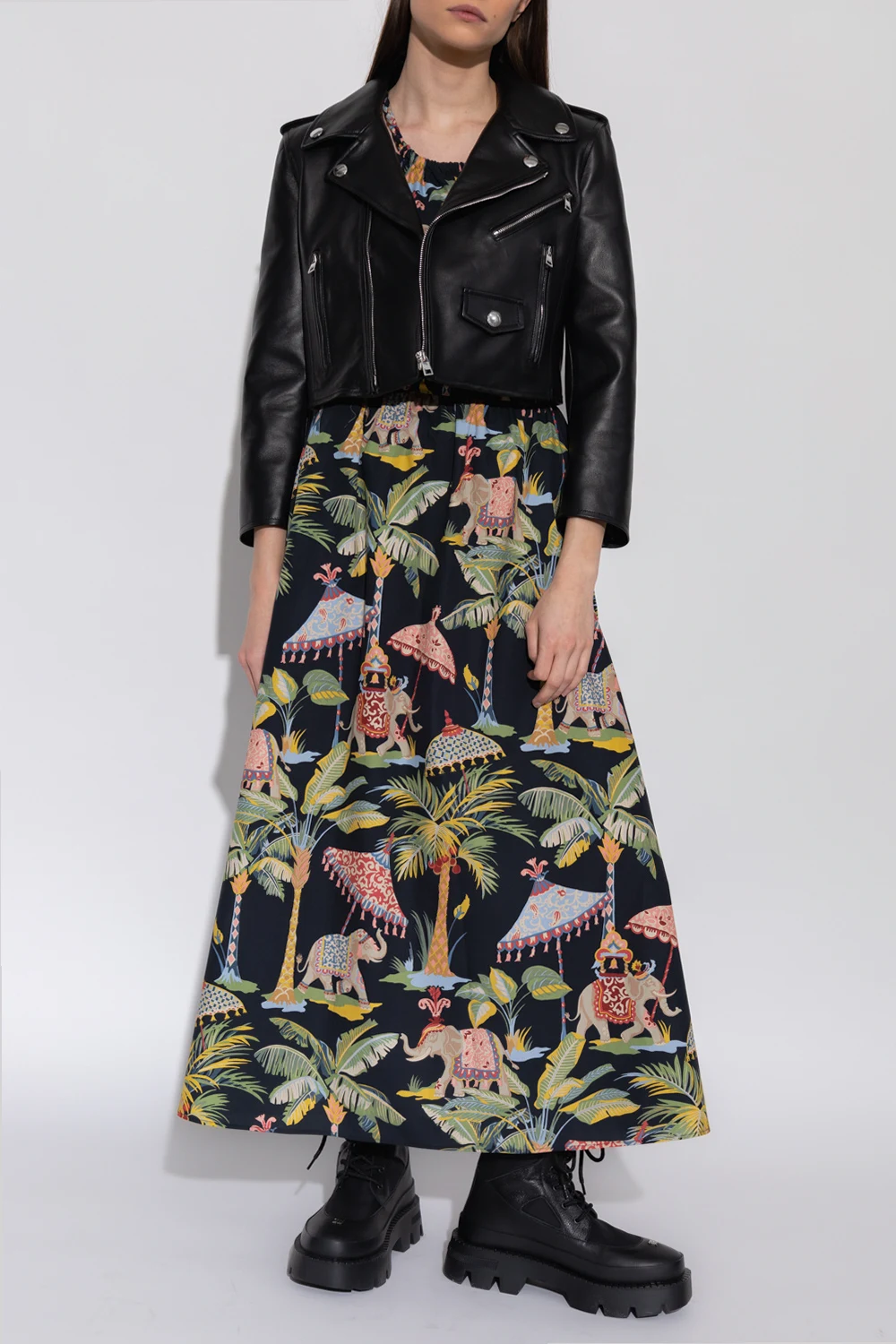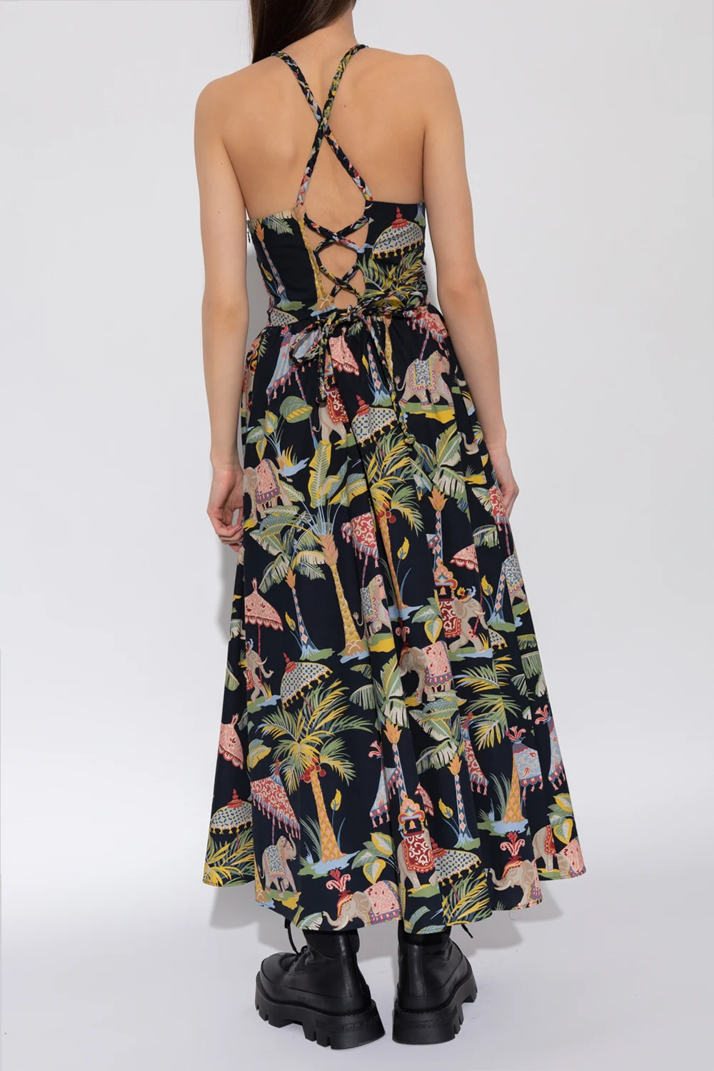 Czarna, bawełniana sukienka na ramiączkach Red Valentino. Zapinana z boku na kryty zamek, haftkę oraz wiązana z tyłu w talii. Ozdobiona kolorowym wzorem z motywem roślinnym oraz zwierzęcym. Plecione cienkie ramiączka, skrzyżowane na plecach. Spódnica rozszerzana ku dołowi z dwiema wsuwanymi kieszeniami.