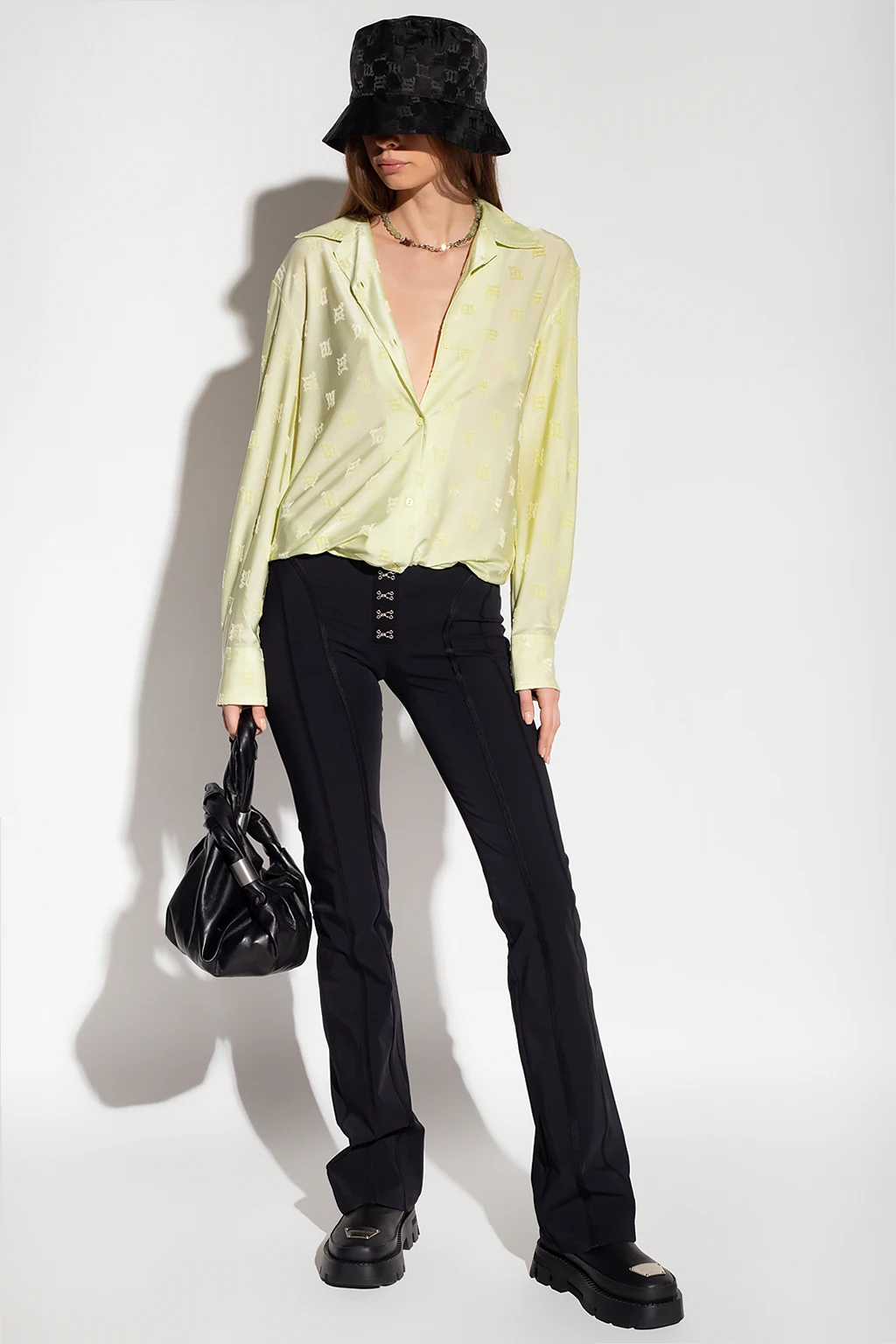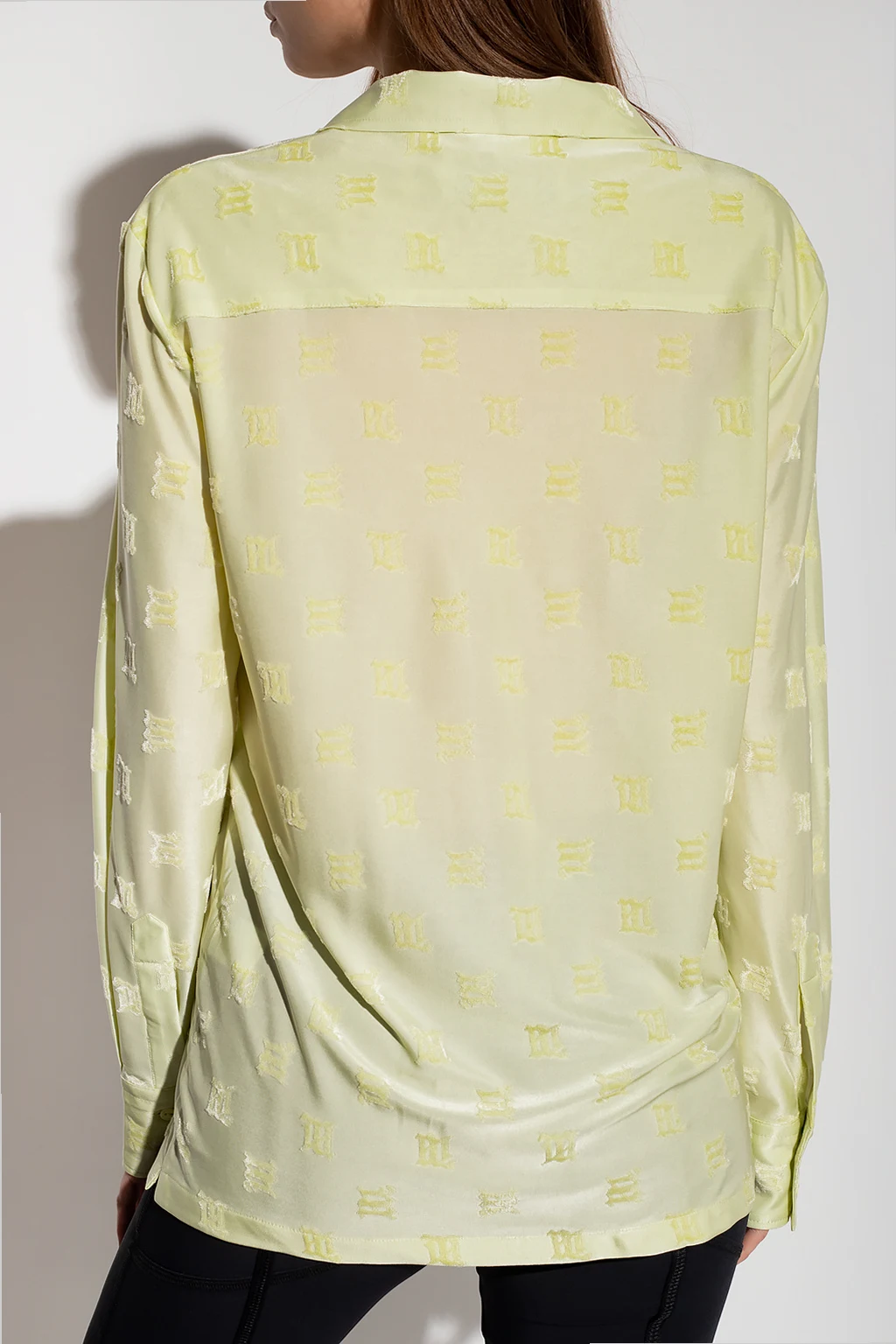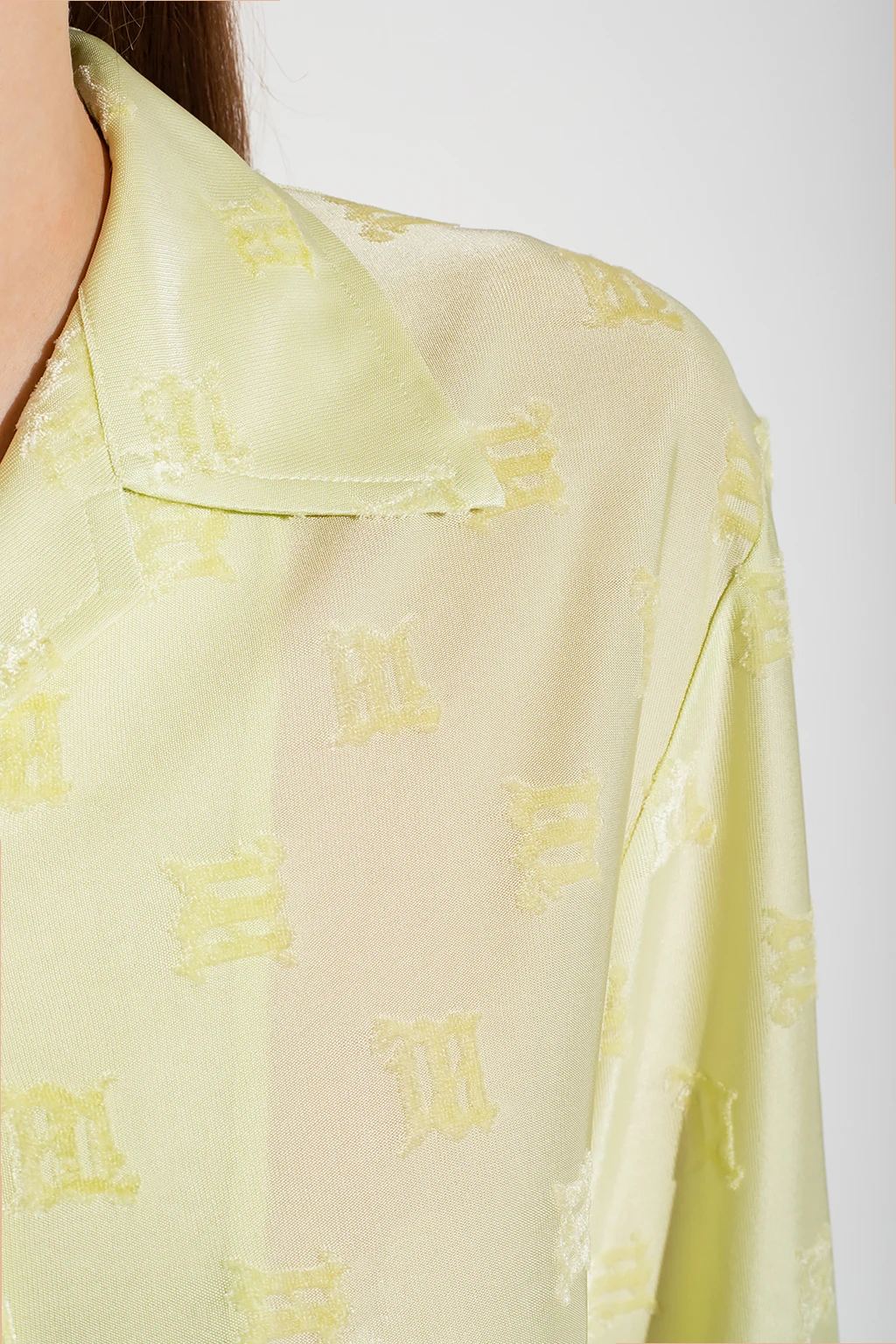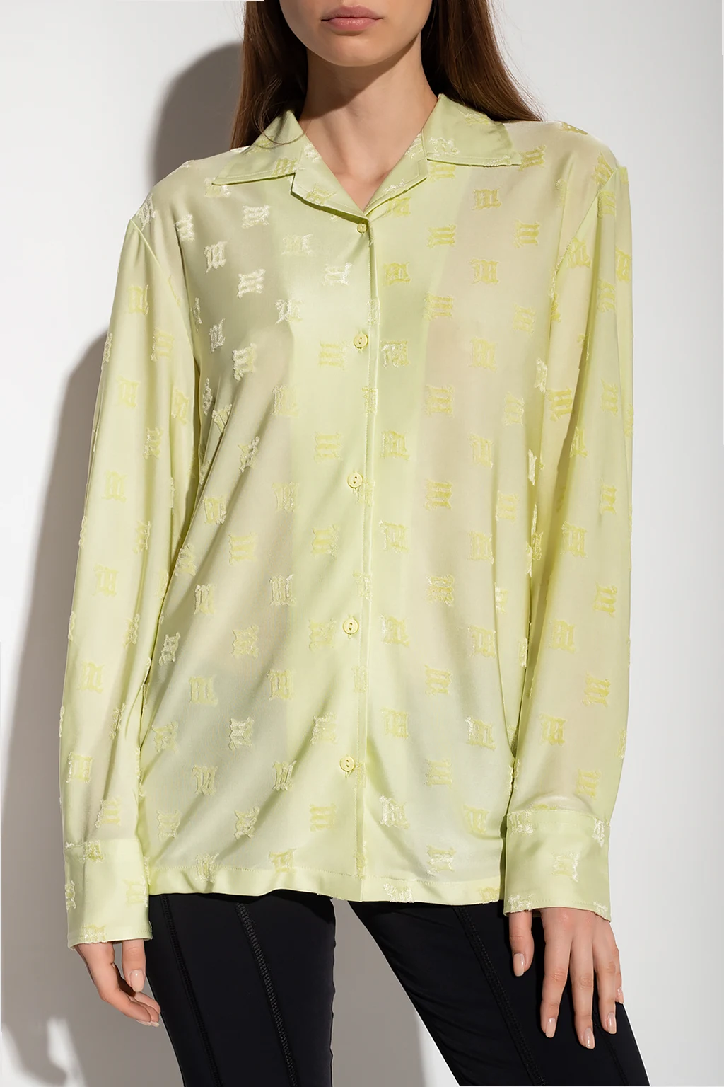 Jasnozielona koszula o luźnym kroju MISBHV, kolekcja ‘Metamorphosis 1993’. Zapinana na guziki. Ozdobiona wzorem z monogramem o aksamitnym wykończeniu. Długie rękawy zakończone mankietem zapinanym na guziki.