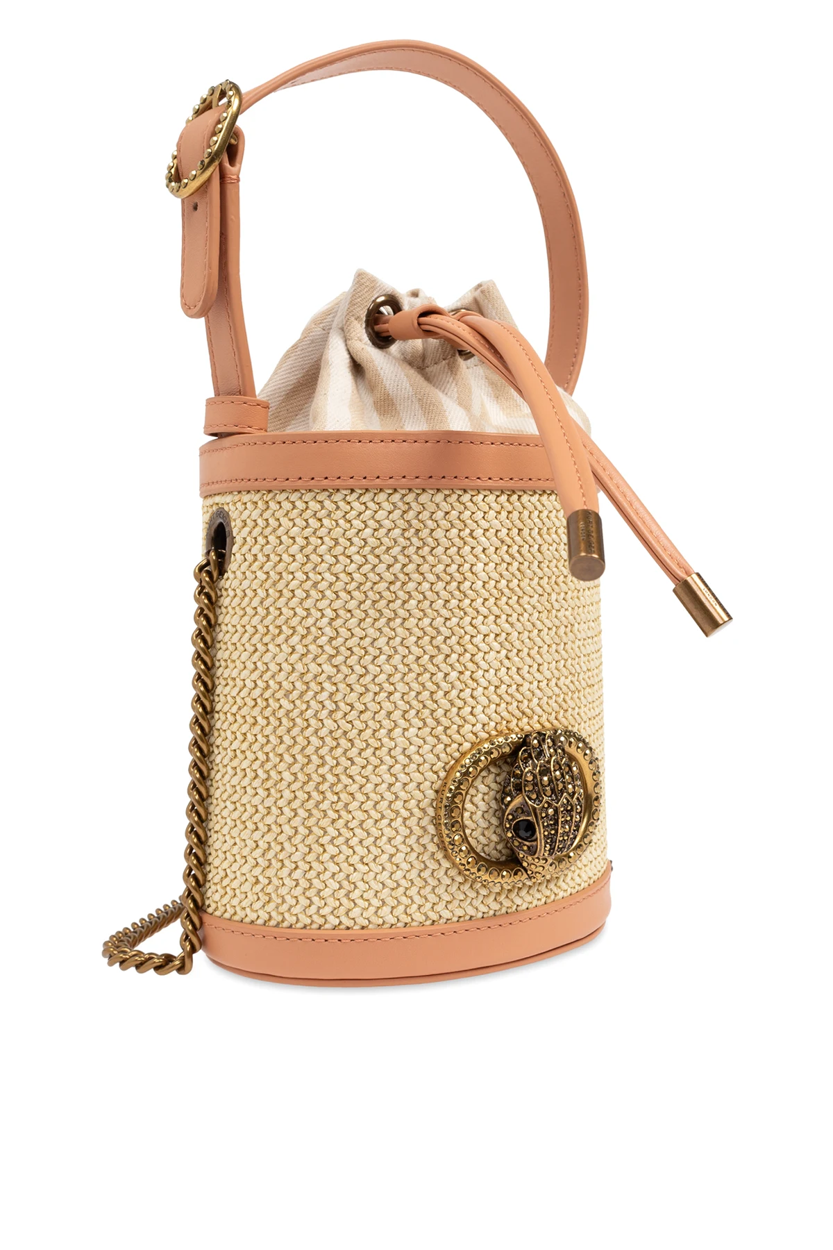 Przedstawiamy torbę ‘Chelsea Small’ typu ‘bucket’ z ekskluzywnej kolekcji brytyjskiej marki Kurt Geiger . Ta elegancka torba o cylindrycznym kształcie zachwyca plecionym beżowym materiałem, który harmonijnie łączy się z luksusowymi wykończeniami z jasnej skóry.