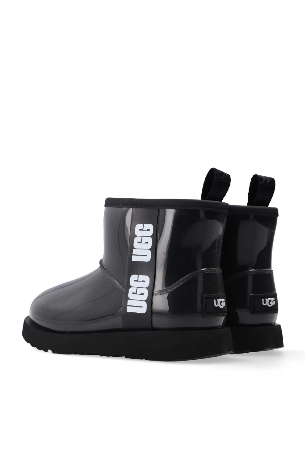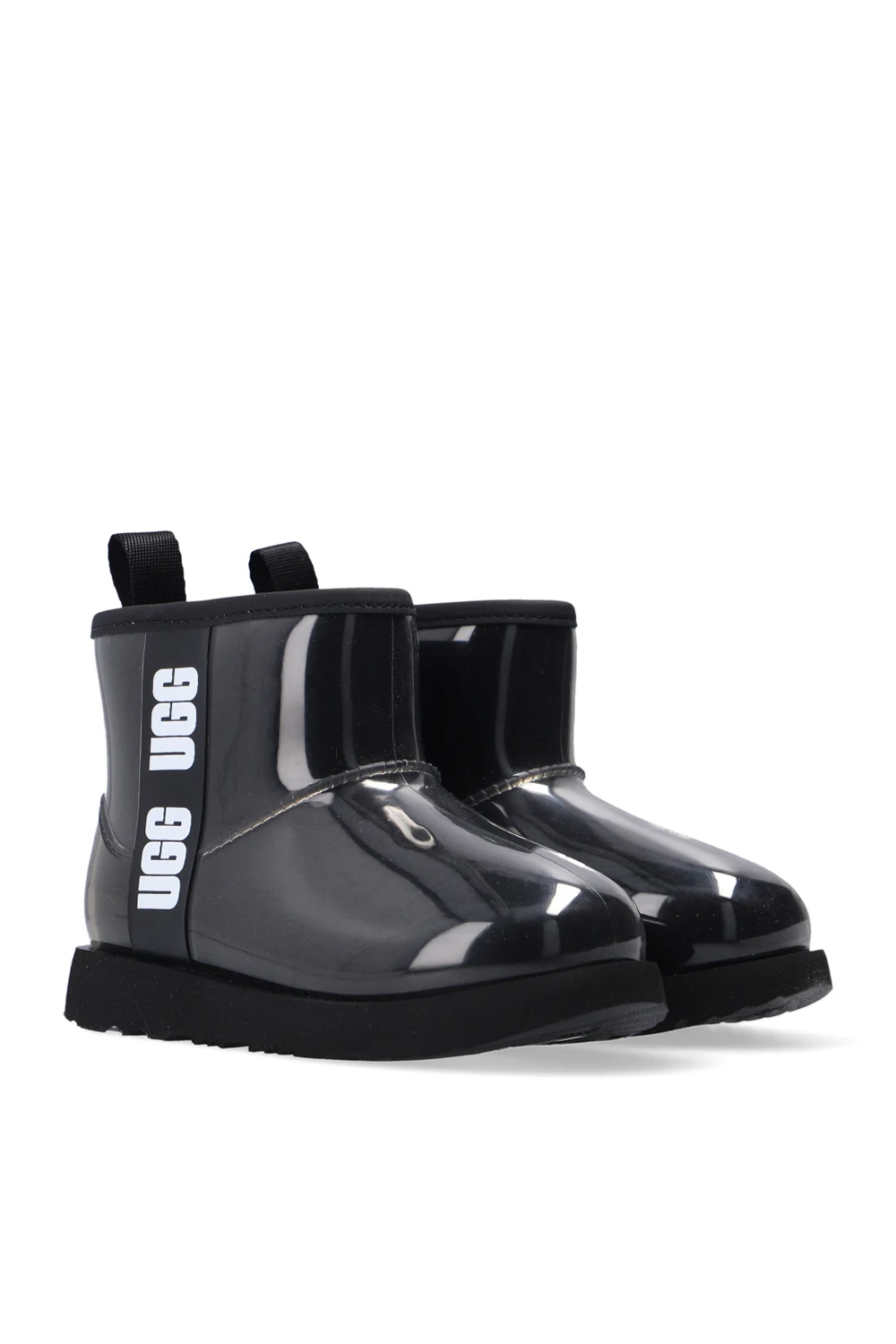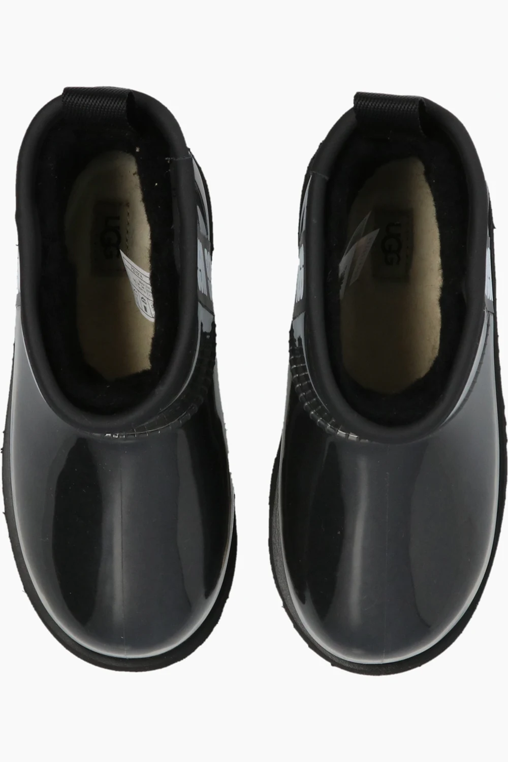 Czarne, wsuwane buty za kostkę UGG Kids. Ozdobione wzorem z logo w kolorze biało-czarnym. Czarna, gumowa podeszwa.
