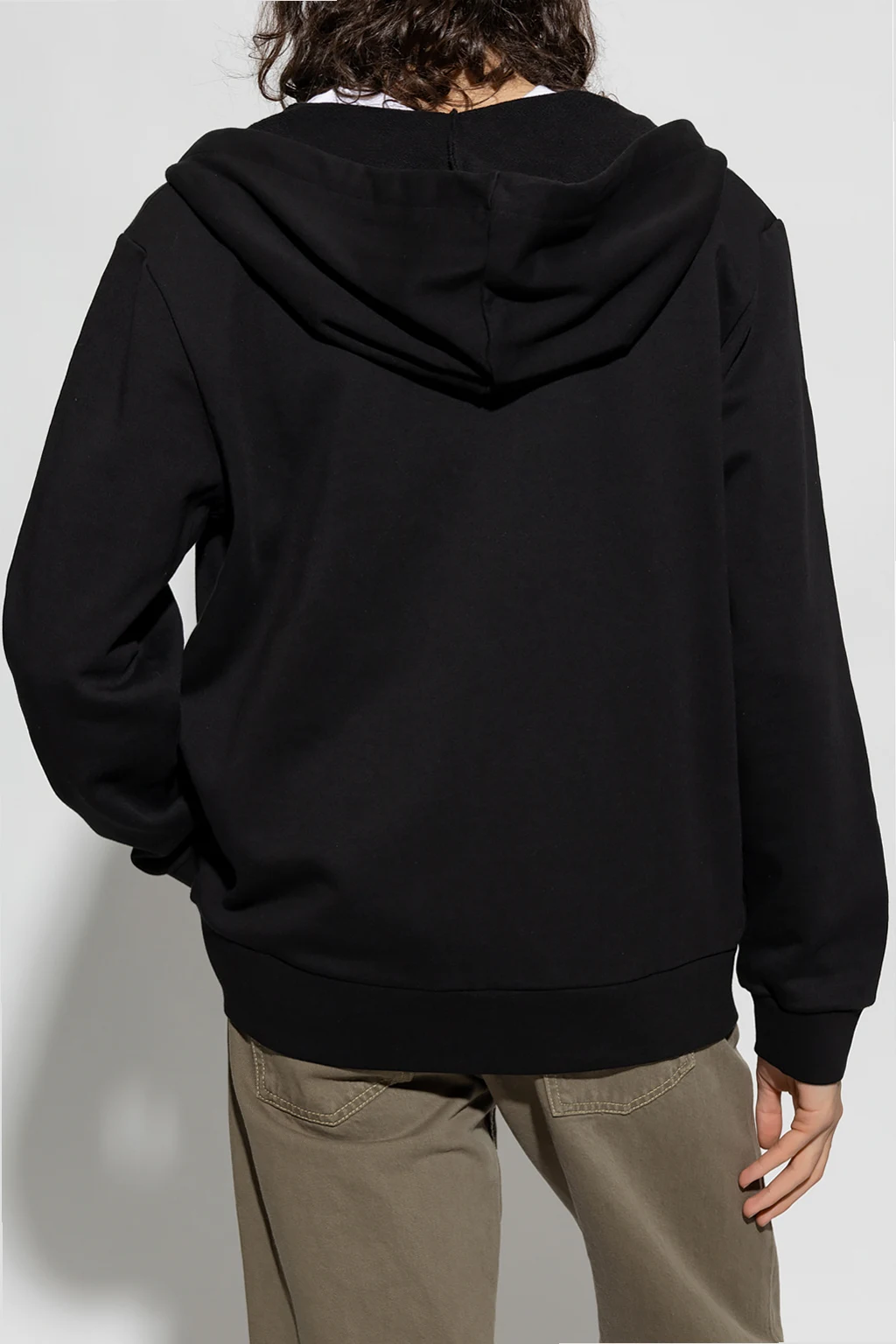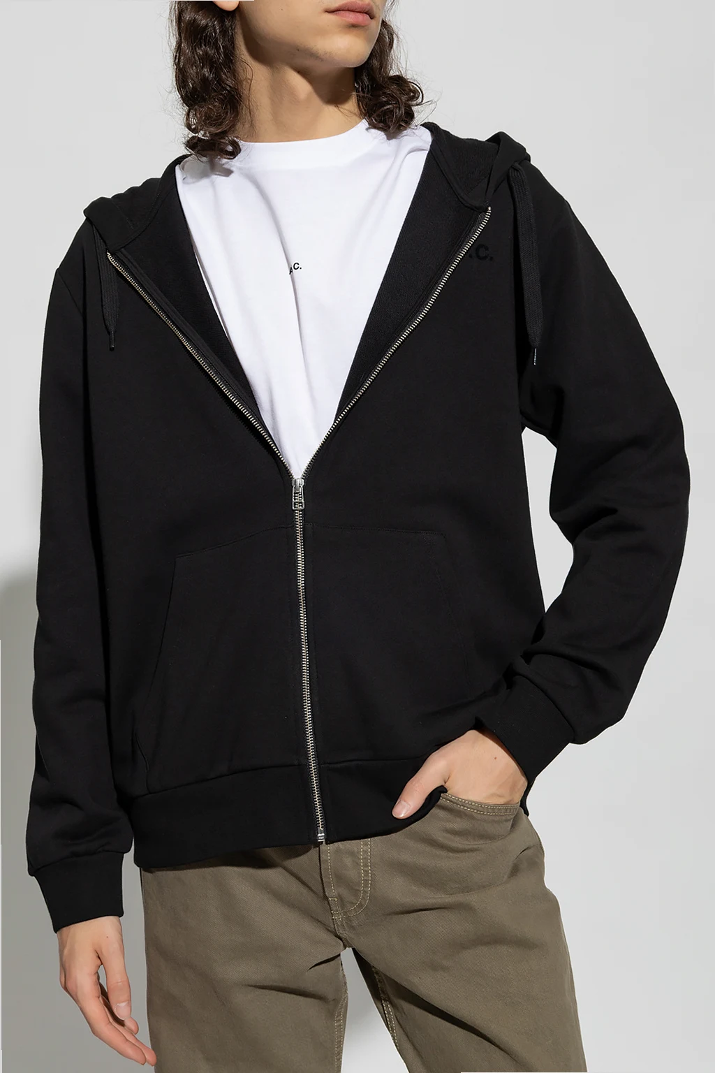 Czarna bluza, model ‘Quentin’ A.P.C. Wykonana z bawełny organicznej. Zapinana na zamek. Kaptur ściągany trokami. Z przodu ozdobiona logo. Dwie wsuwane kieszenie. Długie rękawy i dół zakończone ściągaczem.