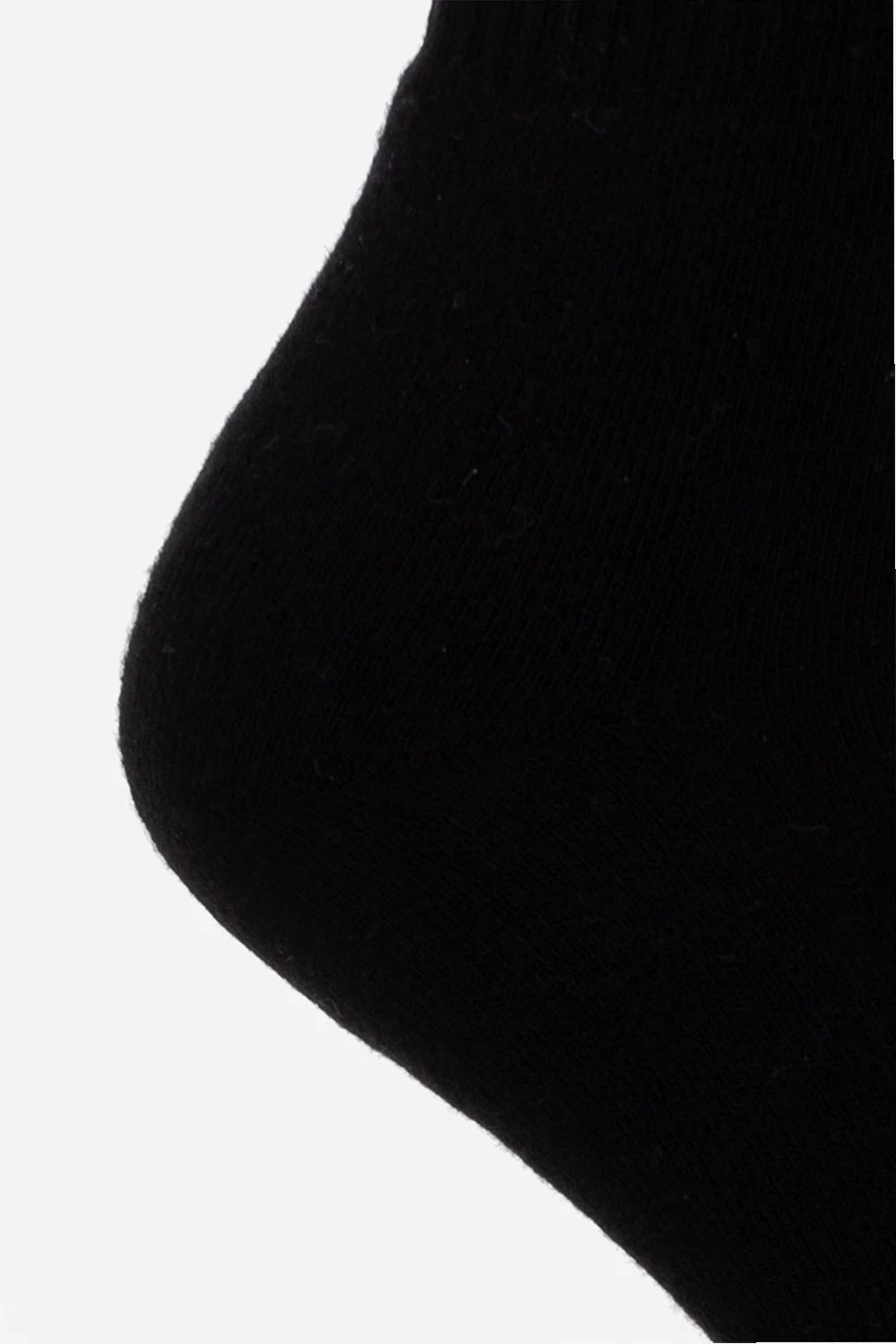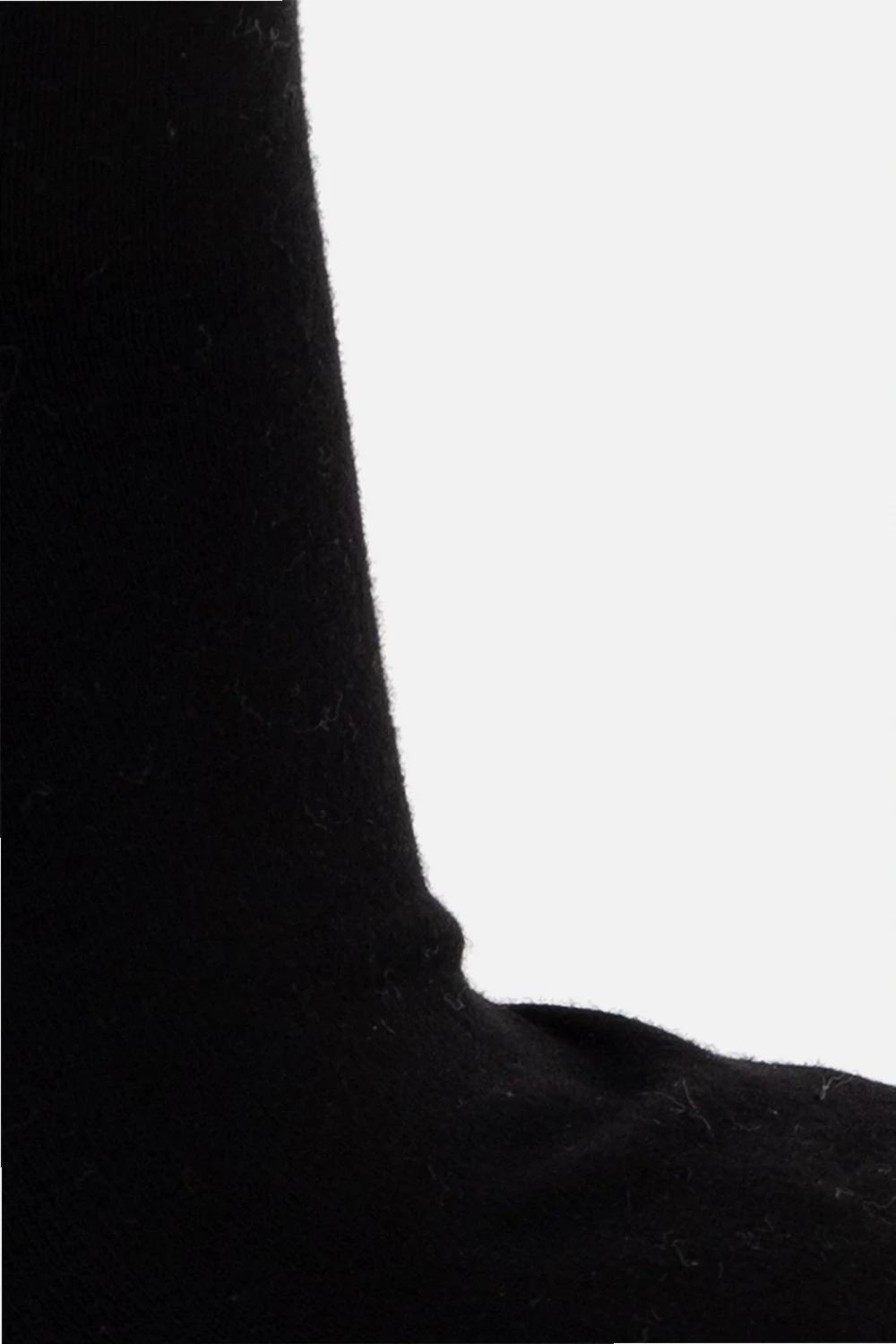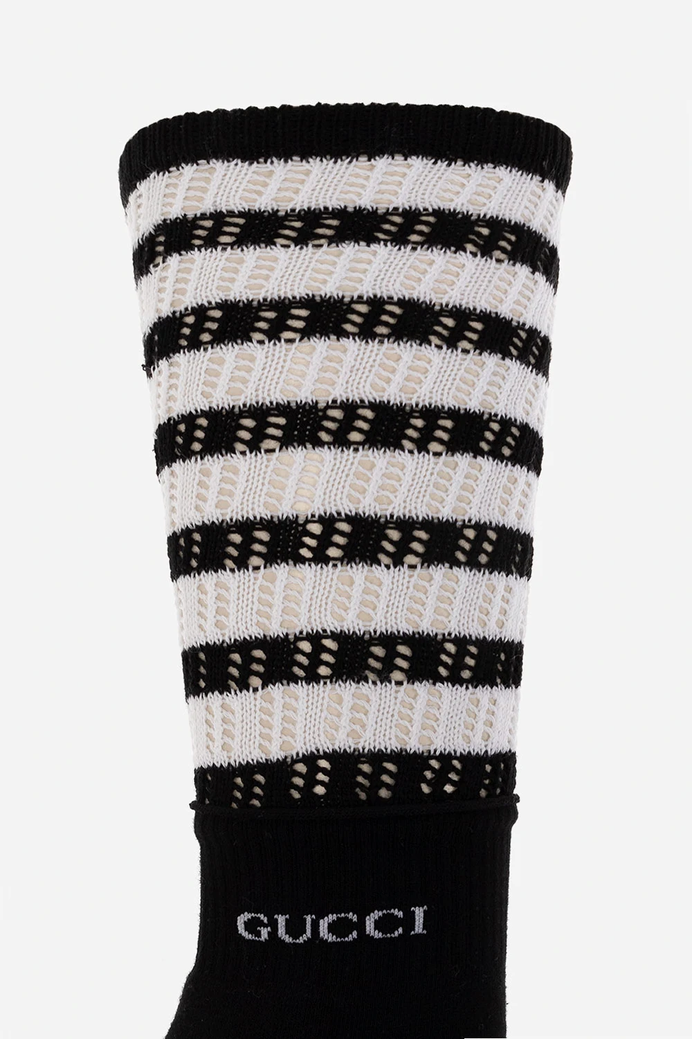 Czarno-białe, dwuwarstwowe, długie skarpety Gucci. Wykonane z mieszanki bawełny. Ozdobione białym logo, ażurowym wzorem i paskami. Wykończone ściągaczem.