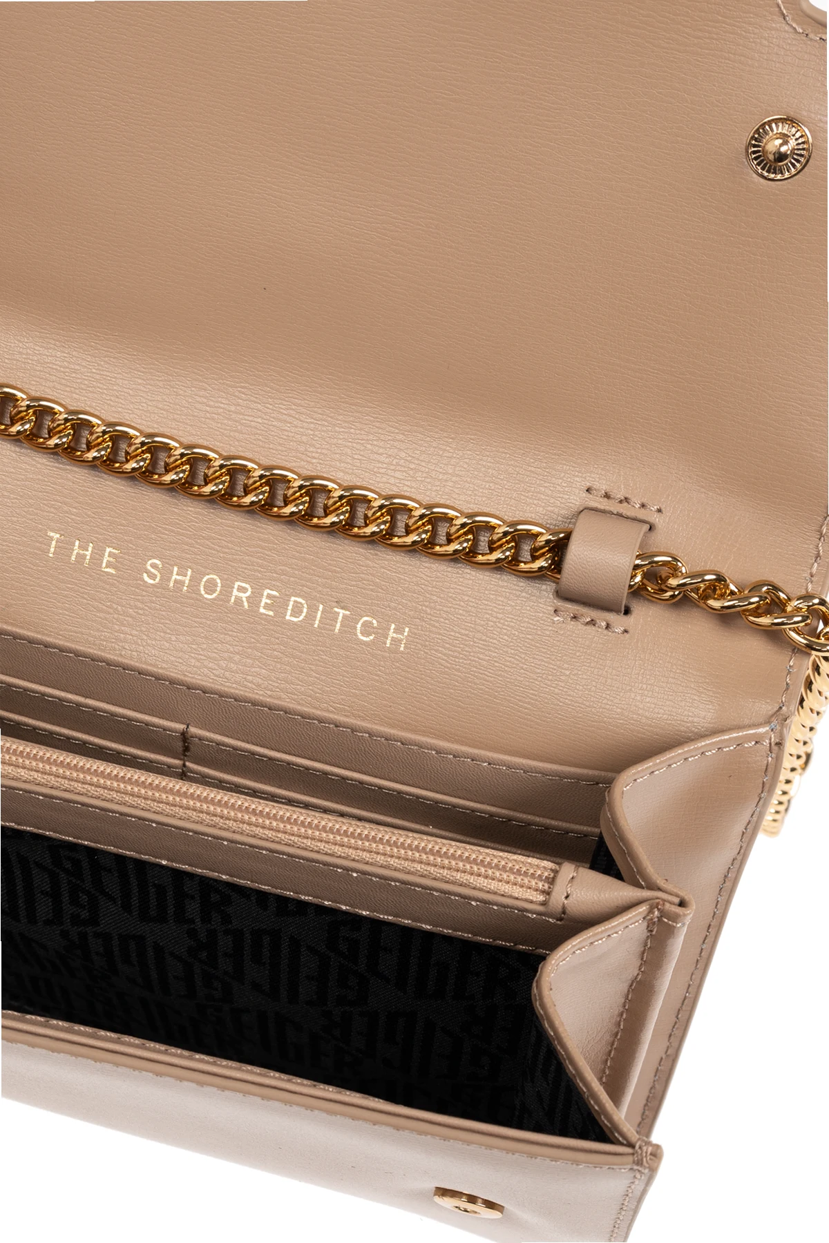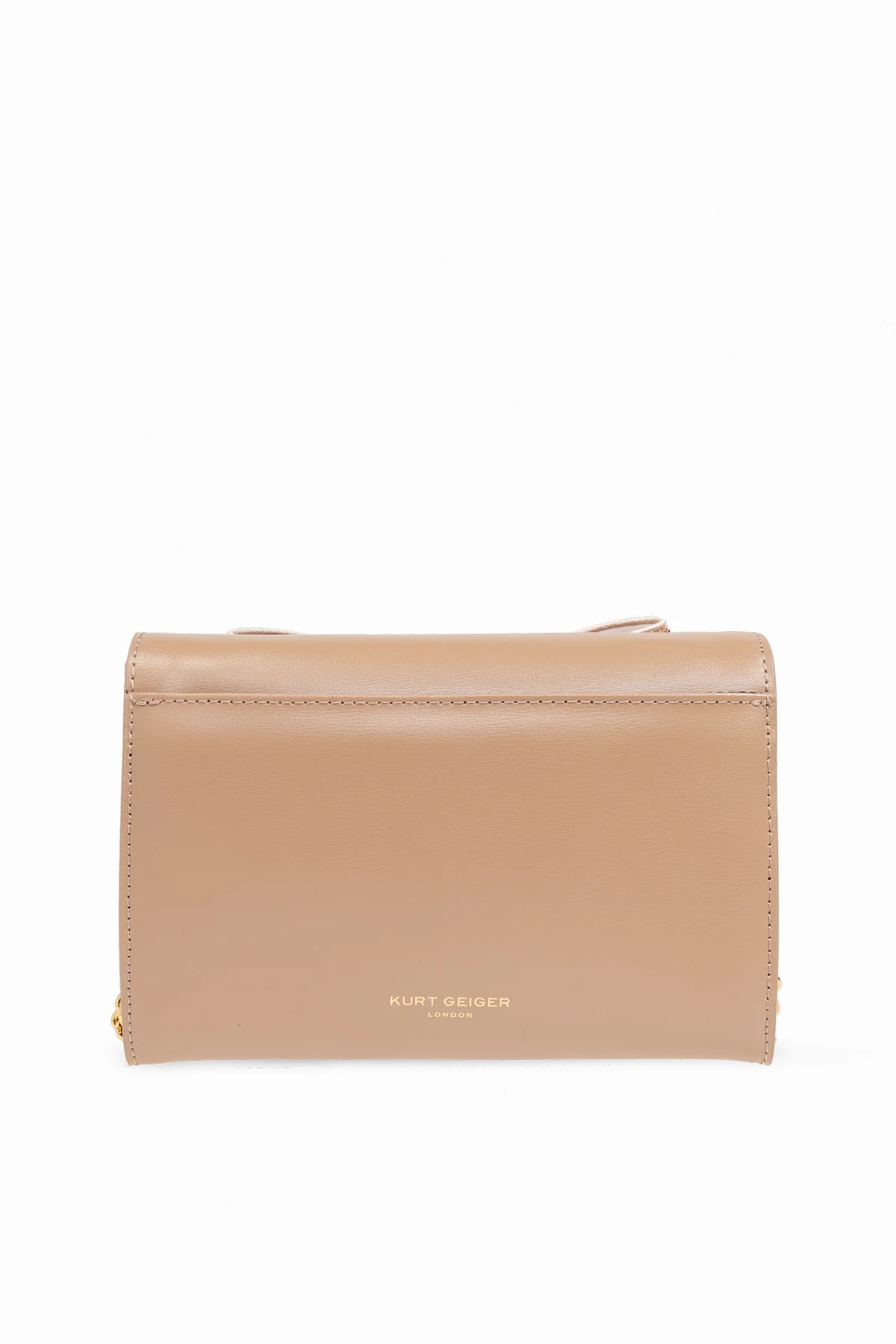 Środek kokardy zdobi złoty element z dodatkowymi kryształkami, co dodaje temu akcesorium niepowtarzalnego blasku. Portfel wyposażony jest w złoty łańcuszek, który pełni funkcję paska, zapewniając elegancję i praktyczność podczas noszenia. Wnętrze portfela kryje starannie wygrawerowany napis "THE SHOREDITCH", zaś tylną stronę zdobi subtelny napis "KURT GEIGER".