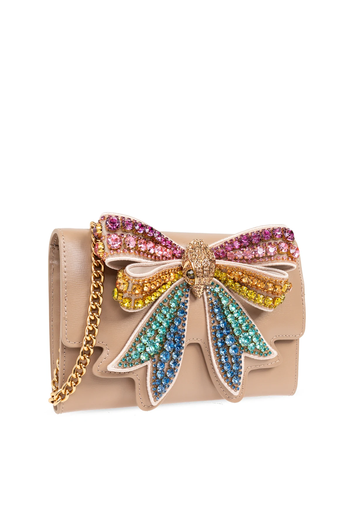 Ekskluzywny portfel na łańcuchu z kolekcji Kurt Geiger, noszący nazwę Bow Shoreditch , to kwintesencja wyrafinowanego stylu i funkcjonalności. Wykonany z beżowej skóry o gładkiej fakturze, zachwyca prostokątnym kształtem oraz gładkimi krawędziami. Na przedniej części portfela znajduje się imponująca, ozdobna kokarda, bogato zdobiona kolorowymi, błyszczącymi kryształkami w odcieniach różu, pomarańczu, żółci, zieleni i niebieskiego.