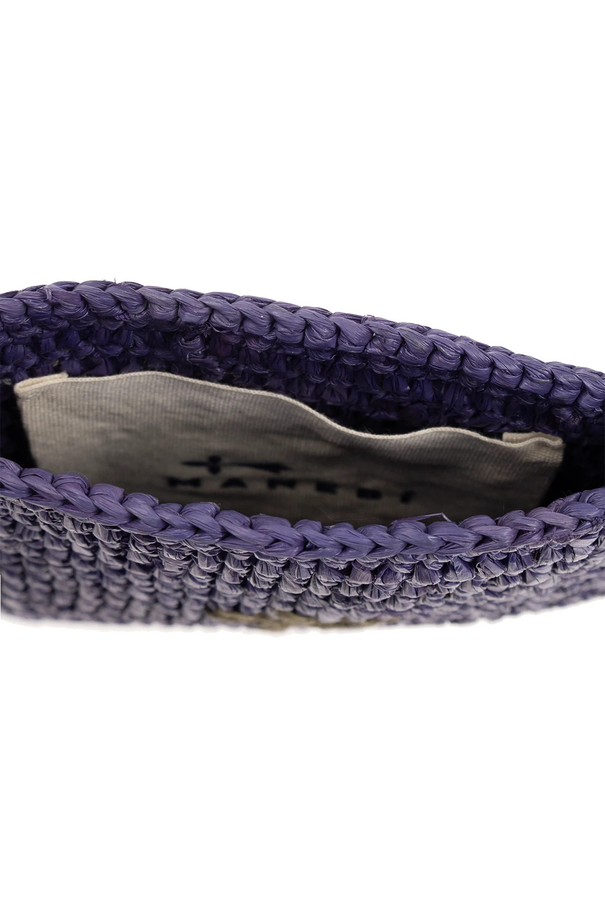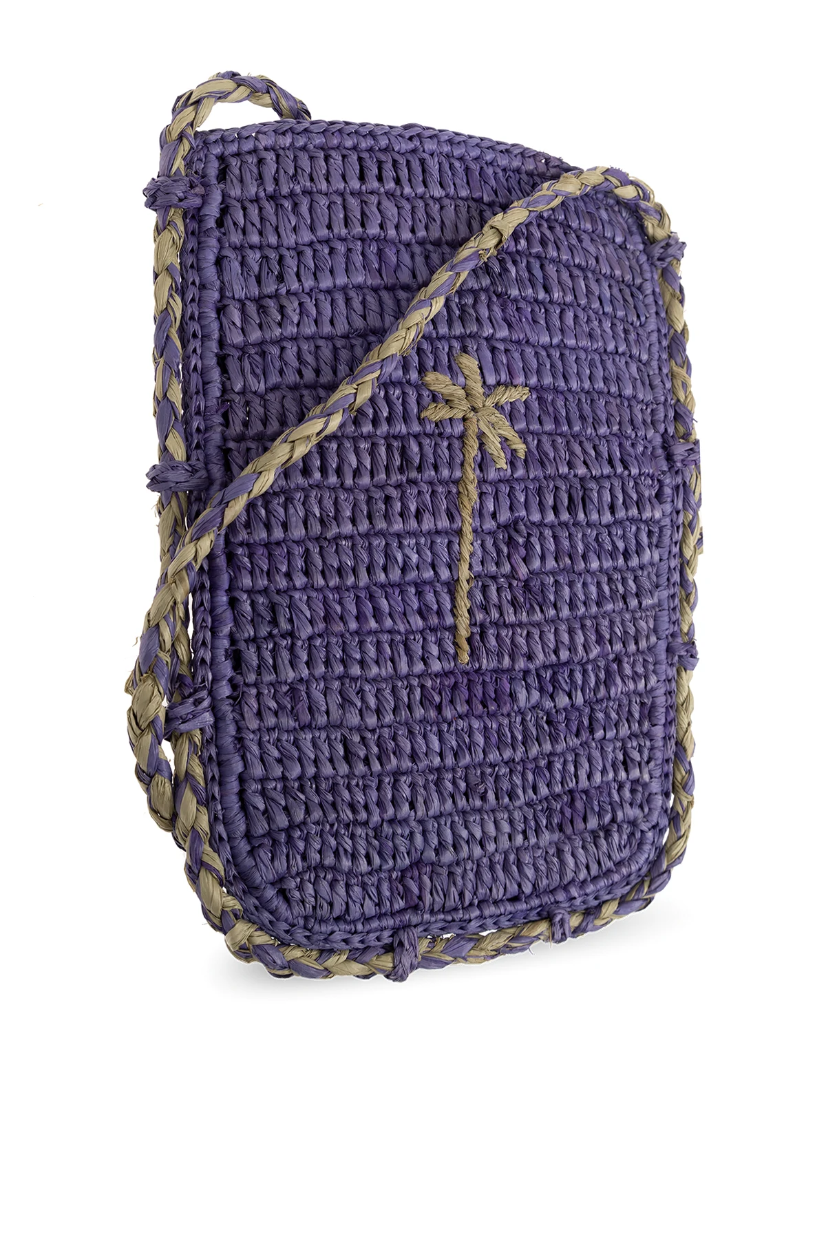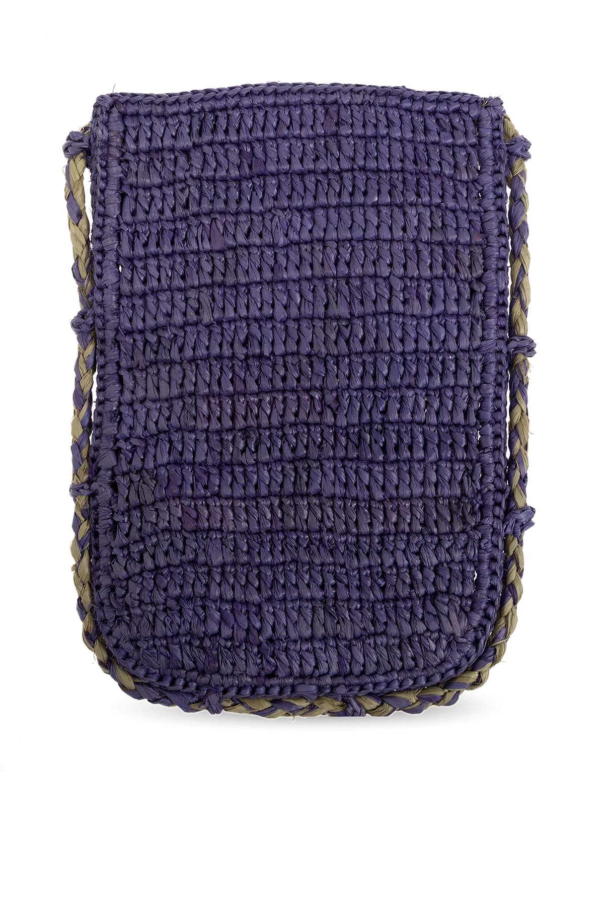 Fioletowe etui na pasku Manebi. Ręcznie pleciona z naturalnej rafii przez lokalne kobiety z Madagaskaru. Z przodu wyszyte logo w kolorze zielonym. Długi pas na ramię. Wewnątrz komora.