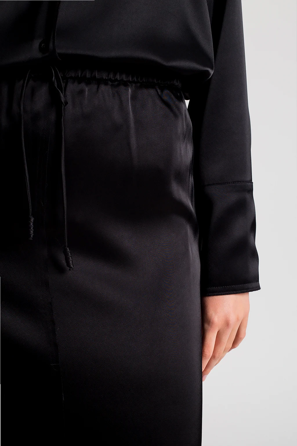 Czarna spódnica z surowym wykończeniem Nanushka. W pasie ściągana trokami. Ozdobiona marszczeniami.
