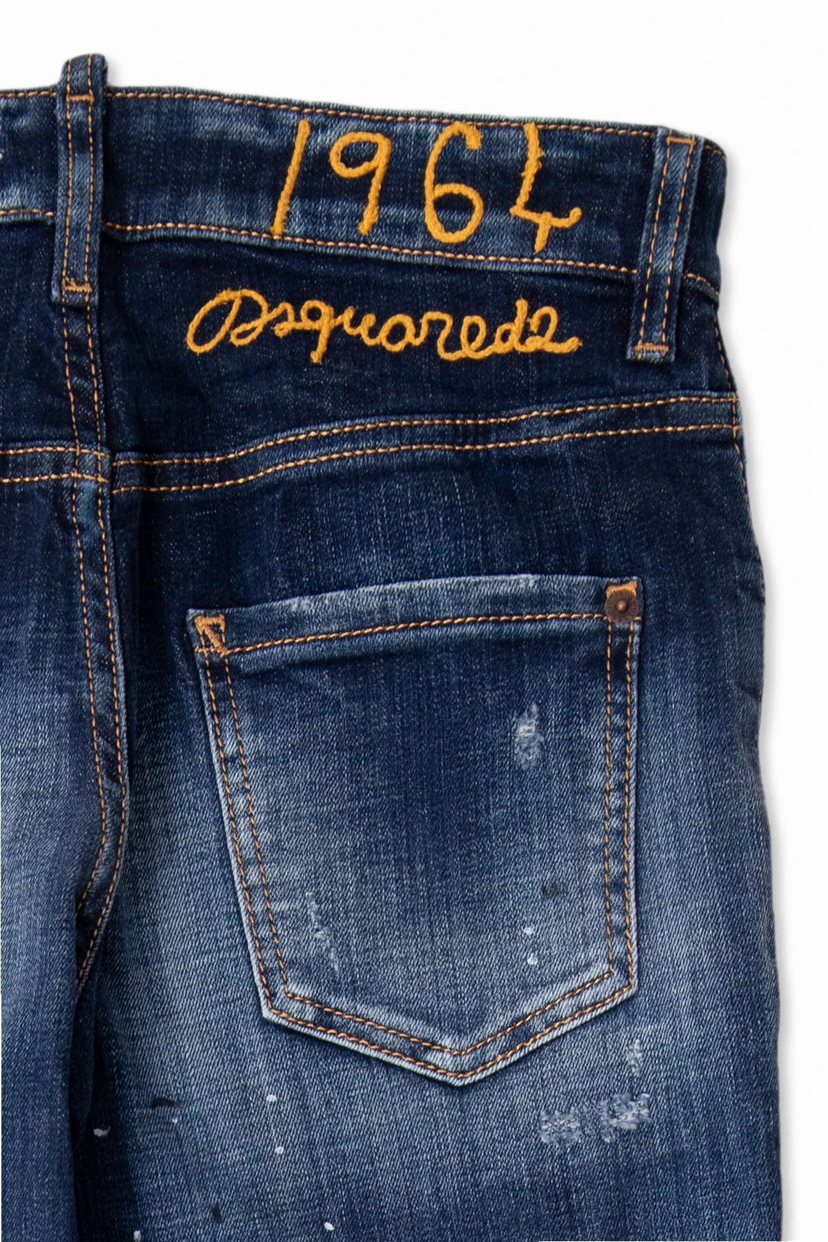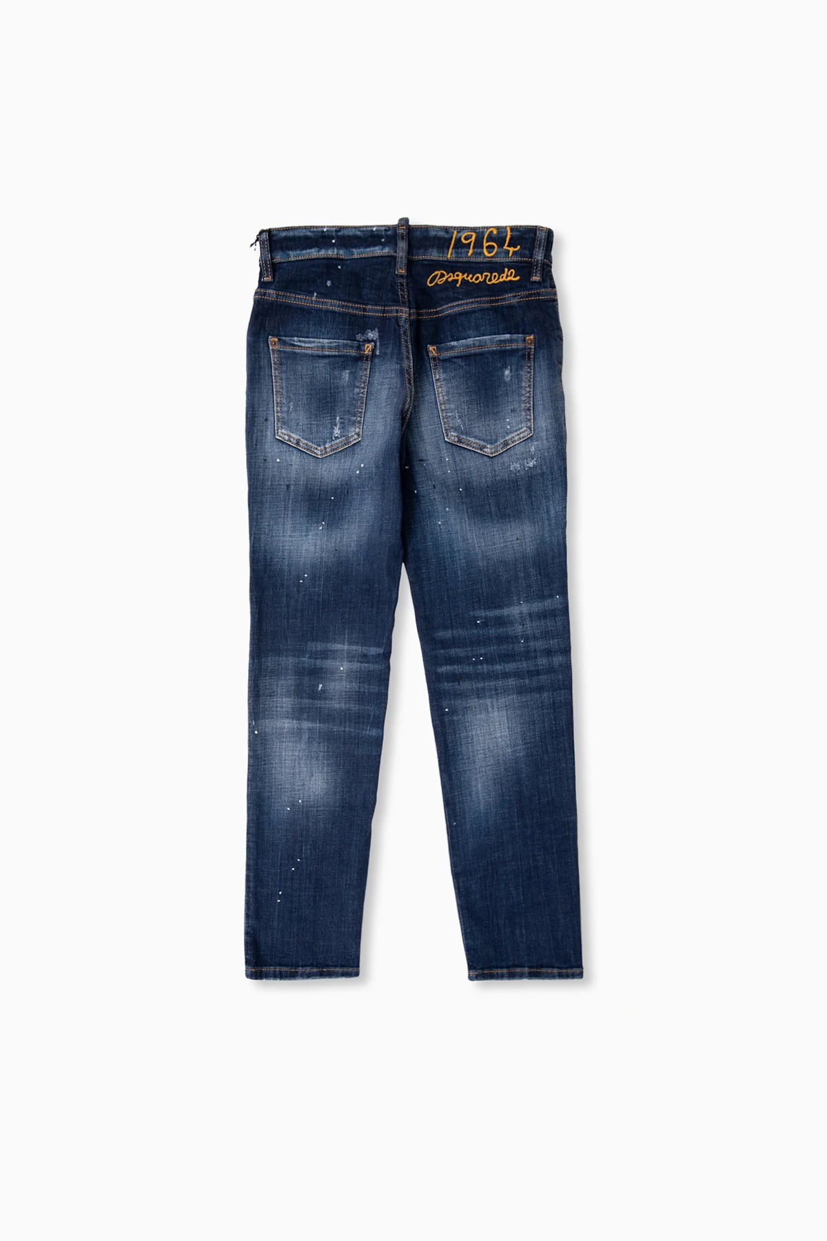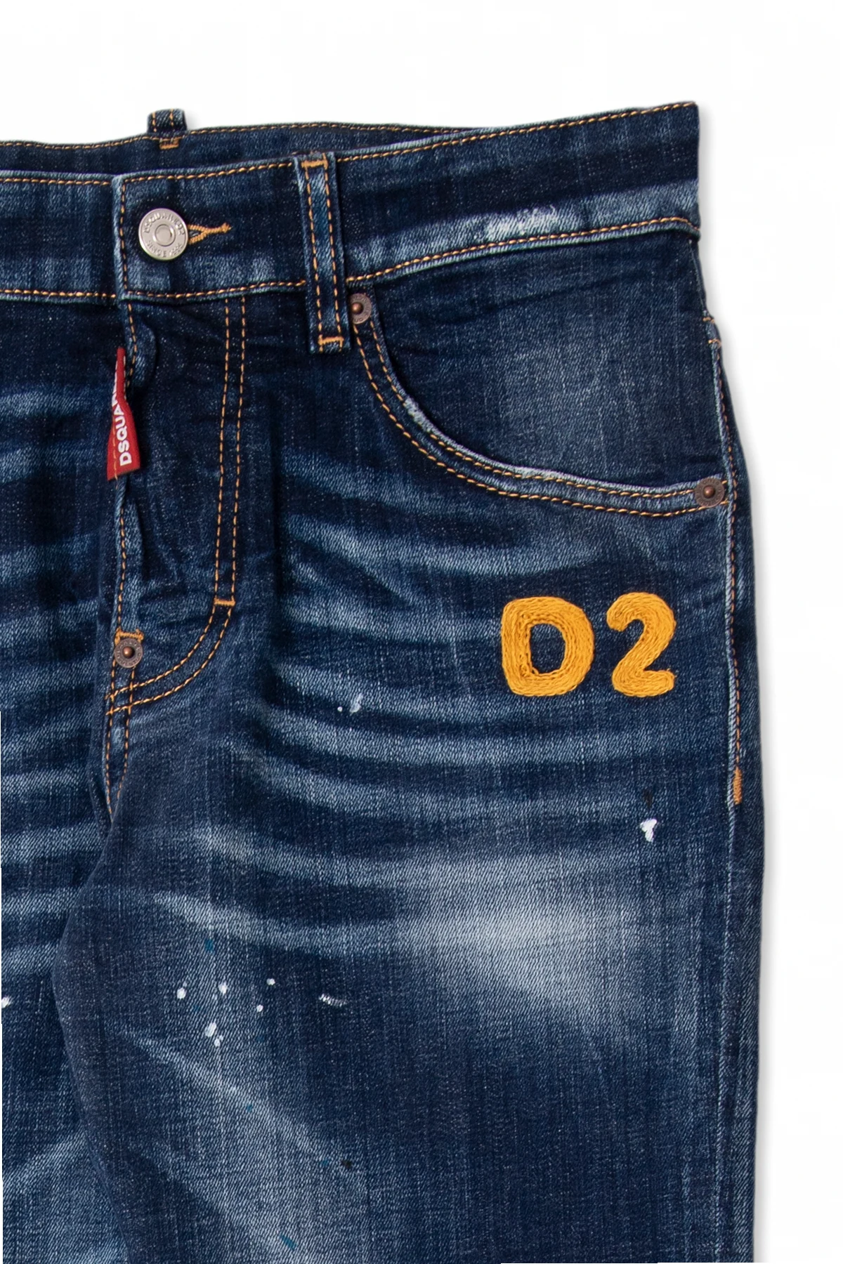 Granatowo-niebieskie jeansy, model ‘Stanislav’ Dsquared2 Kids. Zapinane na guziki. Charakterystyczne przetarcia i plamy po farbie. Ozdobione wyszytym logo w kolorze żółtym. Lekko zwężane nogawki.