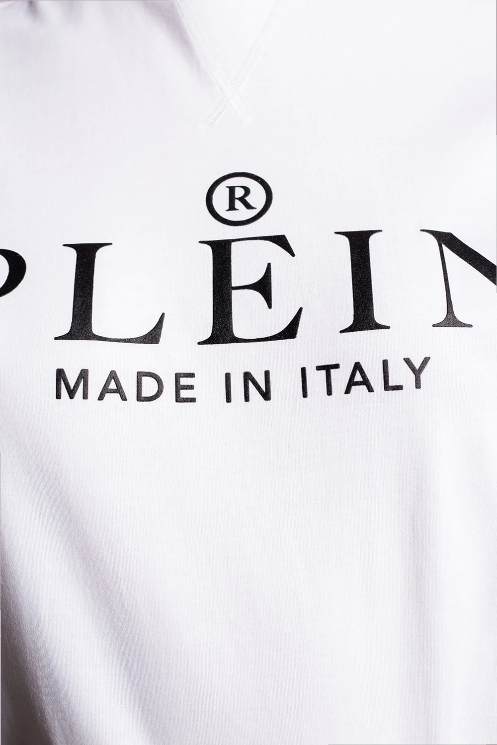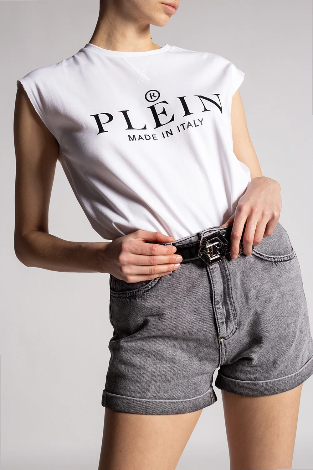 Biały t-shirt bez rękawów Philipp Plein. Wykonany z bawełny. Nadrukowane logo w kolorze czarnym. Na ramieniu dekoracyjne guziki w kolorze srebrnym. Okrągły dekolt.