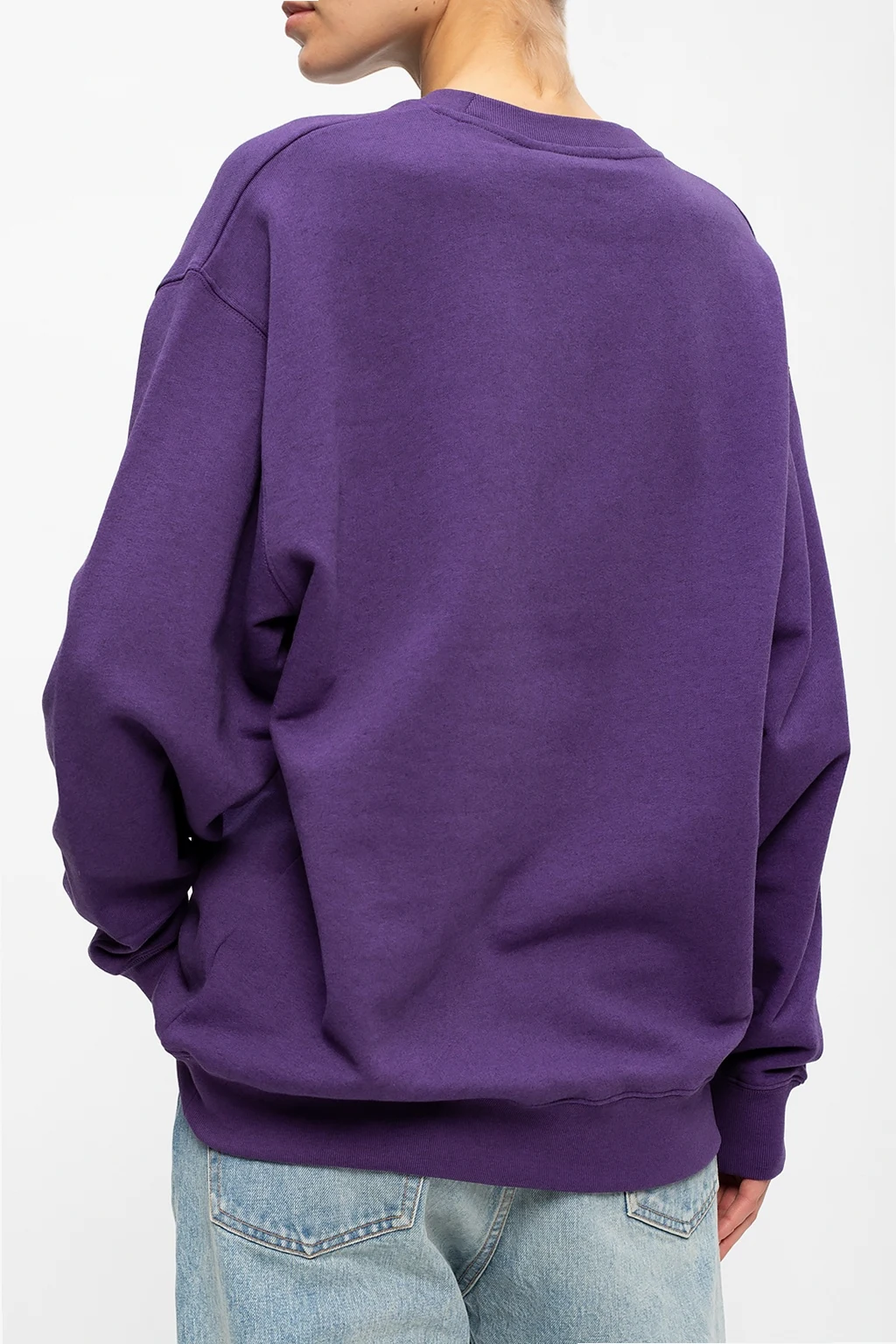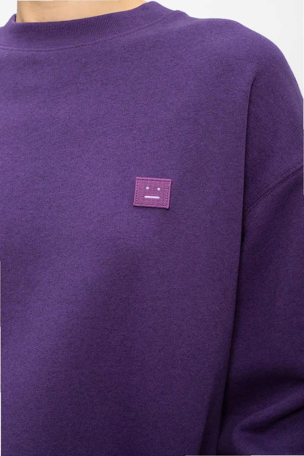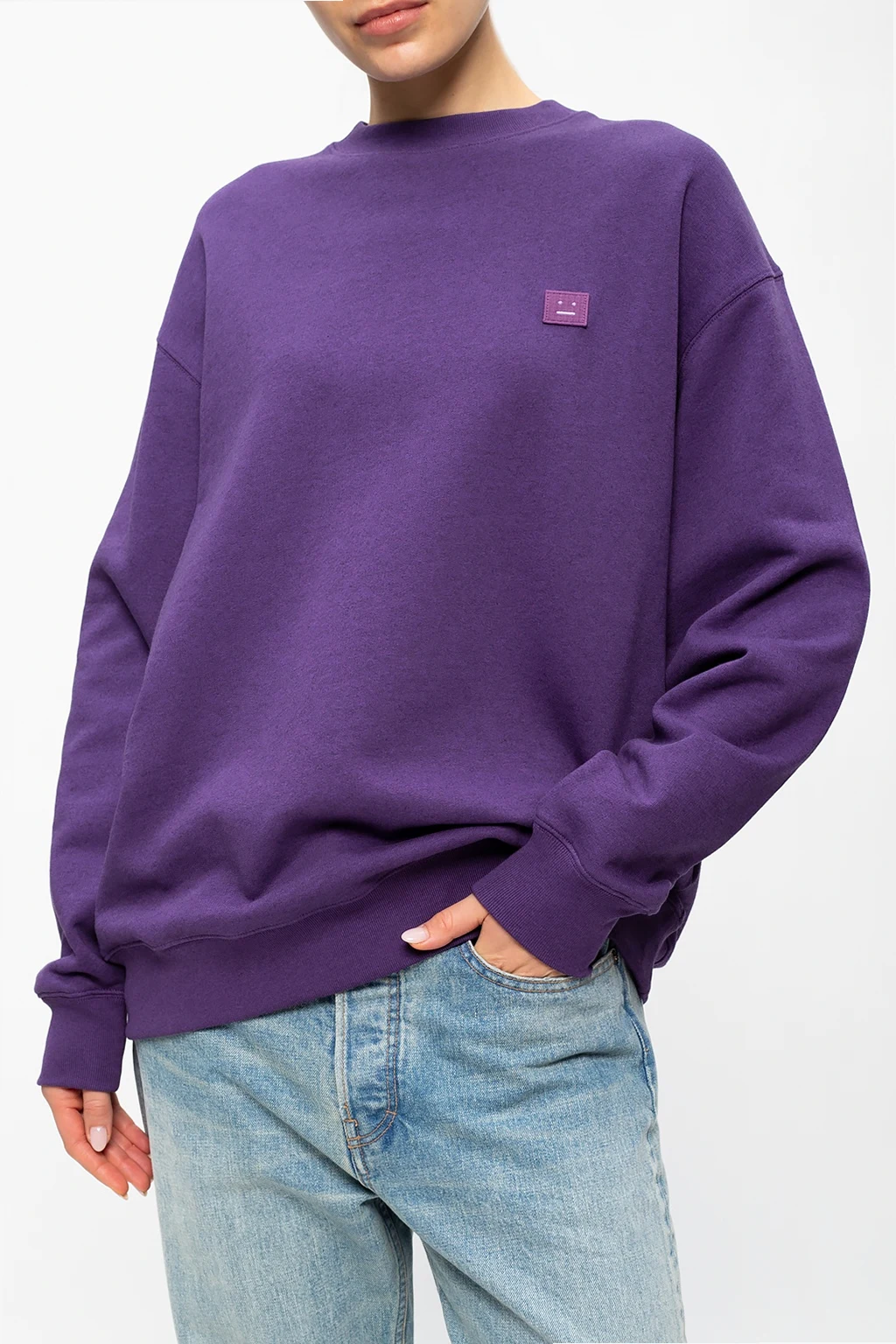 Fioletowa, bawełniana bluza Acne Studios. Ozdobiona naszywką z logo. Okrągły dekolt. Dół oraz rękawy zakończone ściągaczami.