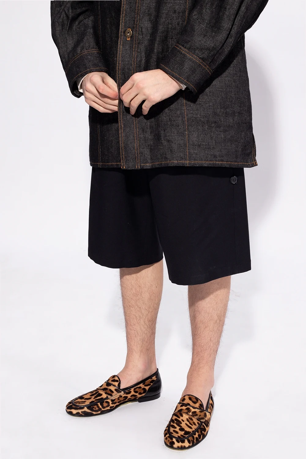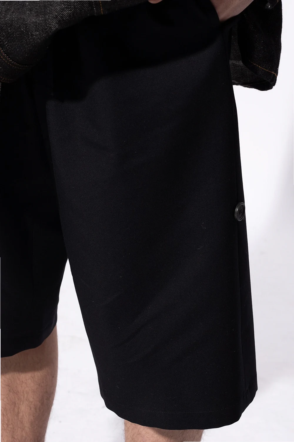 Czarne, wełniane szorty Loewe. Zapinane na guziki oraz na zaczep. Ściągane trokami. Ozdobione wyszytym logo. Z przodu dwie wsuwane kieszenie. Z tyłu kieszeń zapinana na guzik.