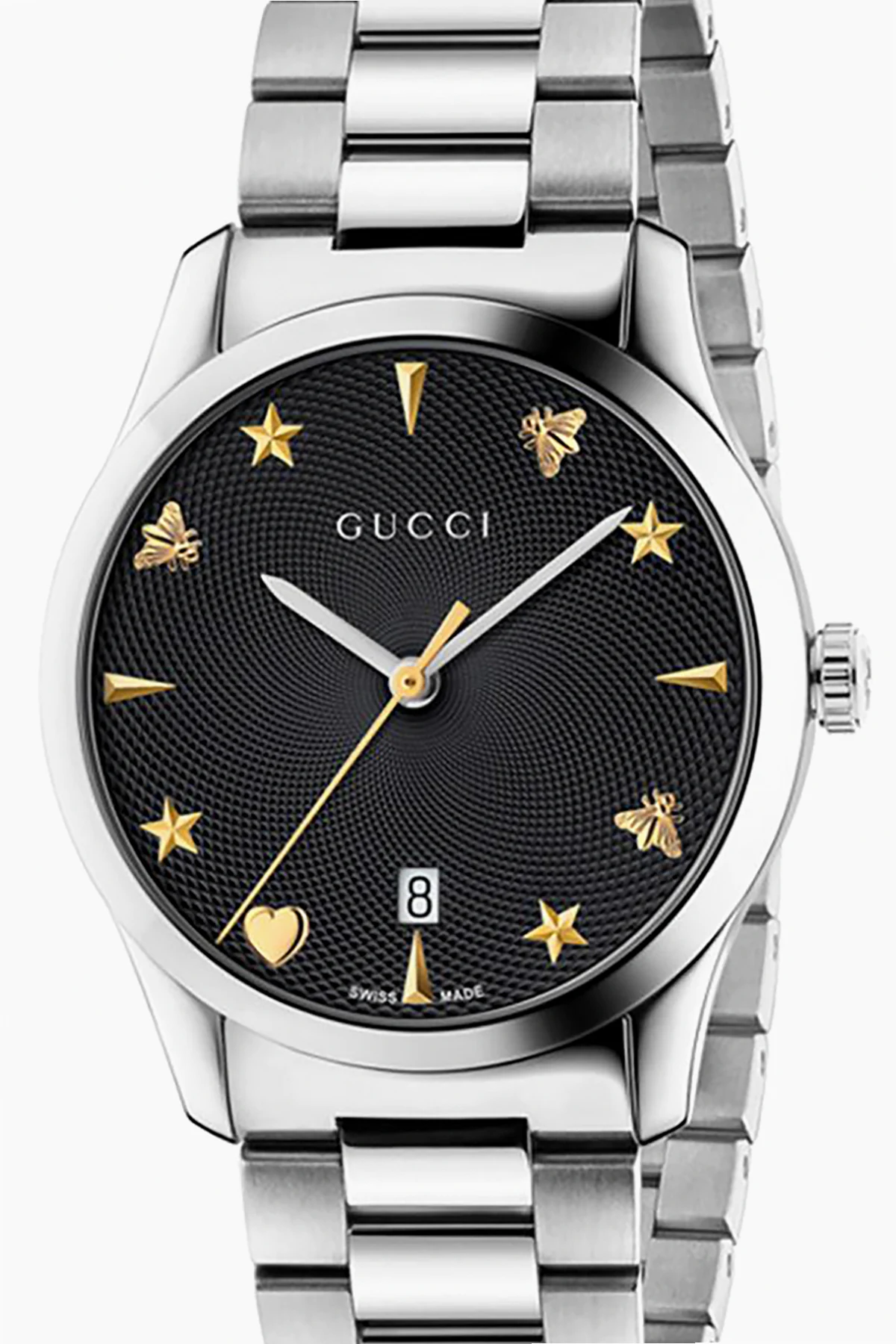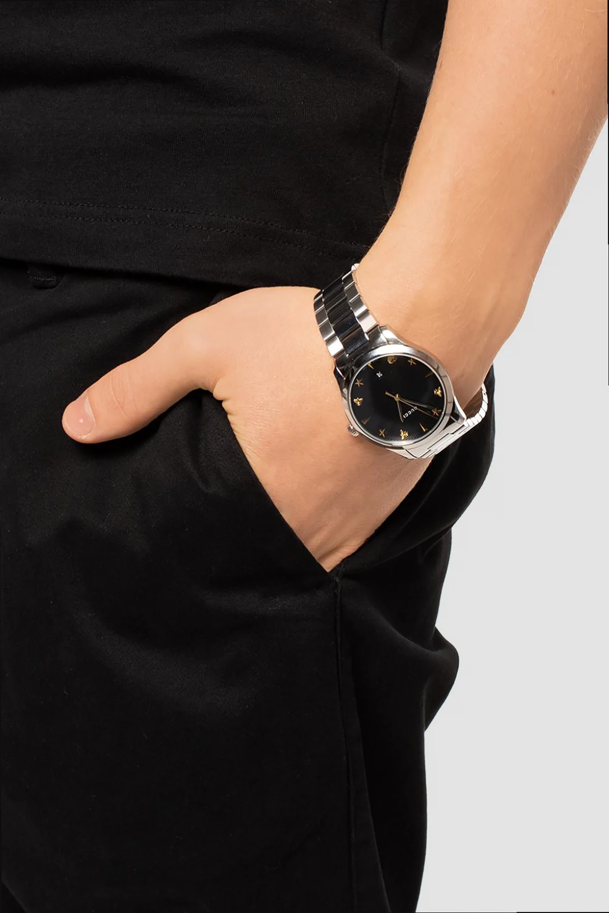 Srebrno-czarny zegarek 'G-Timeless' Gucci. Wykonany ze stali nierdzewnej. Tarcza ozdobiona metalowymi elementami w kolorze złotym oraz logo. Mechanizm kwarcowy. Wodoodporny do 50 metrów.