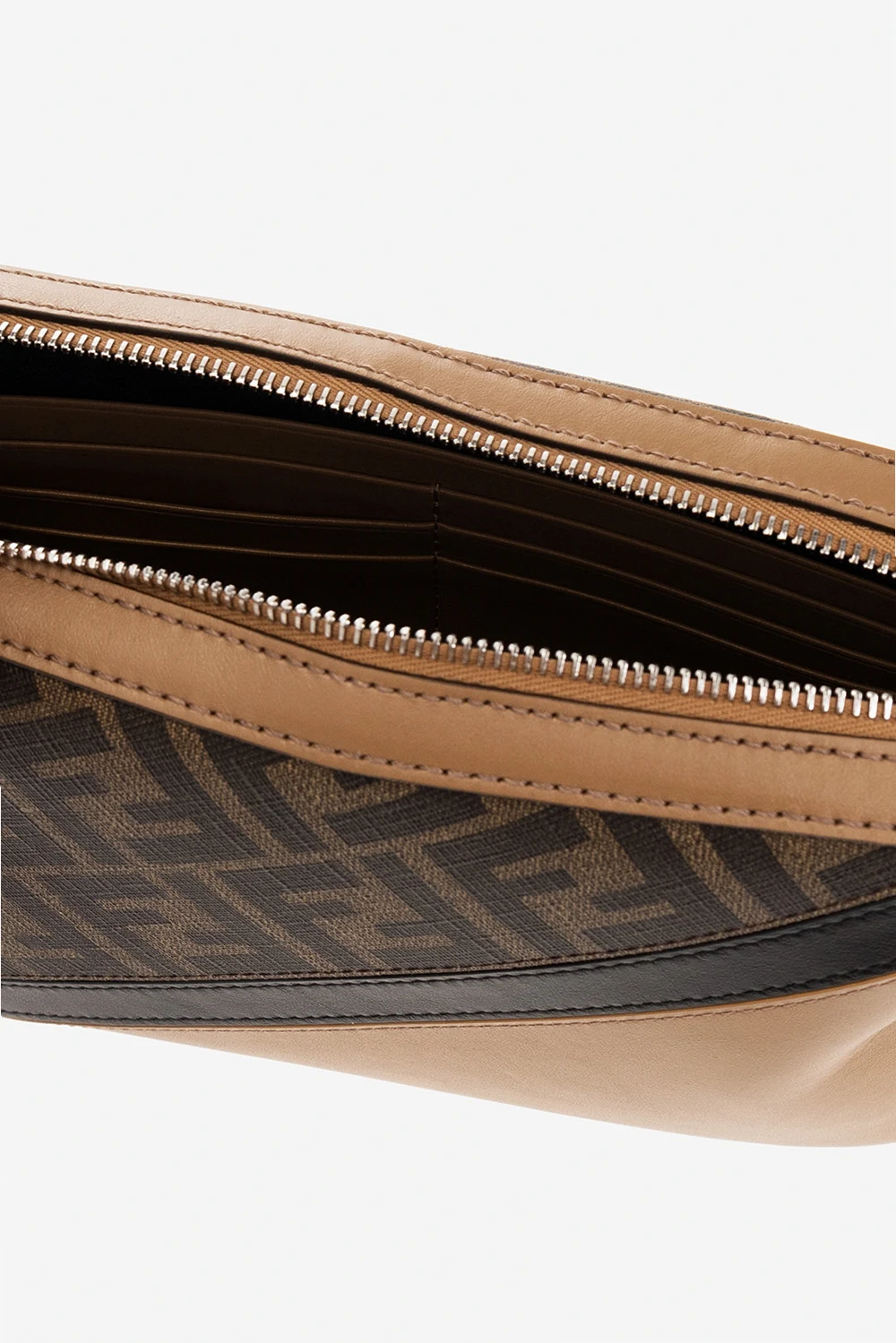 Brązowa torba na ramię Fendi. Wykonana ze skóry cielęcej. Wykończona płótnem z nadrukowanym wzorem z monogramem. Zapinana na zamek. Odpinany pasek na ramię z możliwością regulacji. Wewnątrz komora, wsuwana kieszeń oraz sześć miejsc na karty.