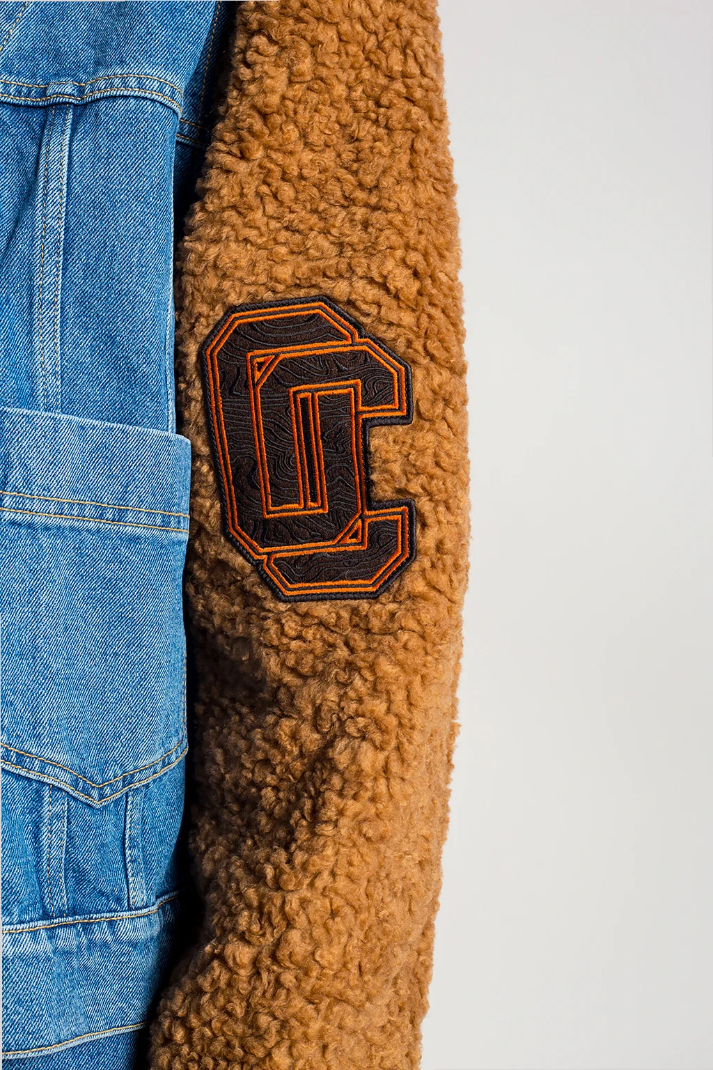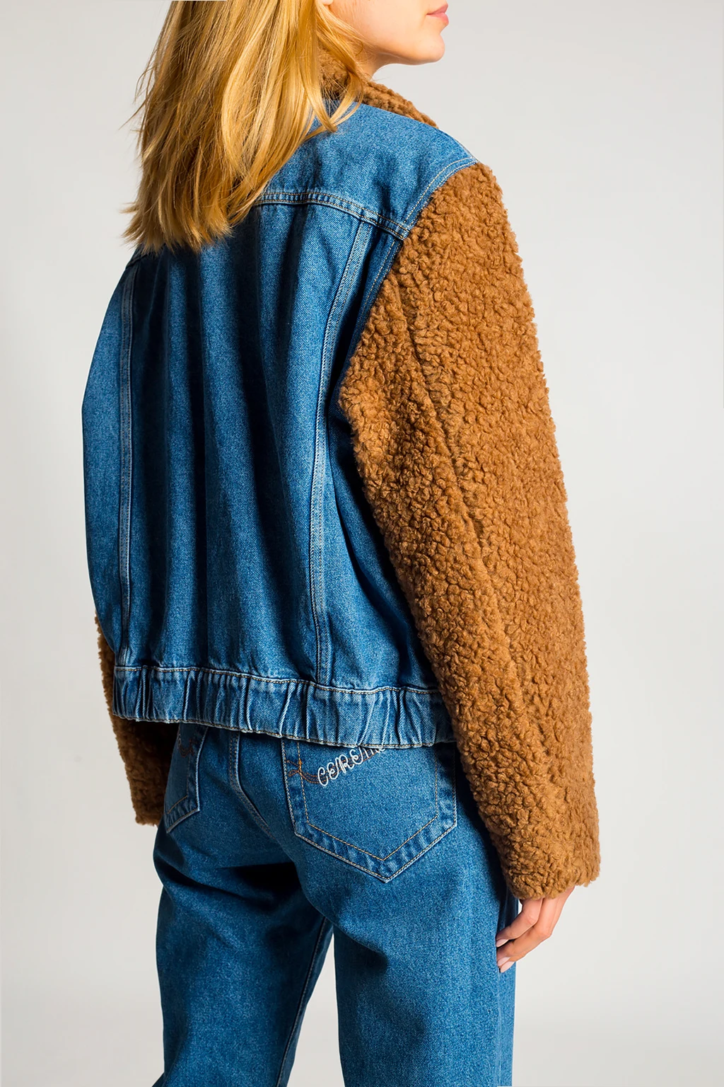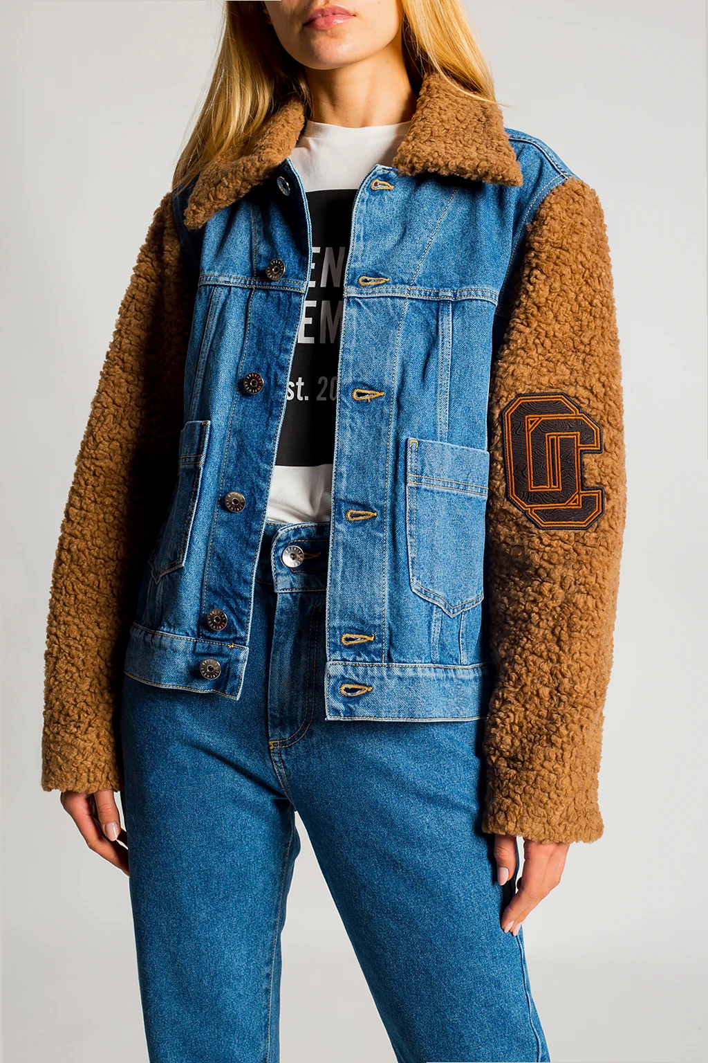 Niebiesko-brązowa kurtka jeansowa Opening Ceremony. Zapinana na guziki. Z przodu dwie wsuwane kieszenie. Ozdobne przeszycia. Na rękawie naszywka z logo. Kołnierz oraz rękawy wykończone materiałem imitującym futro. Dół wykończony ściągaczem.