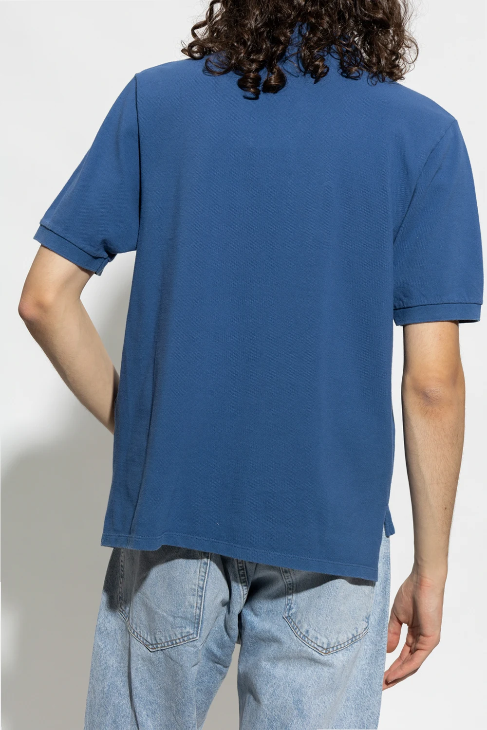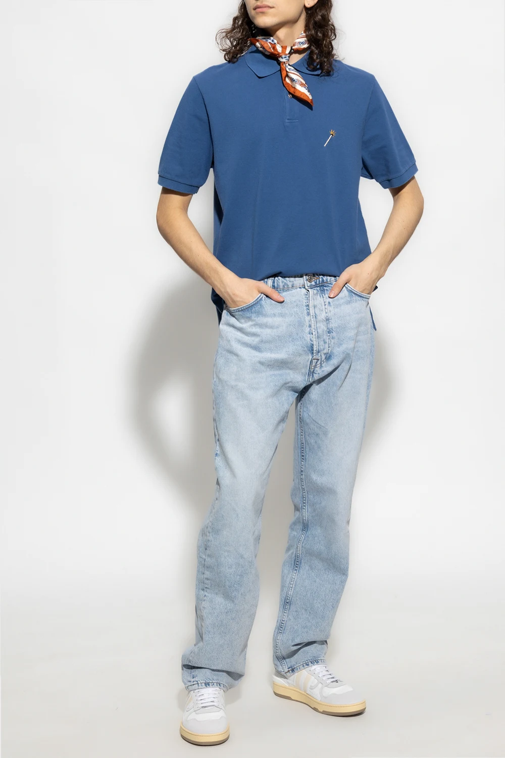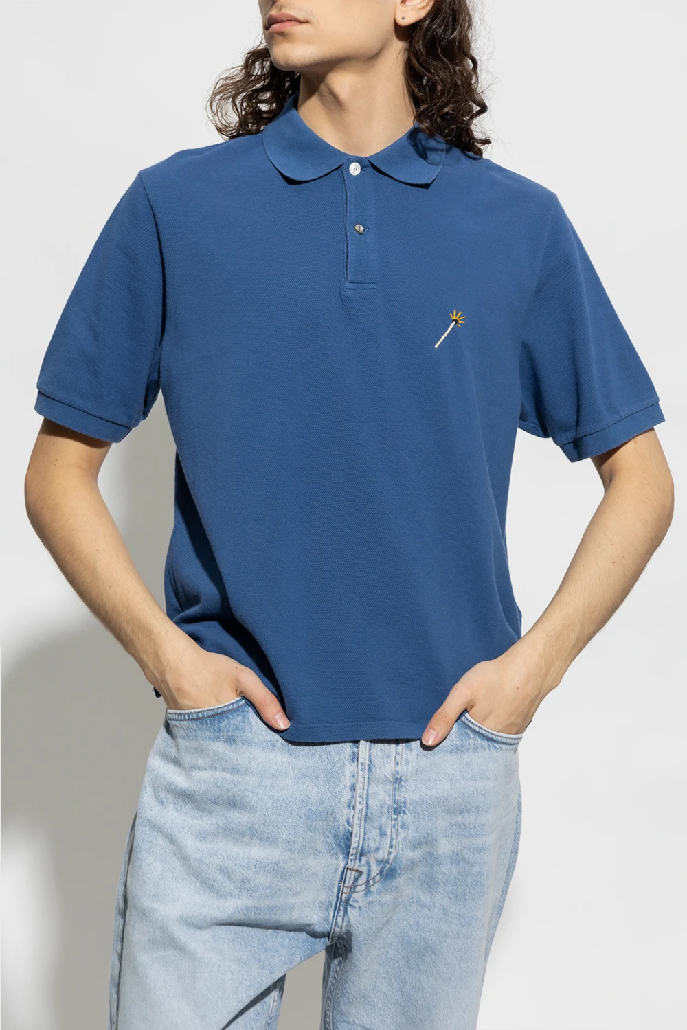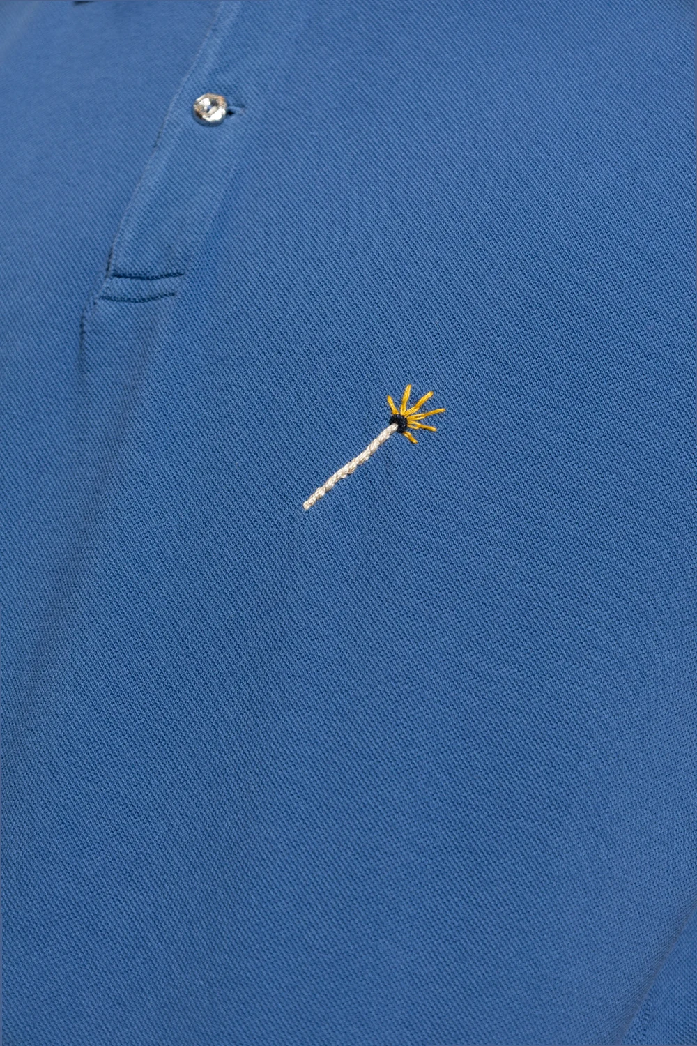 Niebieskie, bawełniane polo Nick Fouquet. Dekolt z kołnierzem zapinany na guziki. Z przodu ozdobione kolorowym haftem. Po bokach rozcięcie. Krótkie rękawy.