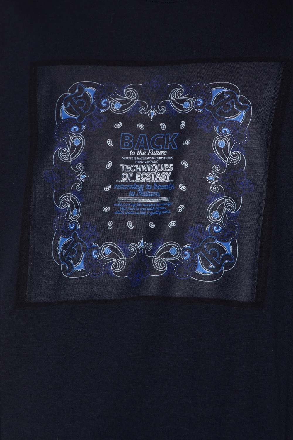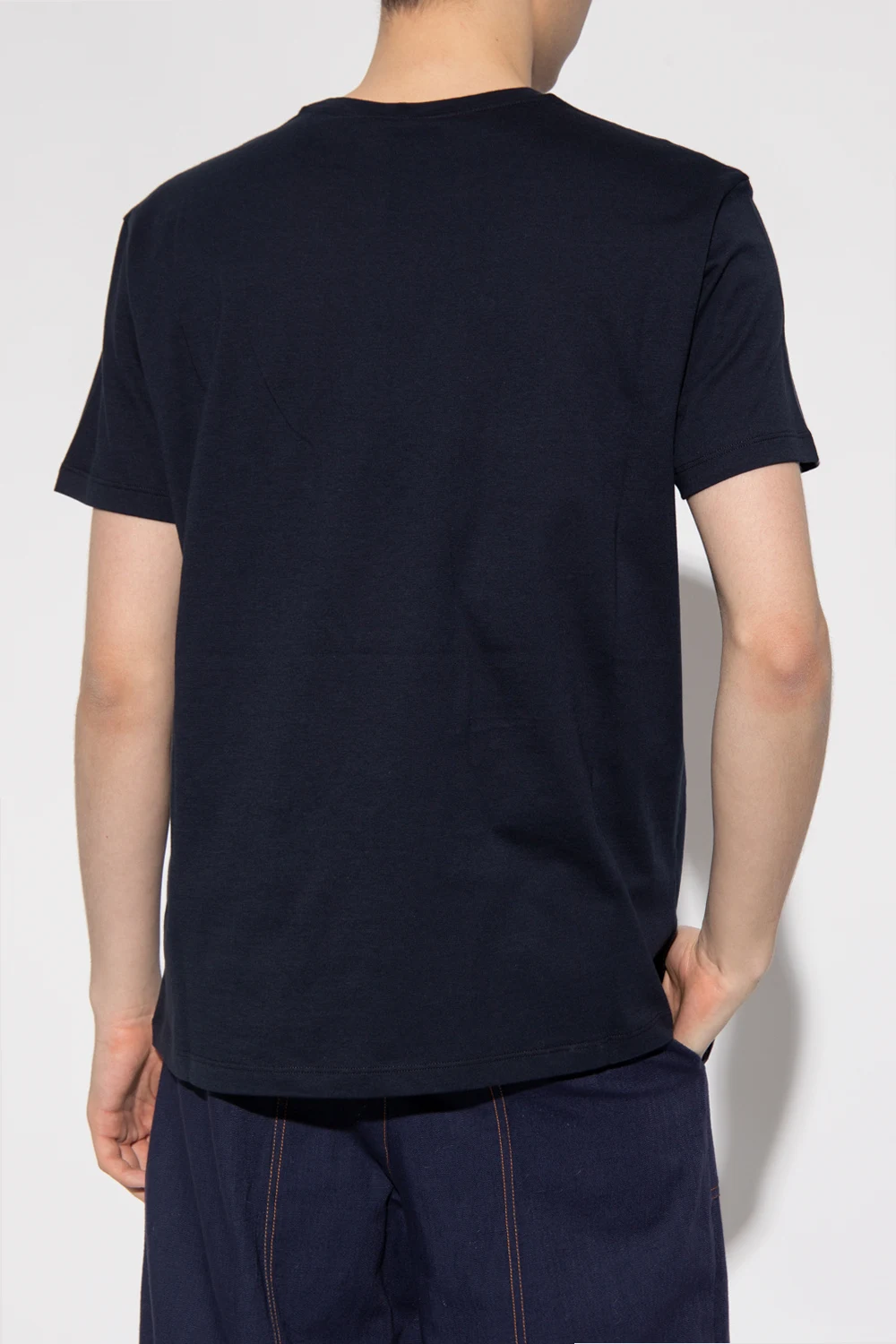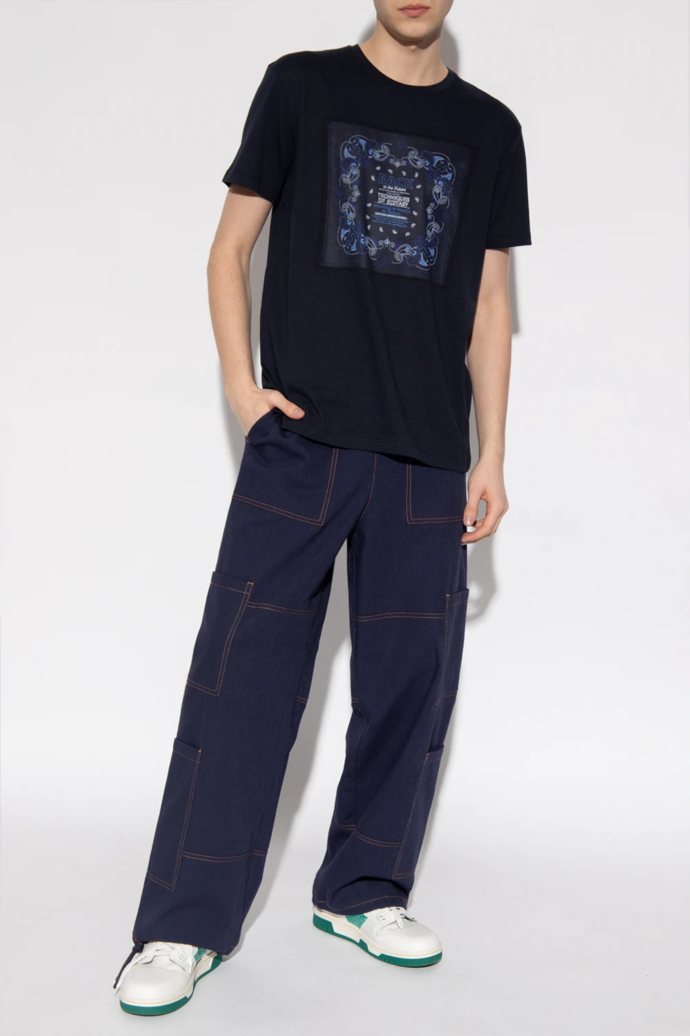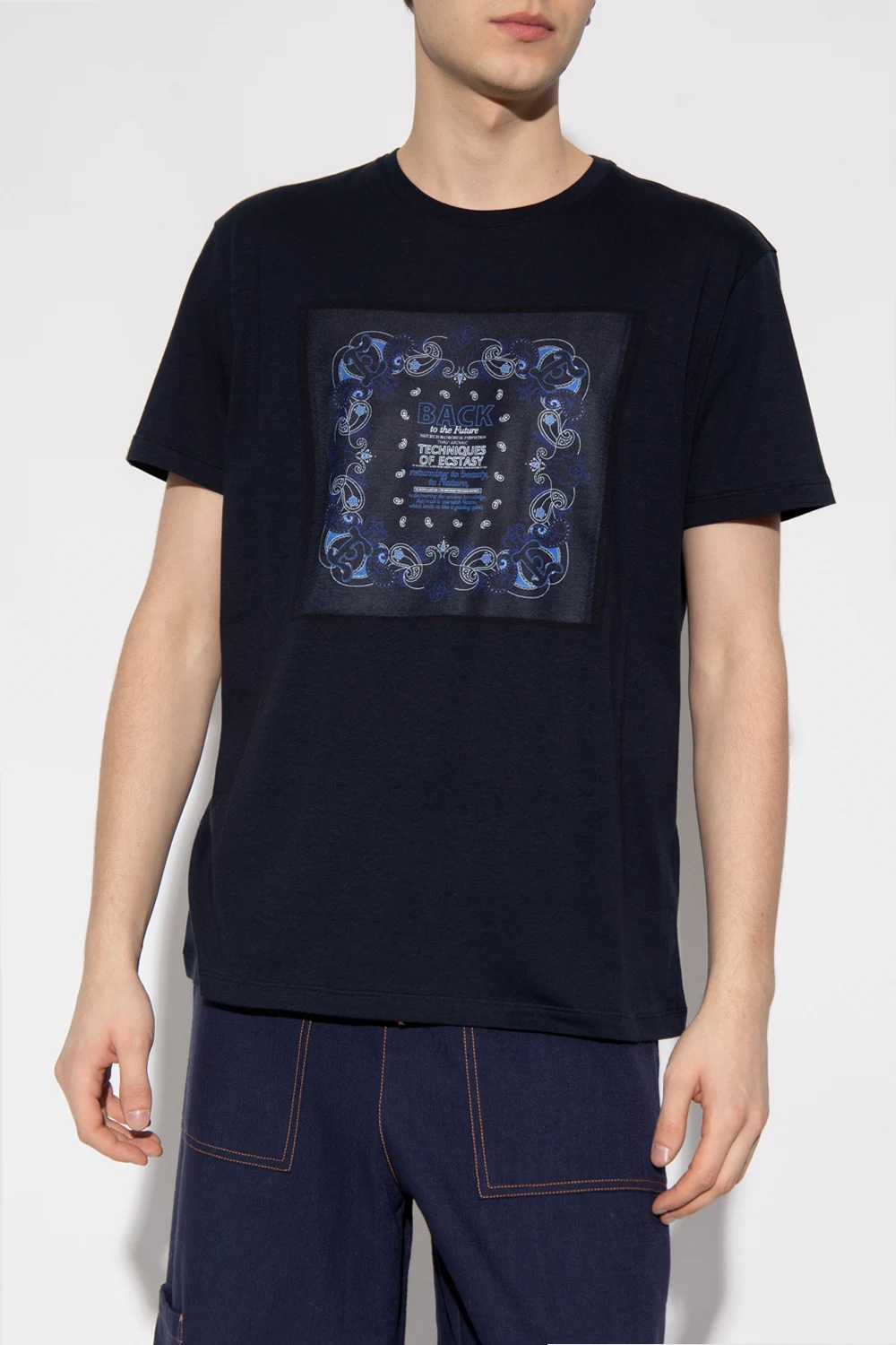 Granatowy, bawełniany t-shirt Etro. Ozdobiony z przodu wyszytym wzorem z motywem ‘paisley’ w kolorze granatowo-biało-niebieskim. Okrągły dekolt wykończony ściągaczem, krótkie rękawy.
