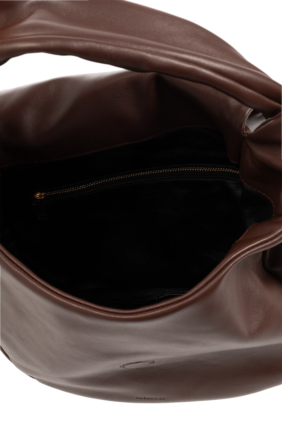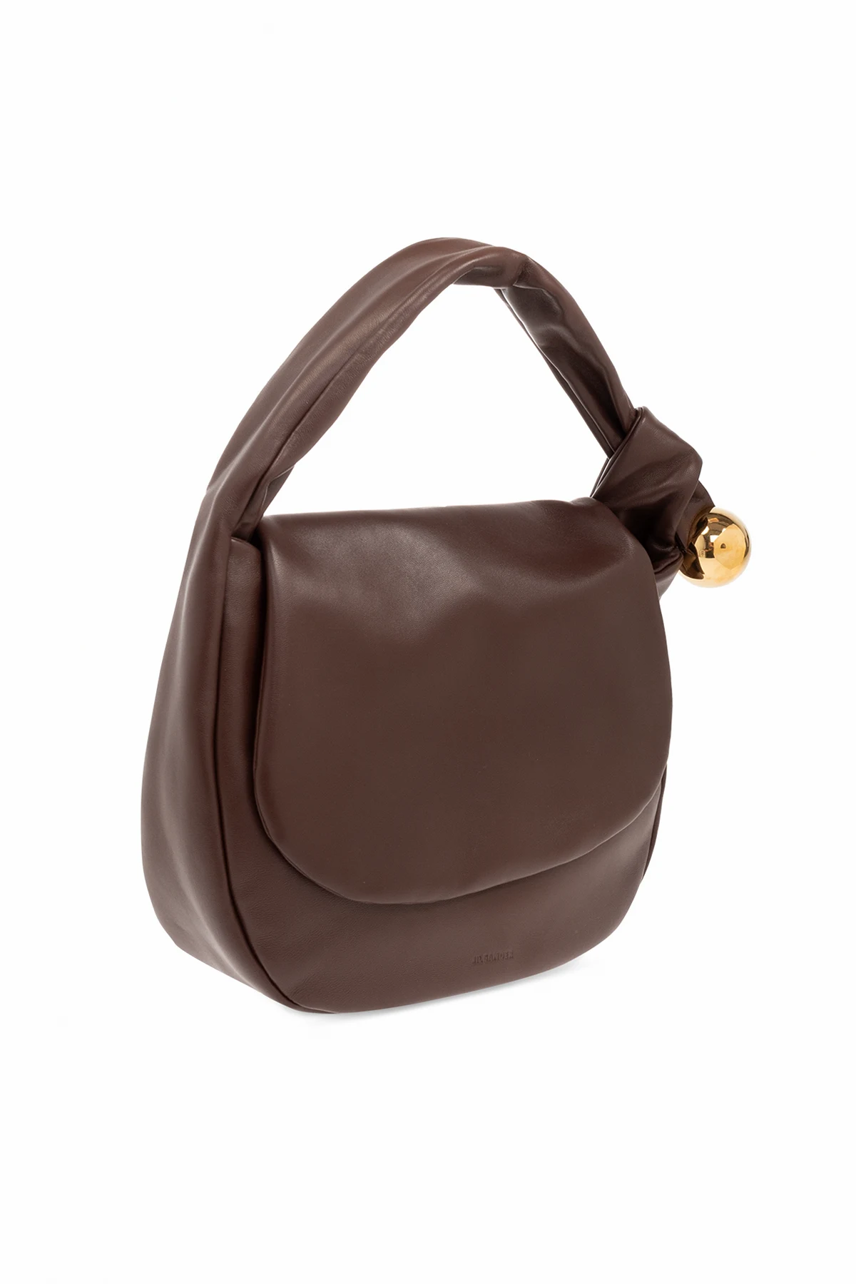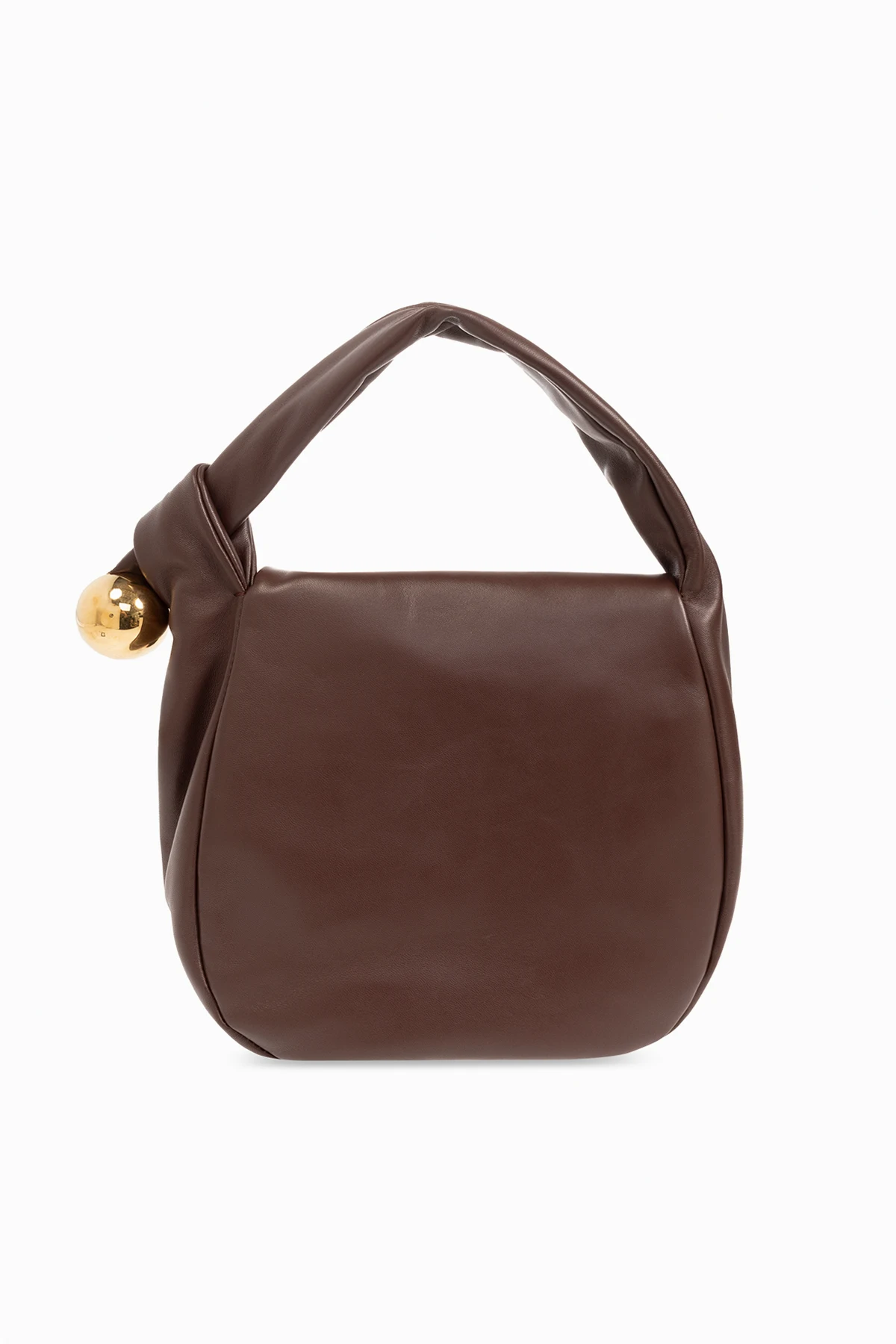 Brązowa torba do ręki, model ‘Sphere’ JIL SANDER. Wykonana ze skóry owczej. Zamykana na magnetyczny zatrzask. Z przodu wytłoczone logo. Rączka z dekoracyjną, metalową kulą w kolorze złotym. Wewnątrz komora z kieszenią zamykaną na zamek.