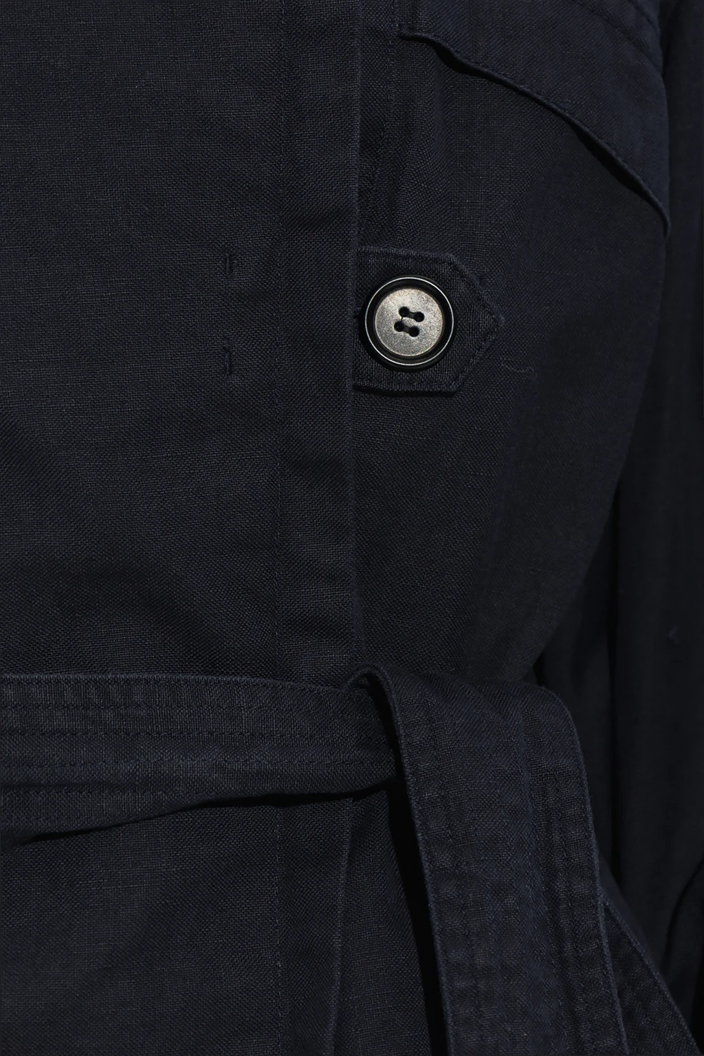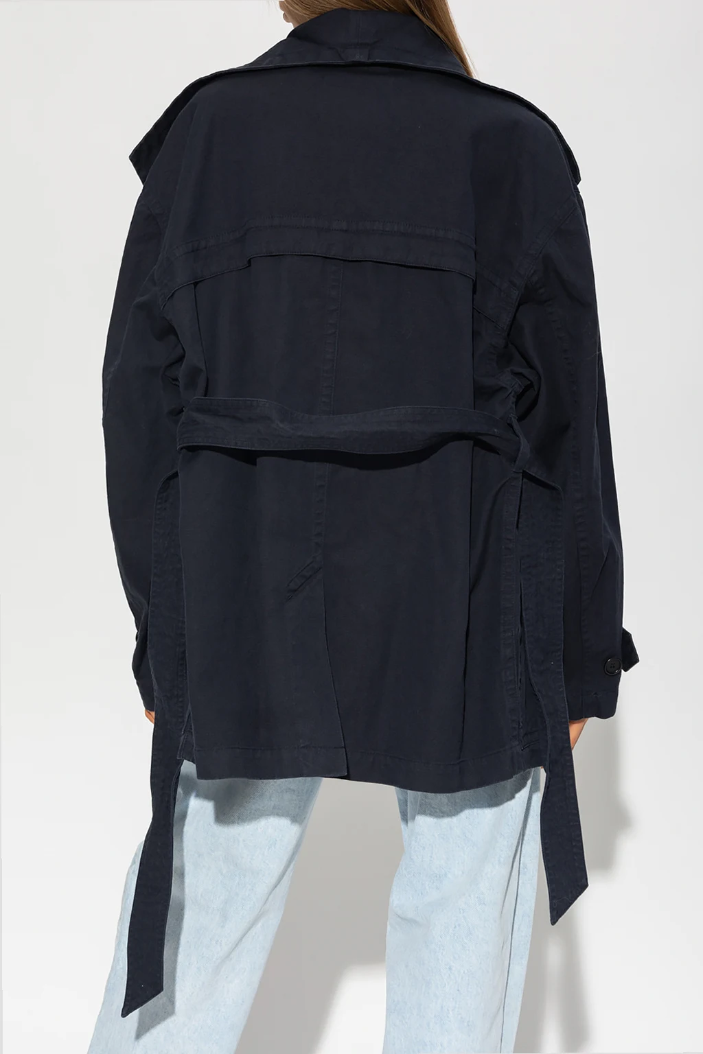 Granatowy, krótki płaszcz, model ‘Peachy’ Marant Étoile. Wykonany z bawełny organicznej i lnu. Zapinany na guziki oraz wiązany w talii pasem. Dwie wsuwane kieszenie. Długie rękawy zakończone mankietami zapinanymi na pasek z guzikiem. Z tyłu pojedyncze rozcięcie.