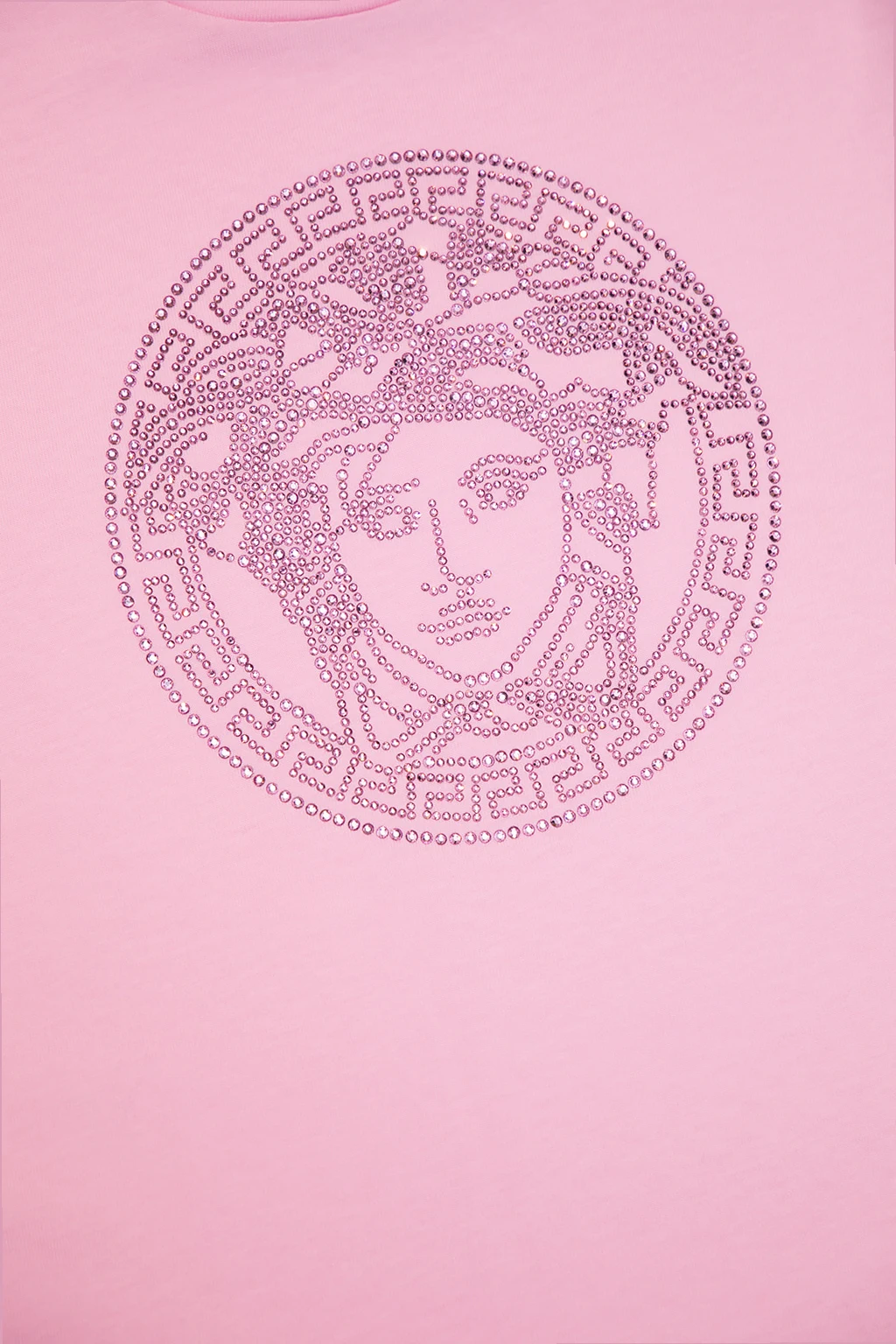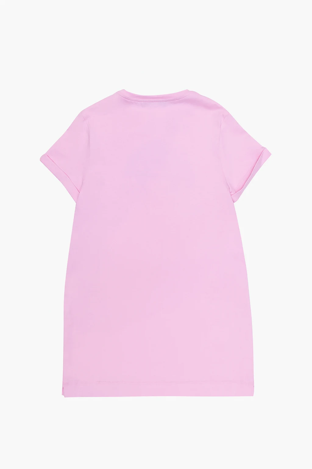 Jasnoróżowa sukienka z krótkimi rękawami Versace Kid. Wykonana z bawełny. Z przodu dekoracyjna, połyskująca aplikacja z charakterystycznym dla marki motywem głowy Meduzy. Okrągły dekolt.