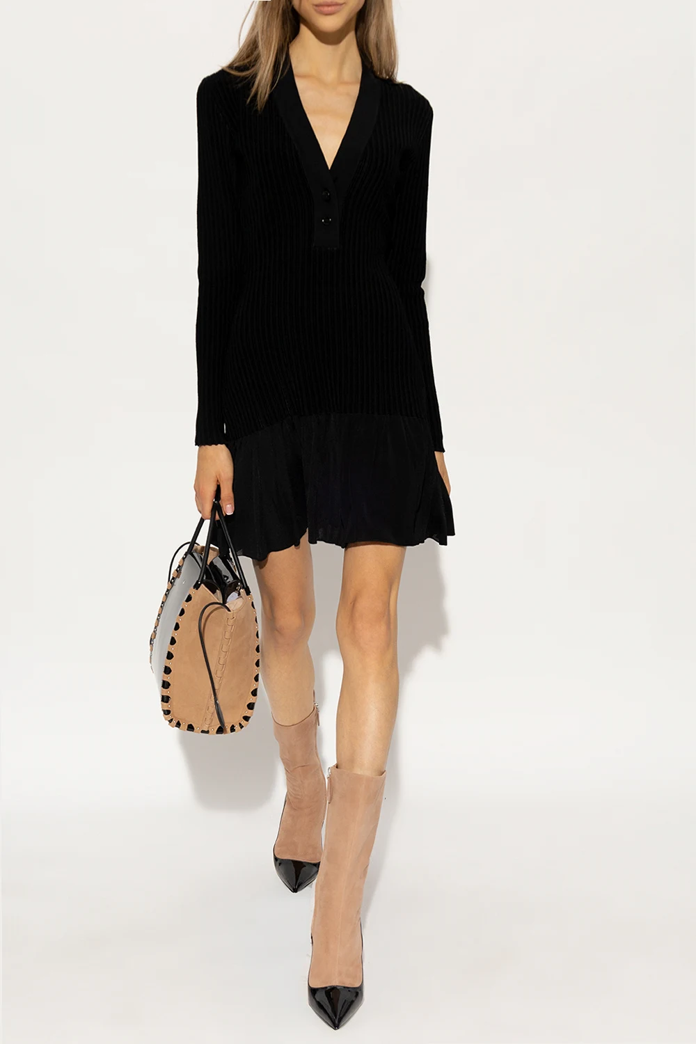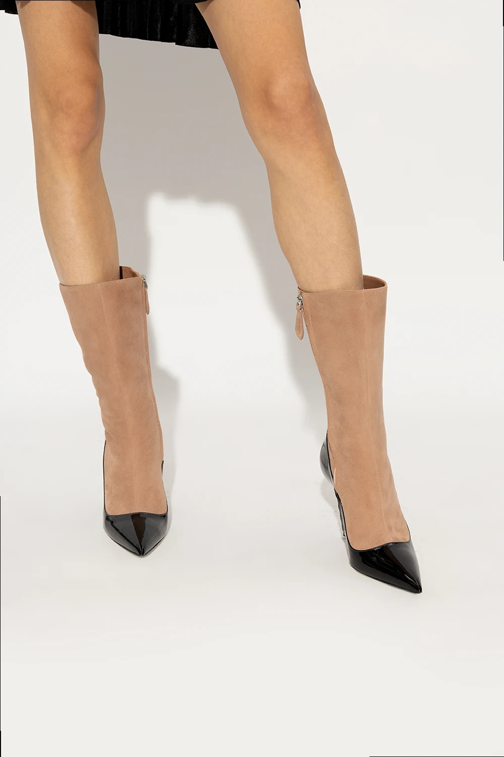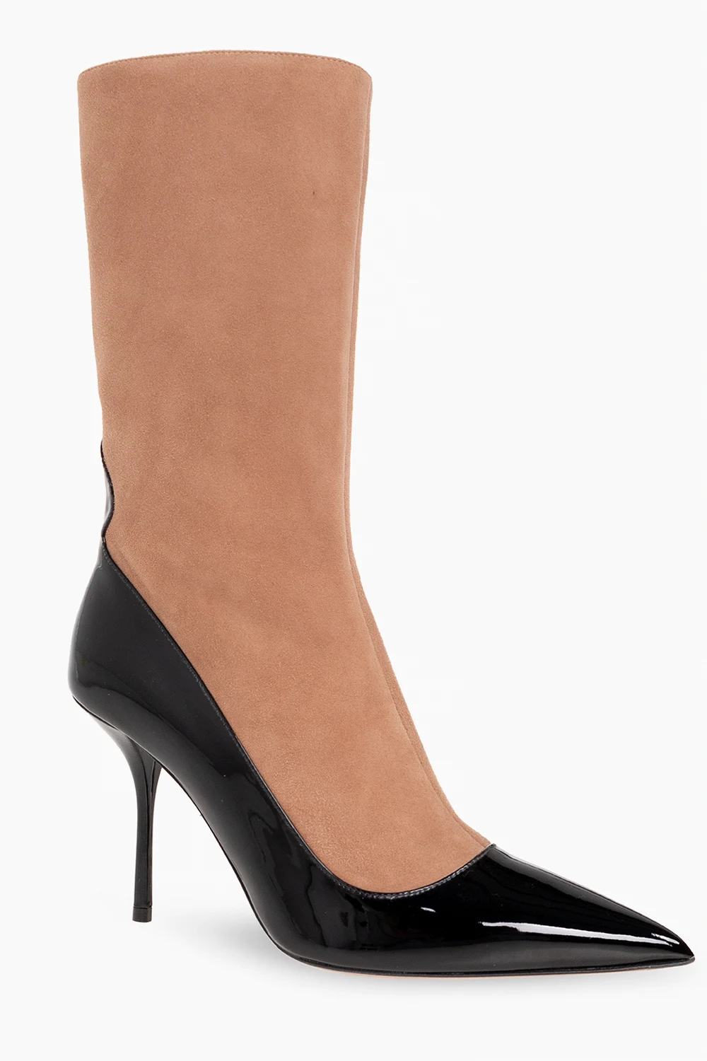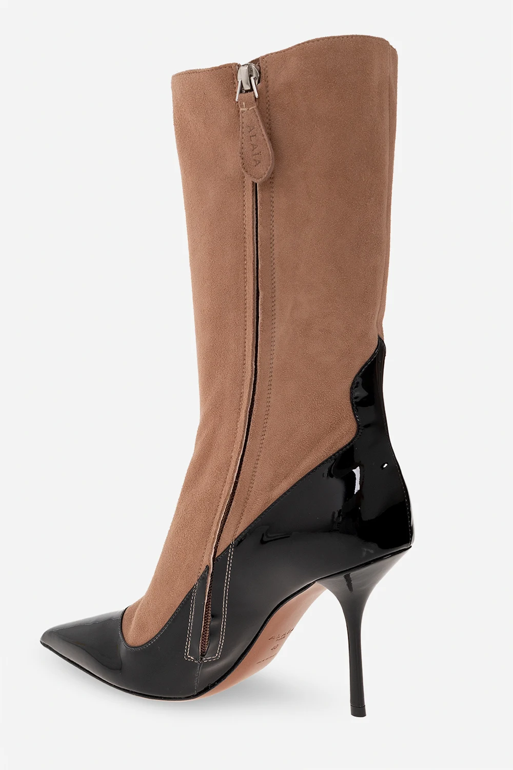 Beżowo-czarne buty na obcasie za kostkę Alaia. Wykonane z zamszu oraz lakierowanej skóry. Po boku zapinane na zamek. Nosek w szpic. Brązowa, skórzana podeszwa wykończona gumą.
