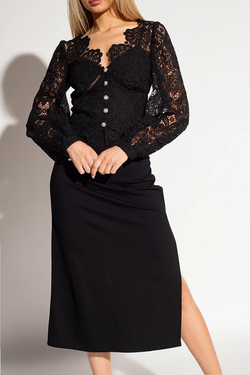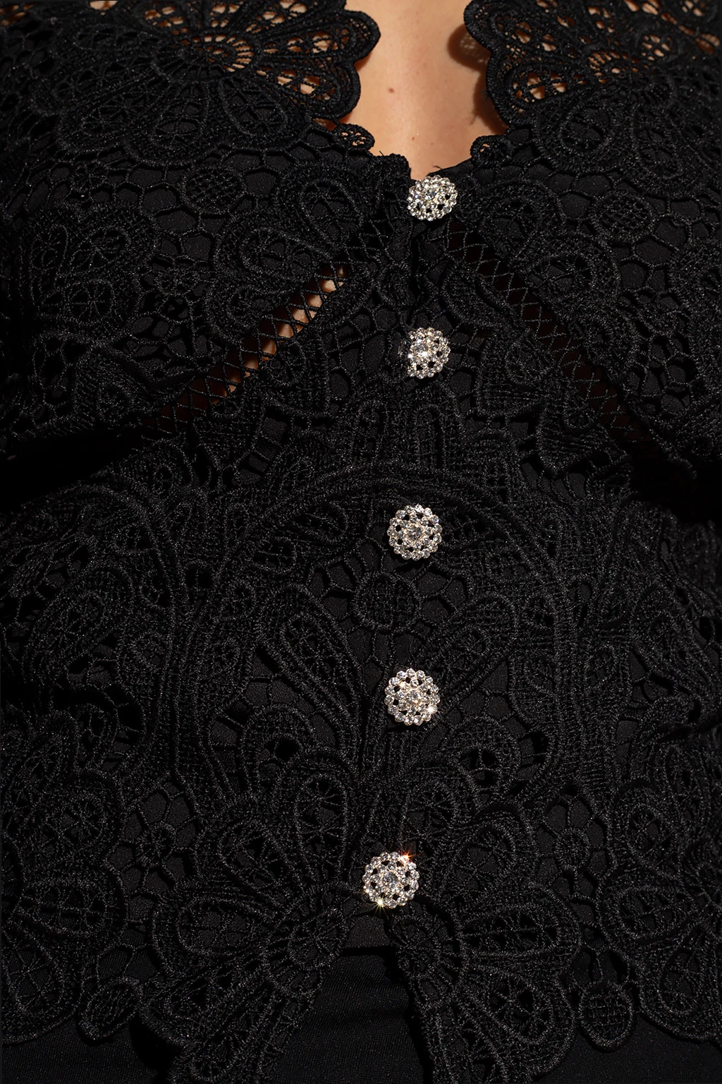 Czarny, ażurowy top Self Portrait. Wykonany z koronki ozdobionej motywem kwiatowym. Zapinana z przodu na dekoracyjne guziki wykończone połyskującymi kryształami. Dopasowany krój, odcinany pod biustem. Dekoracyjnie wykończony dekolt w szpic. Długie, bufiaste rękawy zakończone mankietami zapinanymi guzikiem.