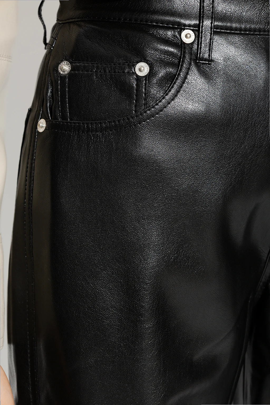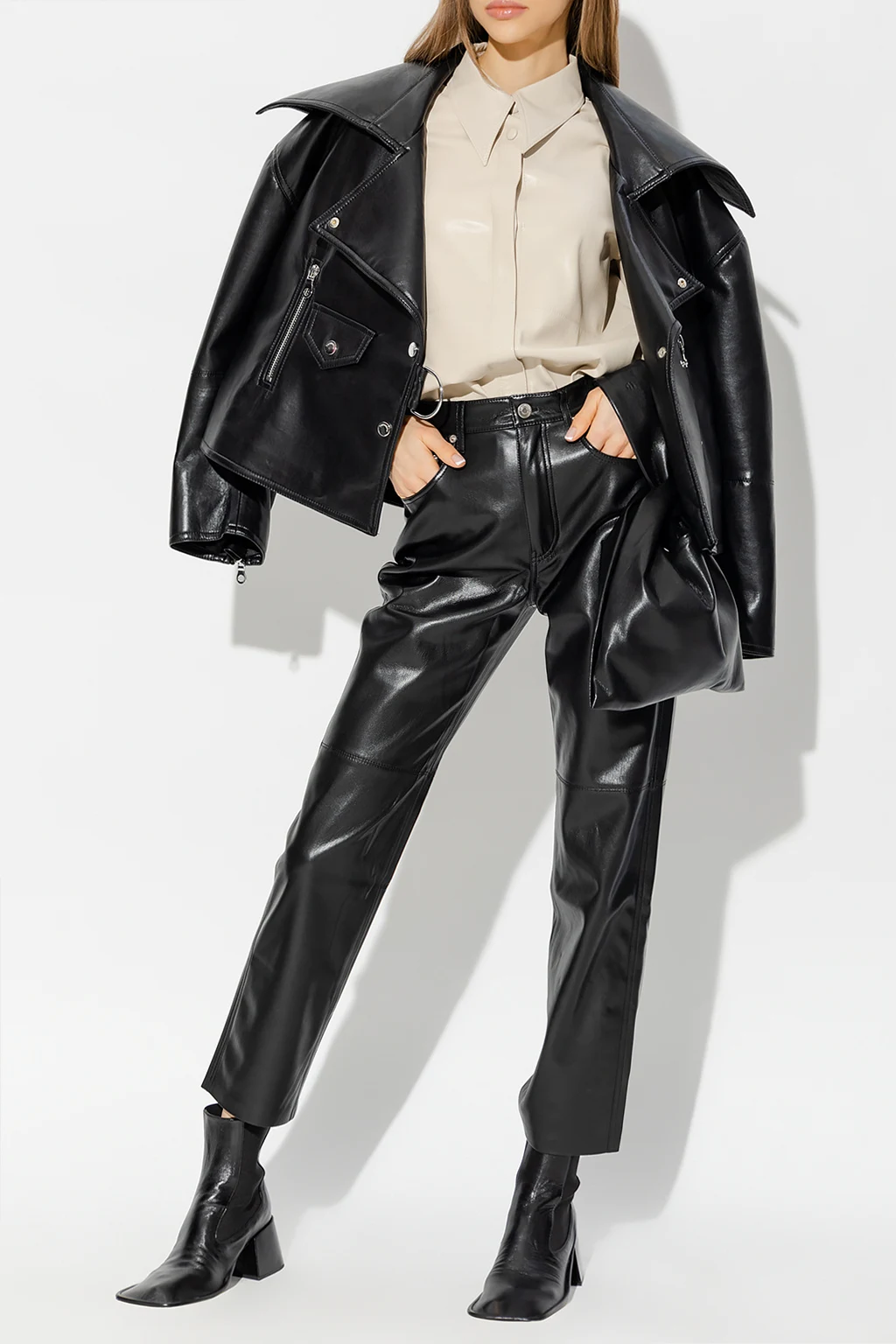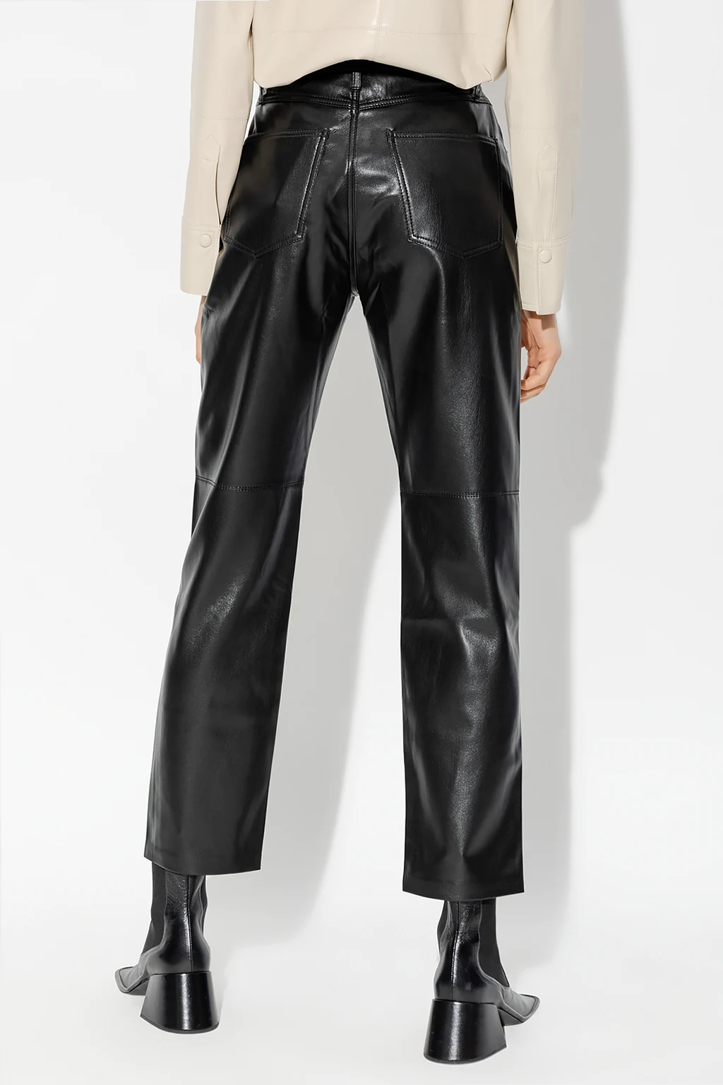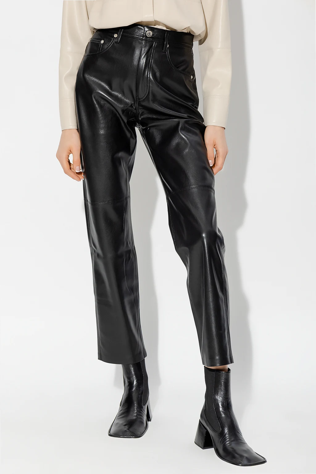 Czarne spodnie, model ‘Vinni’ Nanushka. Wykonane z wegańskiej skóry. Zapinane na zamek oraz guzik. Pięć kieszeni wsuwanych. Lekko zwężane nogawki.