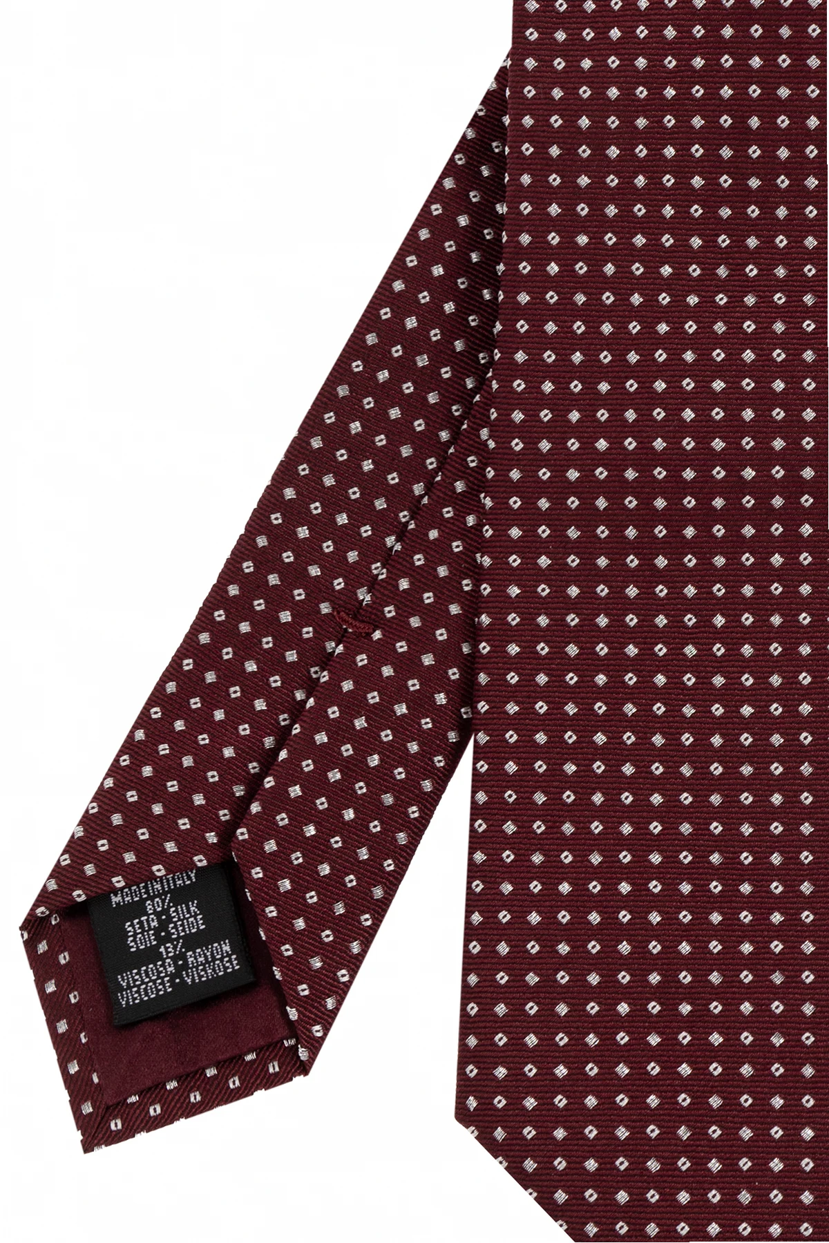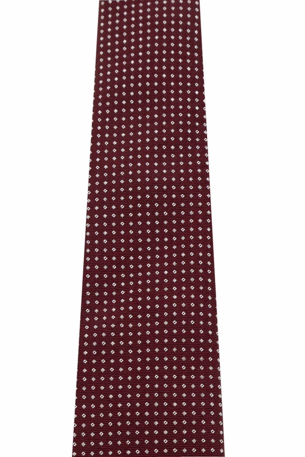 Bordowy krawat Giorgio Armani. Wykonany z jedwabiu. Ozdobiony wzorem wykończonym lureksową nicią w kolorze srebrnym.