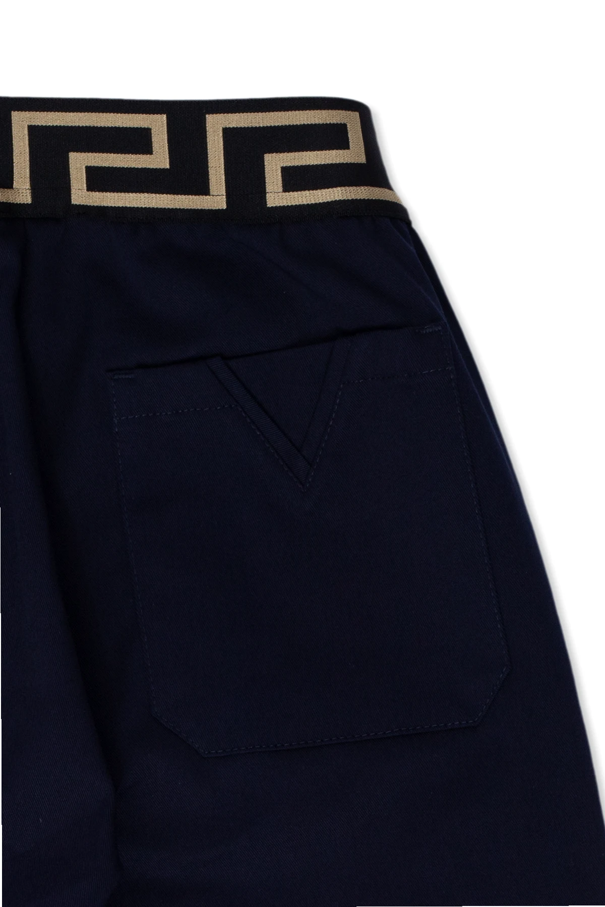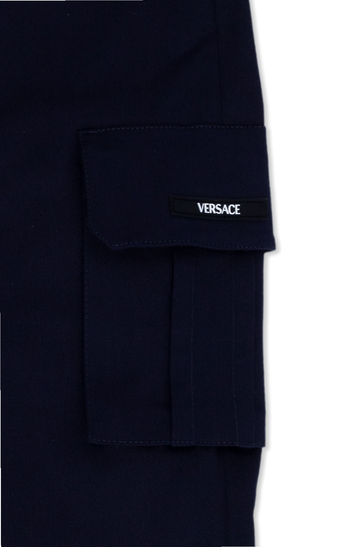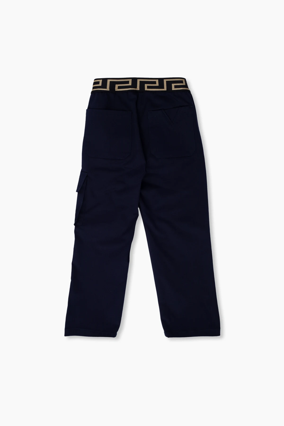 Granatowe, bawełniane spodnie typu ‘cargo’ Versace Kids. W pasie wszyta czarna guma z wyszytym charakterystycznym greckim wzorem w kolorze beżowym. Ozdobione gumową naszywką z logo. Liczne kieszenie. Nogawki o prostym kroju.