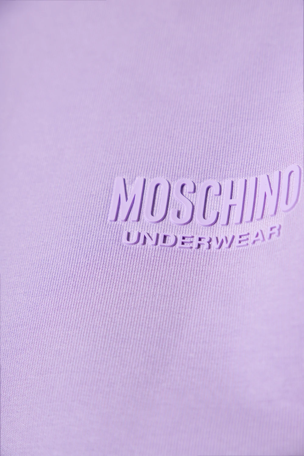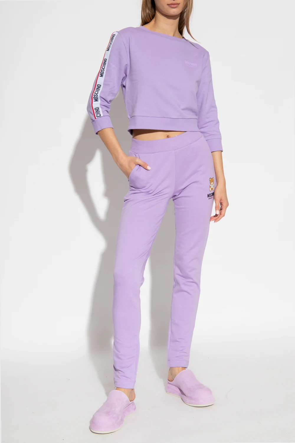 Fioletowa, krótka bluza Moschino, kolekcja ‘Underwear’. Wykonana z bawełny. Na ramionach naszyte paski z logo w kolorze biało-czarno-czerwonym. Z przodu gumowa aplikacja. Okrągły dekolt, rękawy o długości trzy czwarte i dół wykończone ściągaczem.
